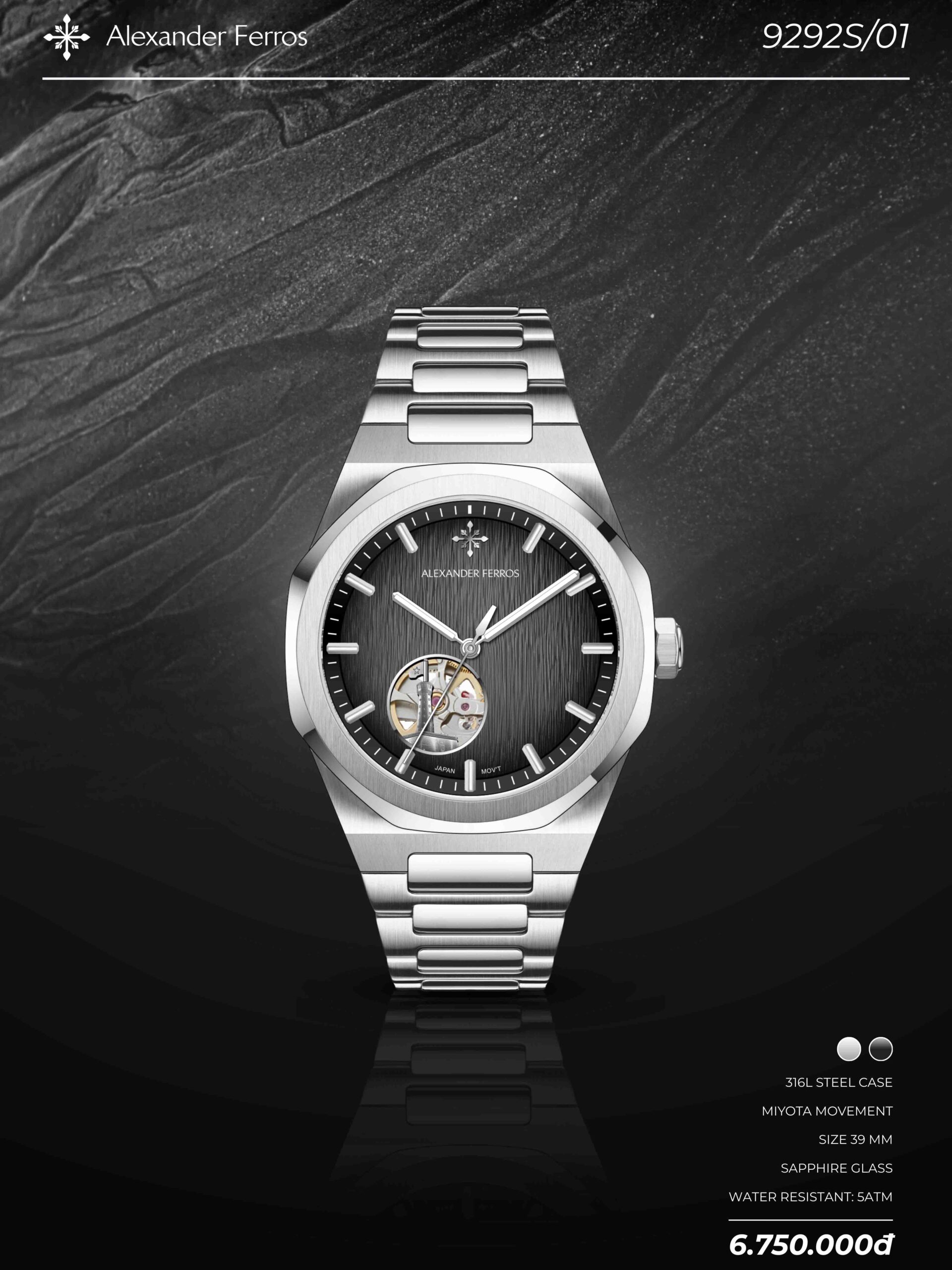 Alexander Ferros 9292S chính là câu trả lời hoàn hảo. Điểm nhấn “đắt giá” nhất nằm ở góc 7h: Thiết kế Open Heart lộ cơ quyến rũ kết hợp cùng hình ảnh Cột cờ Dinh Độc Lập hiên ngang. Một sự giao thoa tuyệt vời giữa kỹ thuật chế tác hiện đại và niềm tự hào bản sắc Việt.