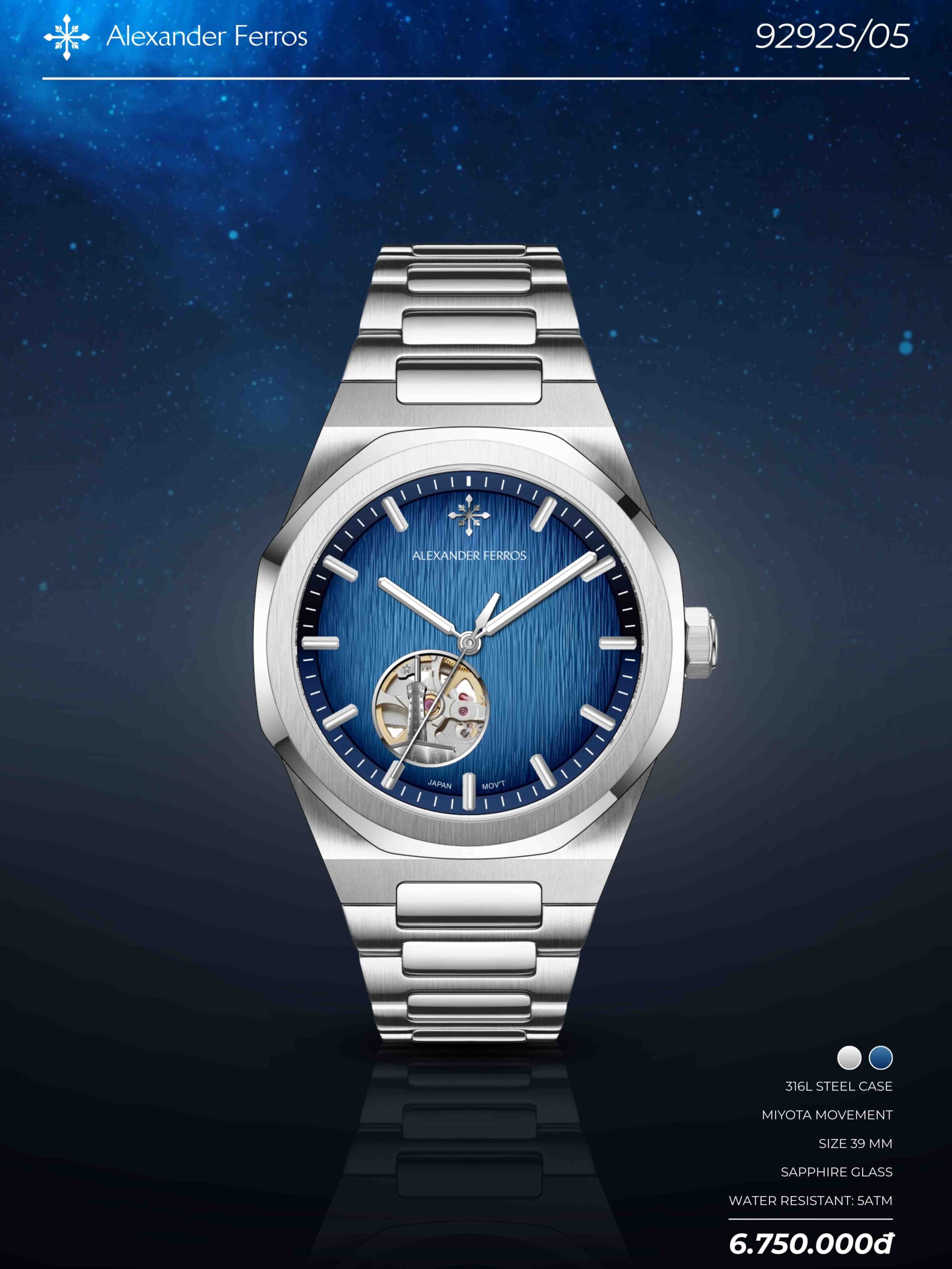 Alexander Ferros 9292S chính là câu trả lời hoàn hảo. Điểm nhấn “đắt giá” nhất nằm ở góc 7h: Thiết kế Open Heart lộ cơ quyến rũ kết hợp cùng hình ảnh Cột cờ Dinh Độc Lập hiên ngang. Một sự giao thoa tuyệt vời giữa kỹ thuật chế tác hiện đại và niềm tự hào bản sắc Việt.