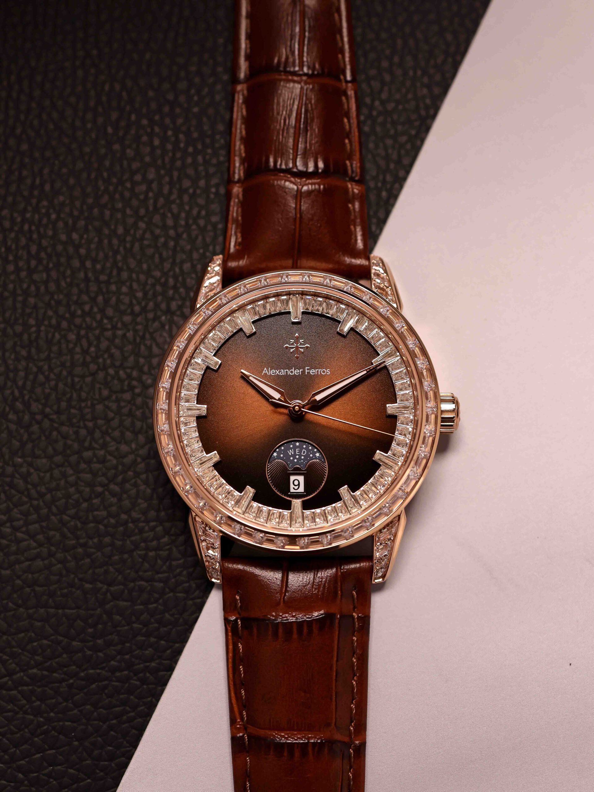 Thiết kế đính đá là điểm nhấn đặc biệt, mặt kính sapphire chống xước, khung vỏ thép không gỉ mạ PVD cao cấp giúp nâng cao độ bền và vẻ sang trọng. Alexander Ferros 9081 không chỉ là công cụ đo thời gian mà còn là biểu tượng của gu thẩm mỹ và đẳng cấp cá nhân, phù hợp trong mọi dịp từ công sở đến sự kiện sang trọng.