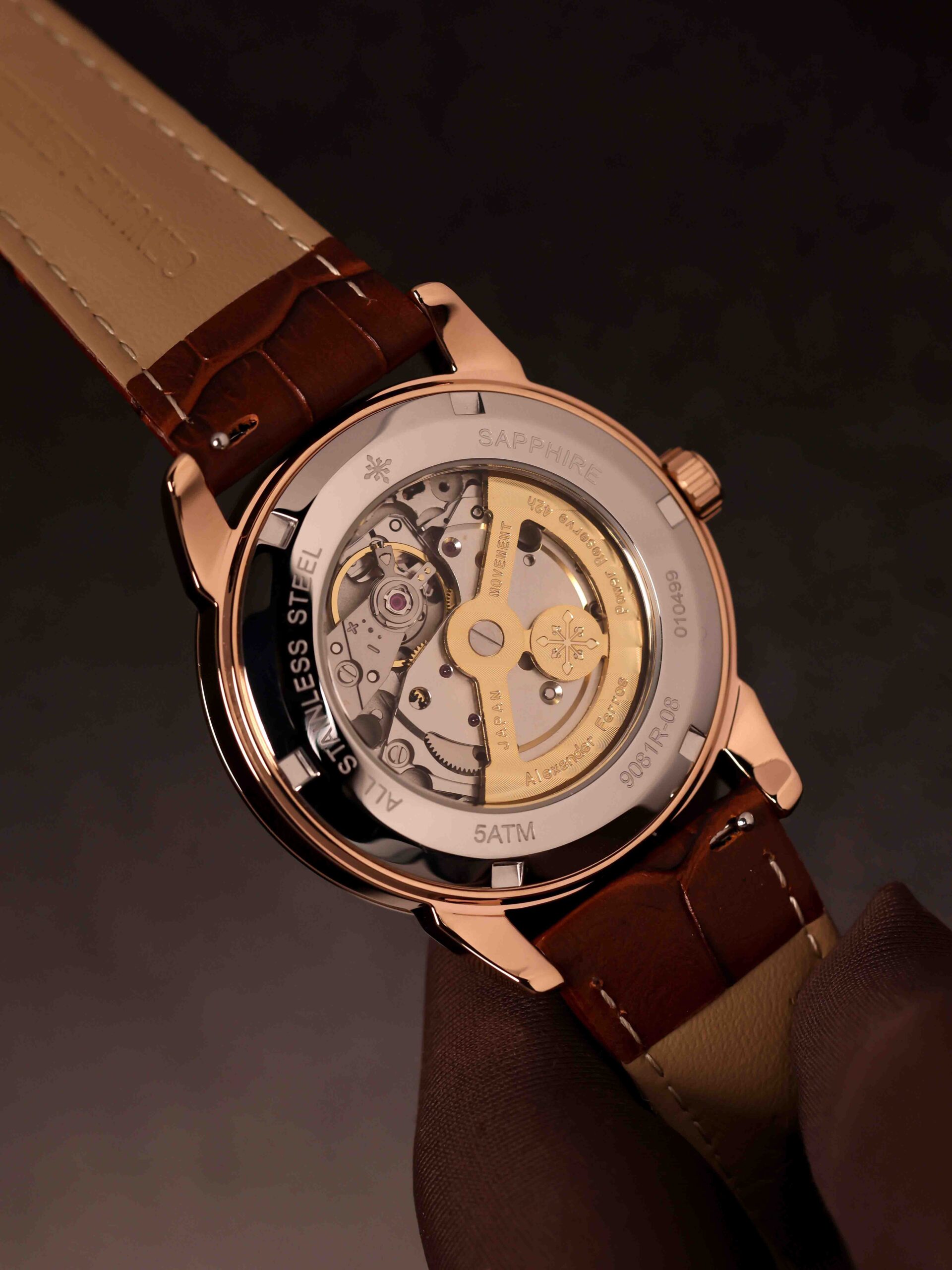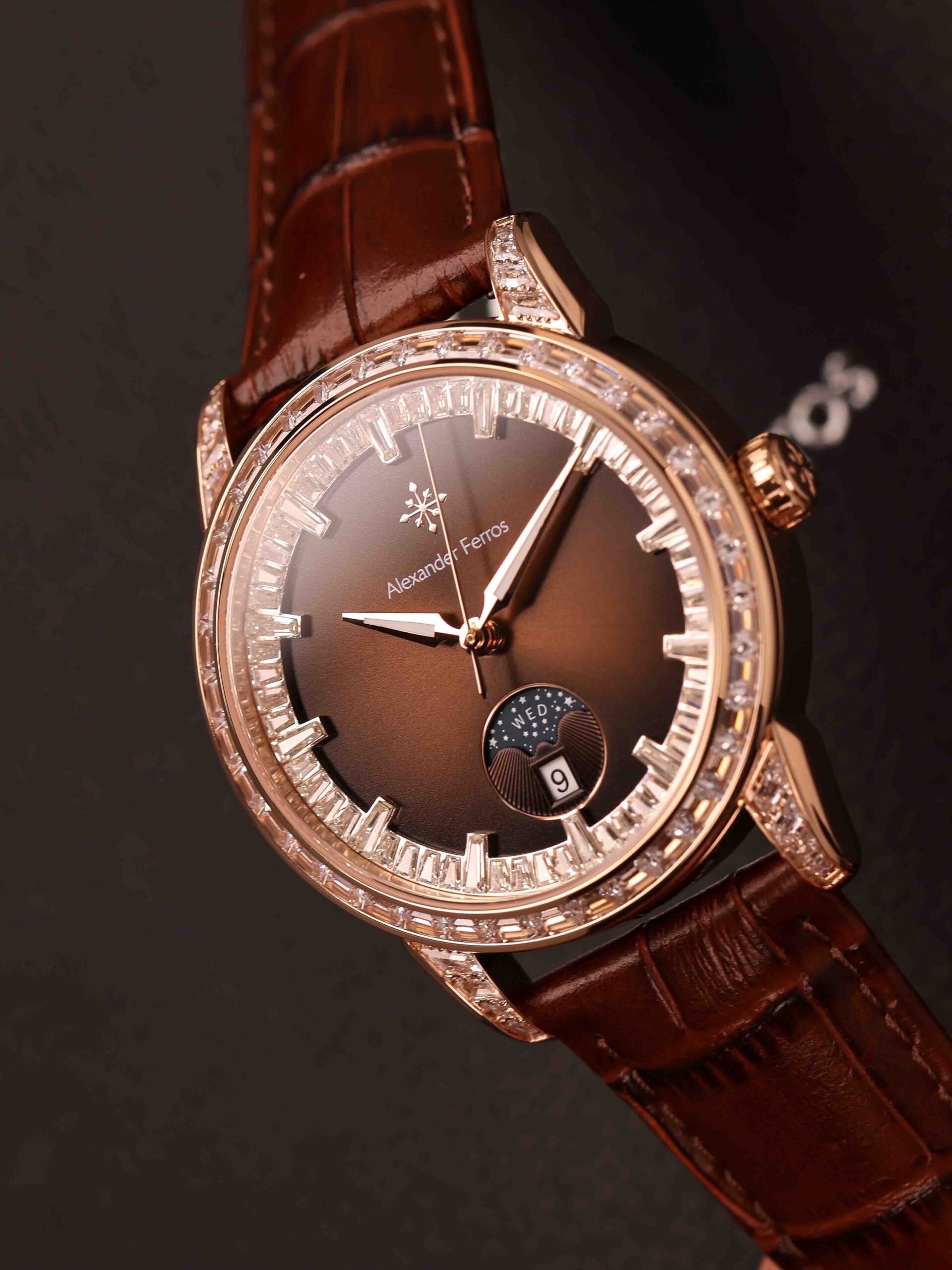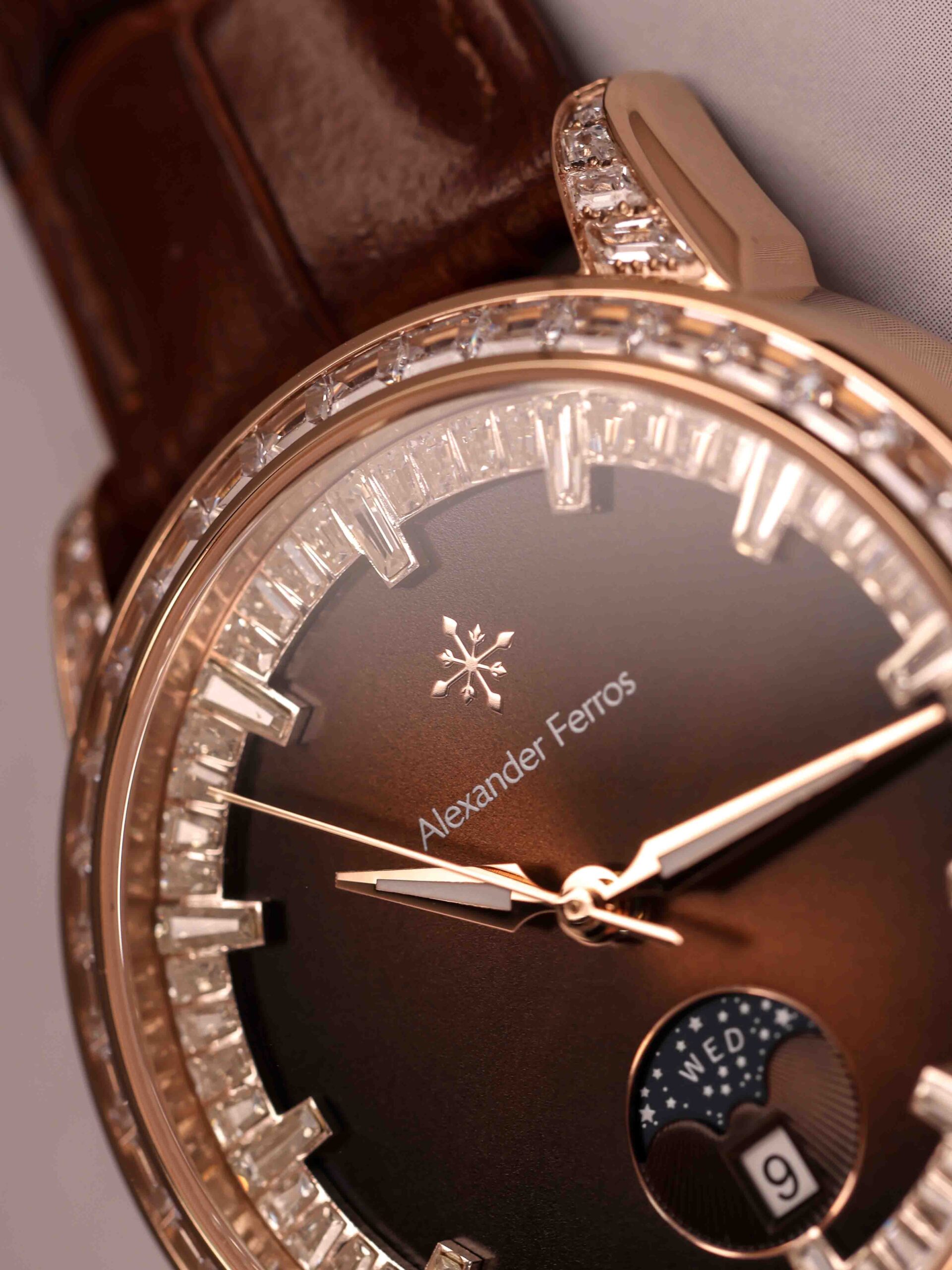 Thiết kế đính đá là điểm nhấn đặc biệt, mặt kính sapphire chống xước, khung vỏ thép không gỉ mạ PVD cao cấp giúp nâng cao độ bền và vẻ sang trọng. Alexander Ferros 9081 không chỉ là công cụ đo thời gian mà còn là biểu tượng của gu thẩm mỹ và đẳng cấp cá nhân, phù hợp trong mọi dịp từ công sở đến sự kiện sang trọng.