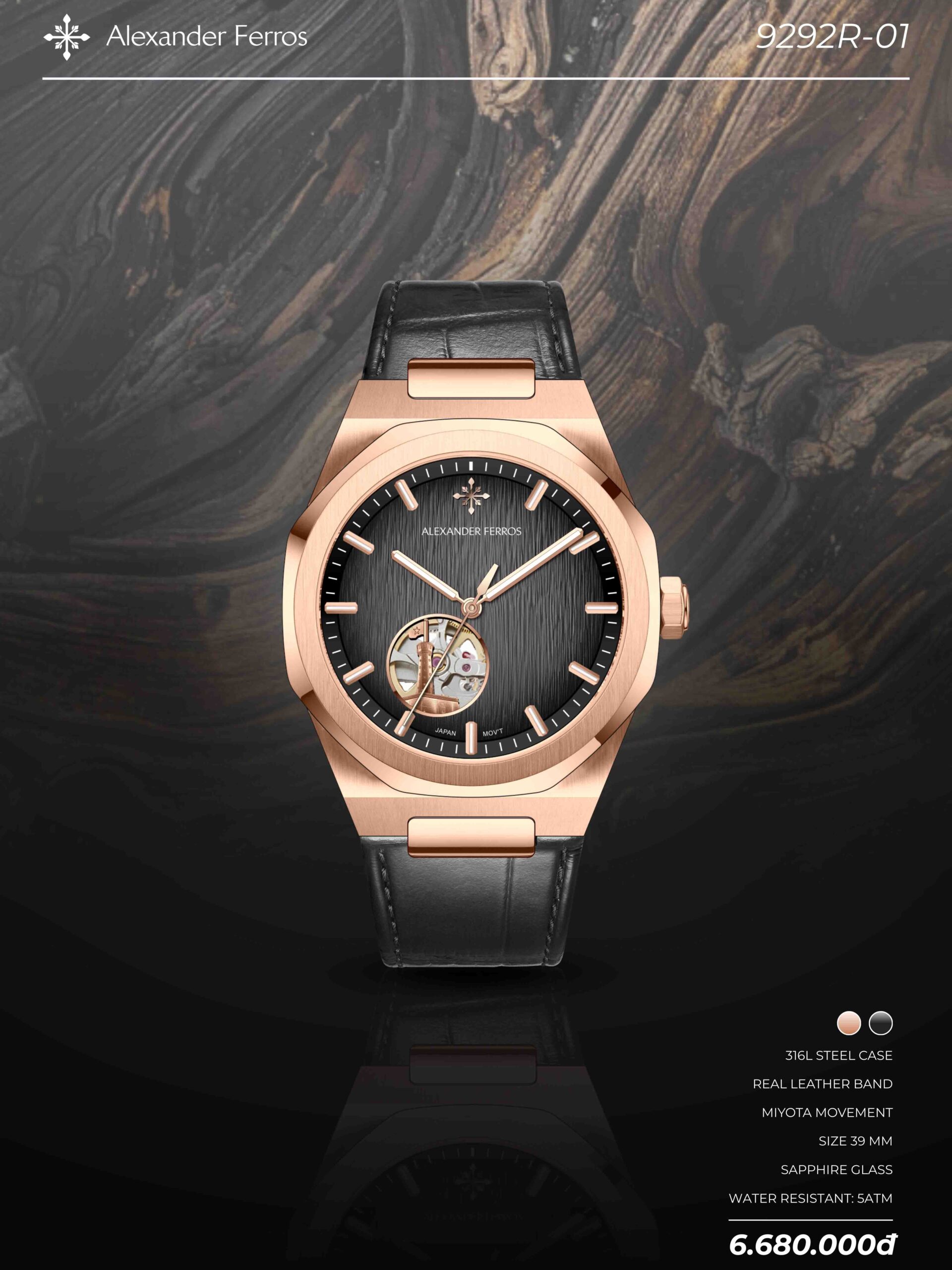là mẫu đồng hồ nam nổi bật với phong cách thể thao lịch lãm và thiết kế hiện đại. Mặt số với nhiều phiên bản màu được trang trí bằng họa tiết vân gỗ độc đáo, kết hợp cùng bộ kim và cọc số dạng vạch phủ dạ quang, giúp dễ dàng quan sát giờ trong điều kiện thiếu sáng. Điểm đặc biệt của mẫu này là thiết kế Open heart góc 7h kết hợp với hình ảnh Cột cờ Dinh Độc Lập mang bản sắc riêng. Vỏ được chế tác từ thép không gỉ cao cấp, mang đến sự bền bỉ và cảm giác chắc chắn khi đeo. Viền bezel cách điệu với các đường cắt góc cạnh, tăng thêm vẻ nam tính và năng động.