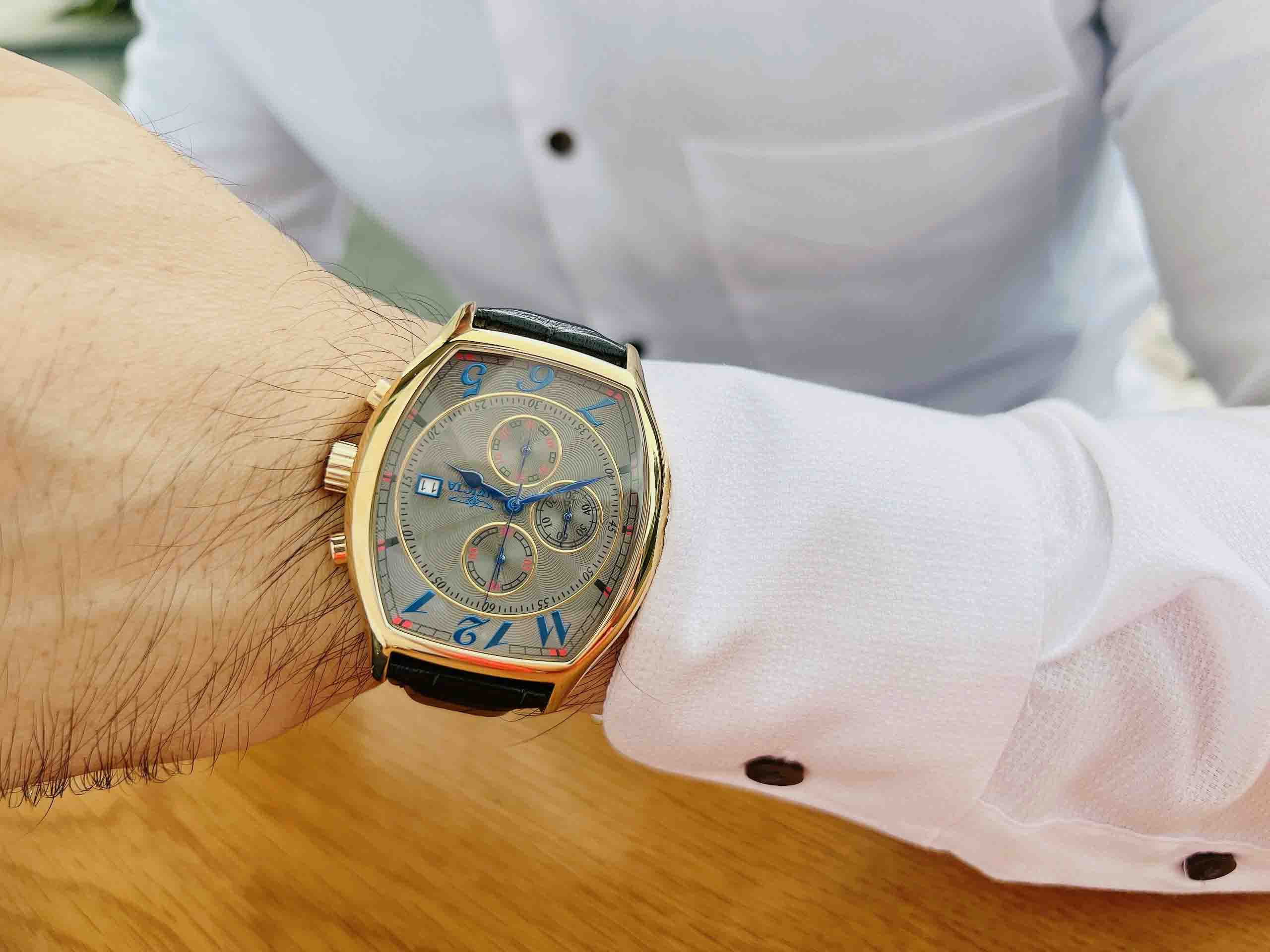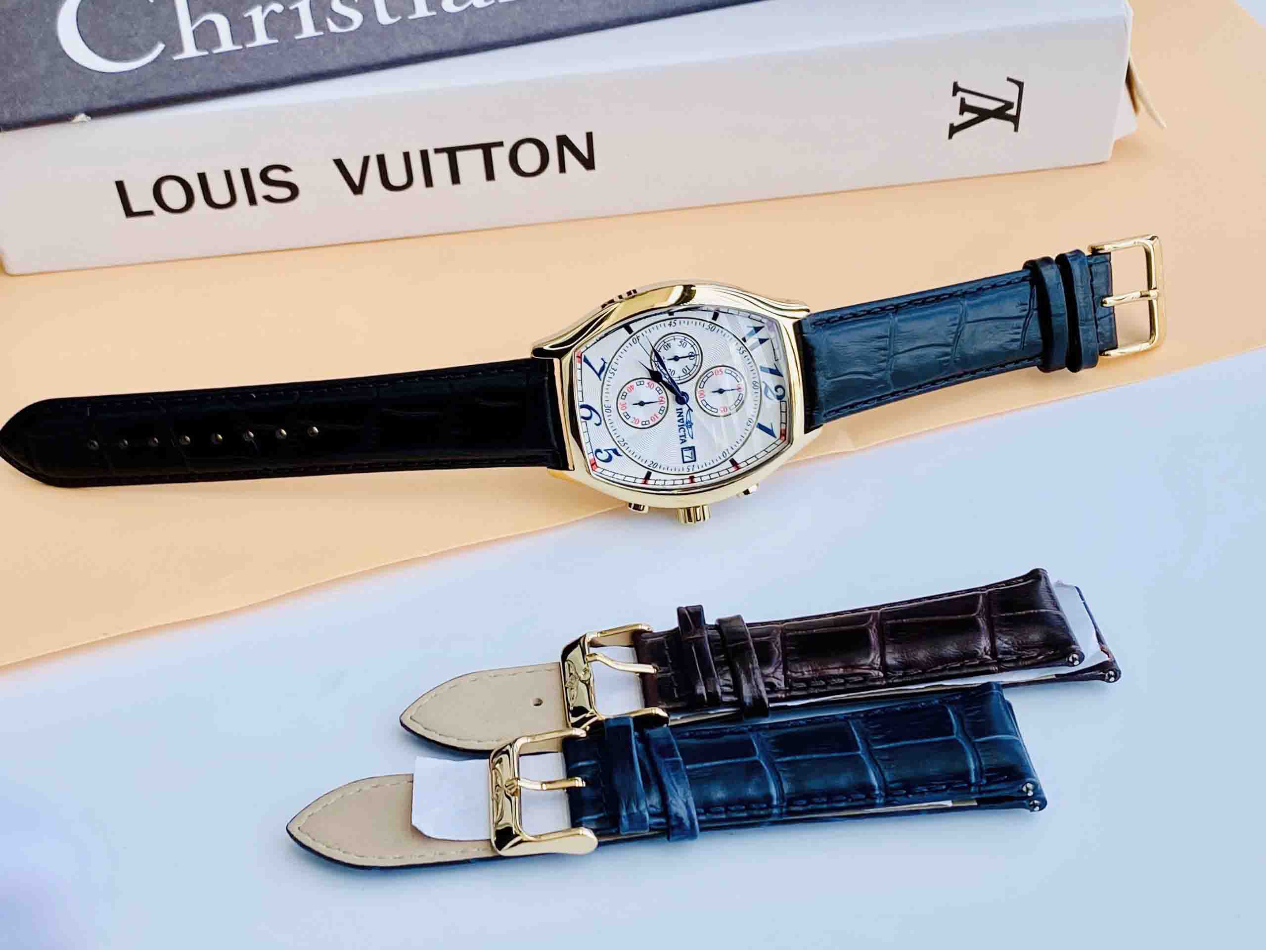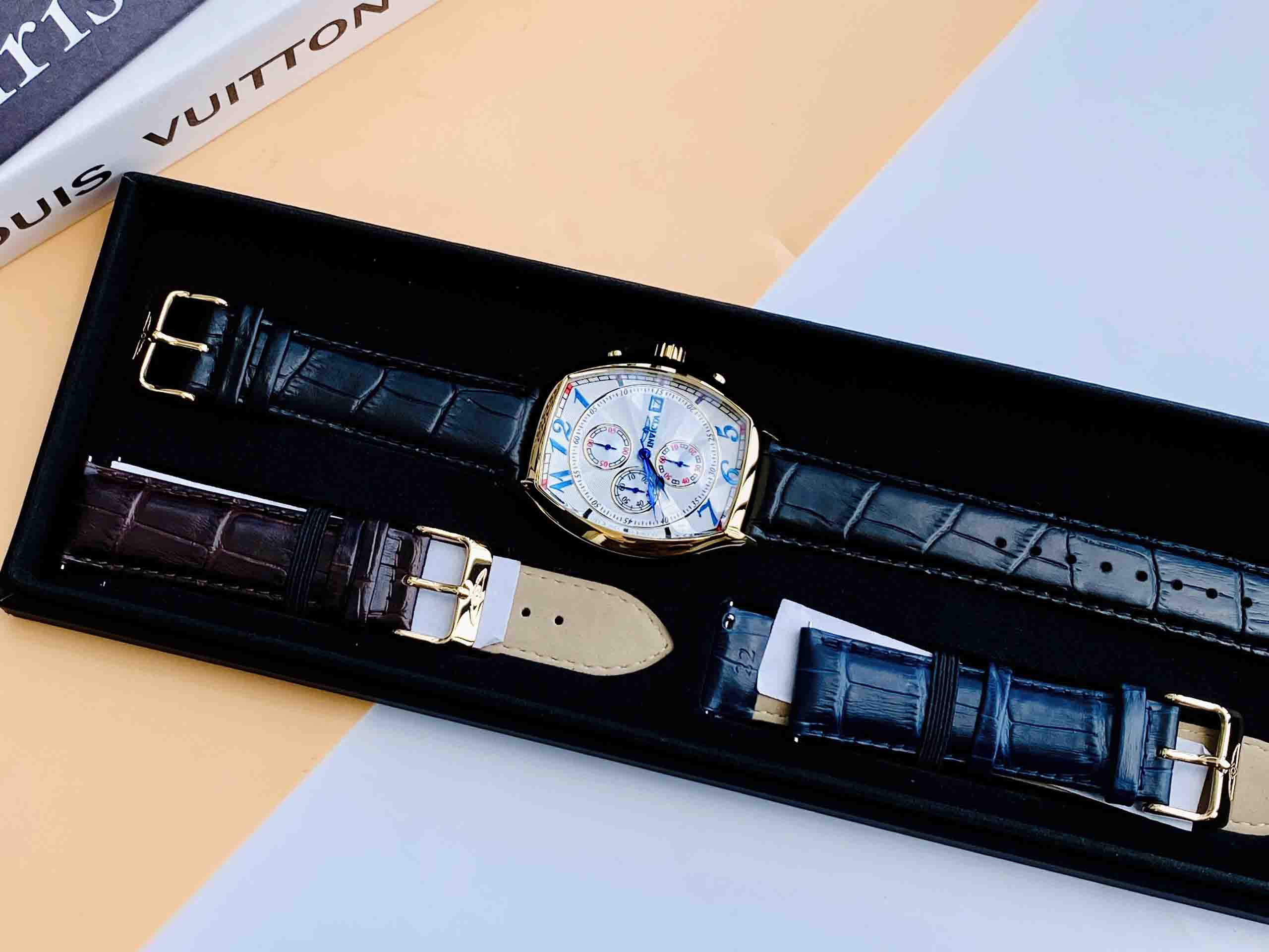 — Thiết kế dáng chữ nhật hiện đại siêu hot , Mặt số màu trắng với kim kiểu chiếc lá màu đen cùng các vạch chỉ giờ độc đáo , chức năng chronograph tiện dụng , đi kèm theo hai dây riêng thay thế .