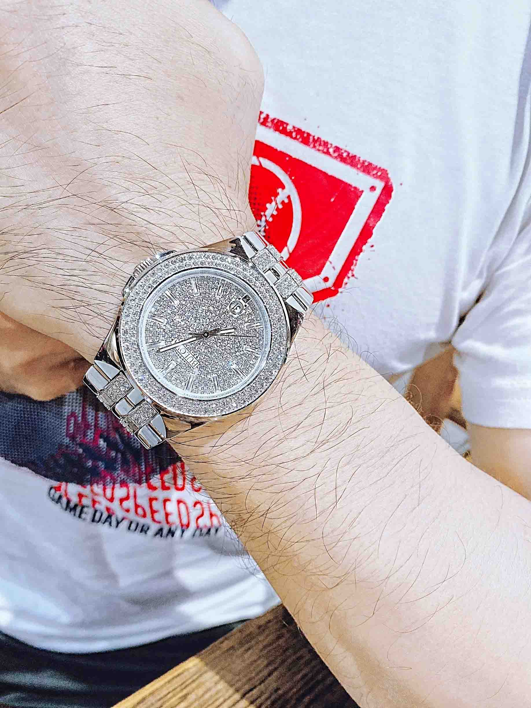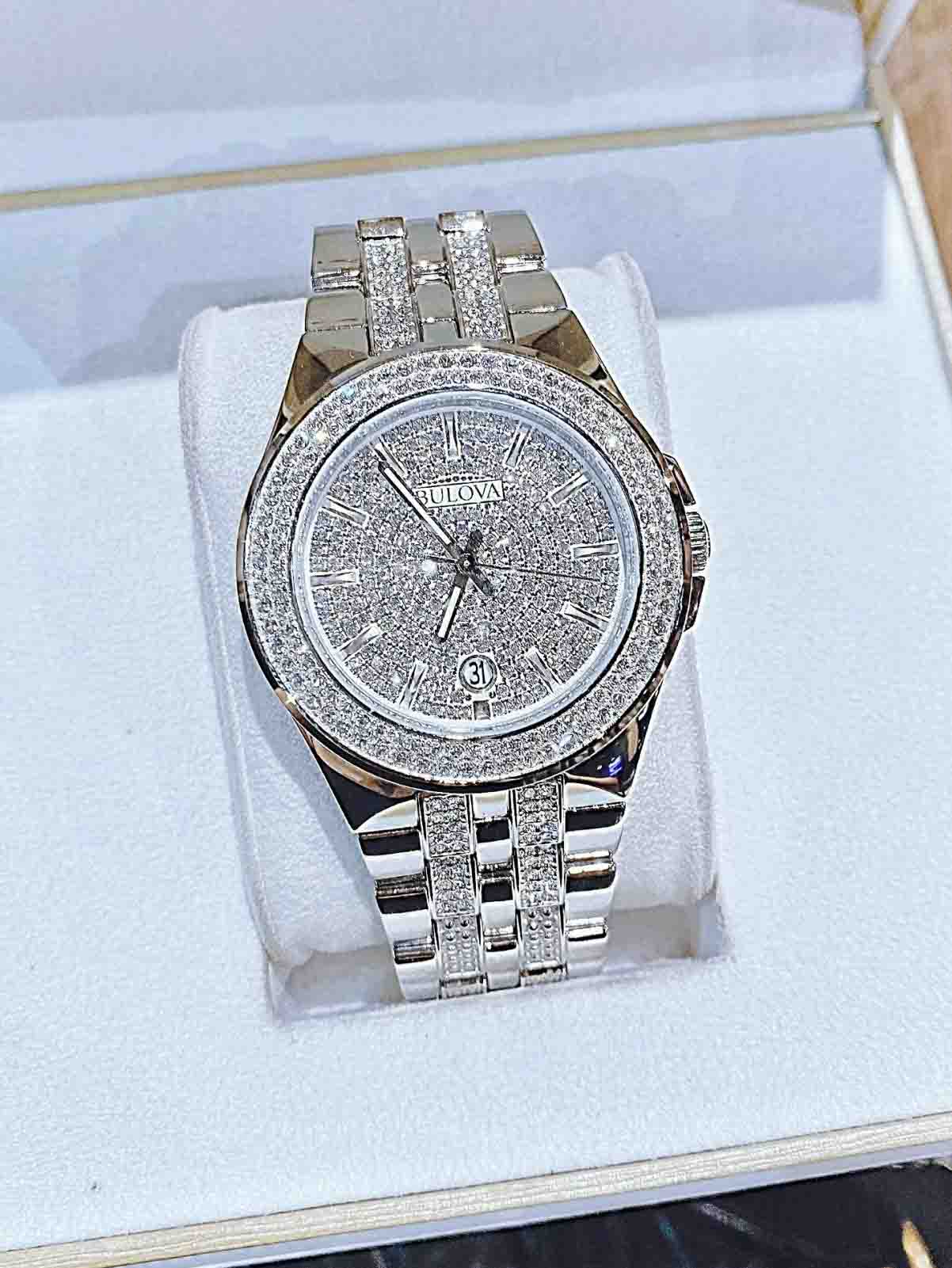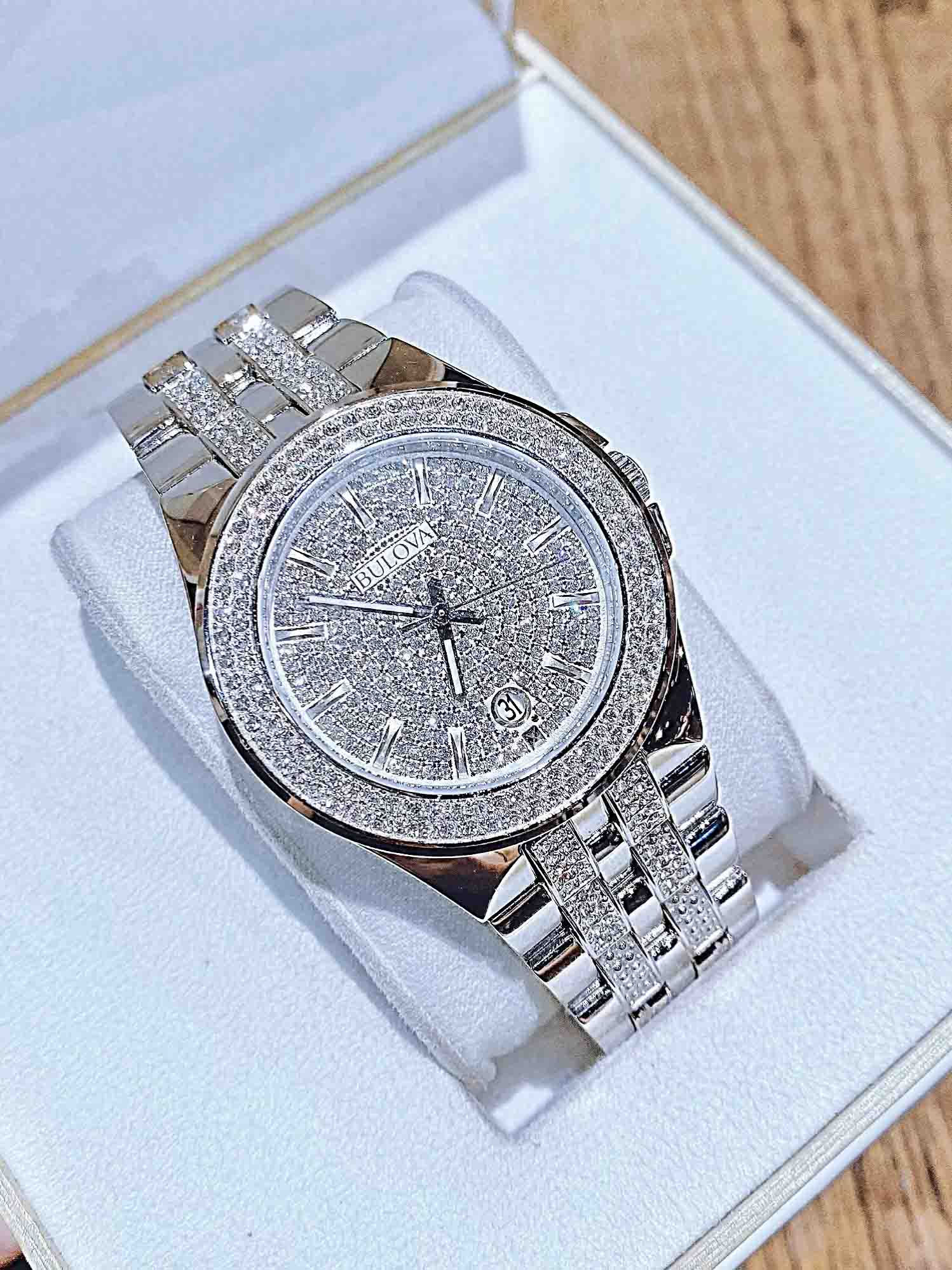 Có mặt số thiết kế độc đáo khi viên pha lê Swarovski bao phủ toàn bộ, dây đeo kim loại chắc chắn, còn có ô lịch ngày vị trí 6h, tạo nên phụ kiện thời trang sang trọng, lịch lãm dành cho phái mạnh.