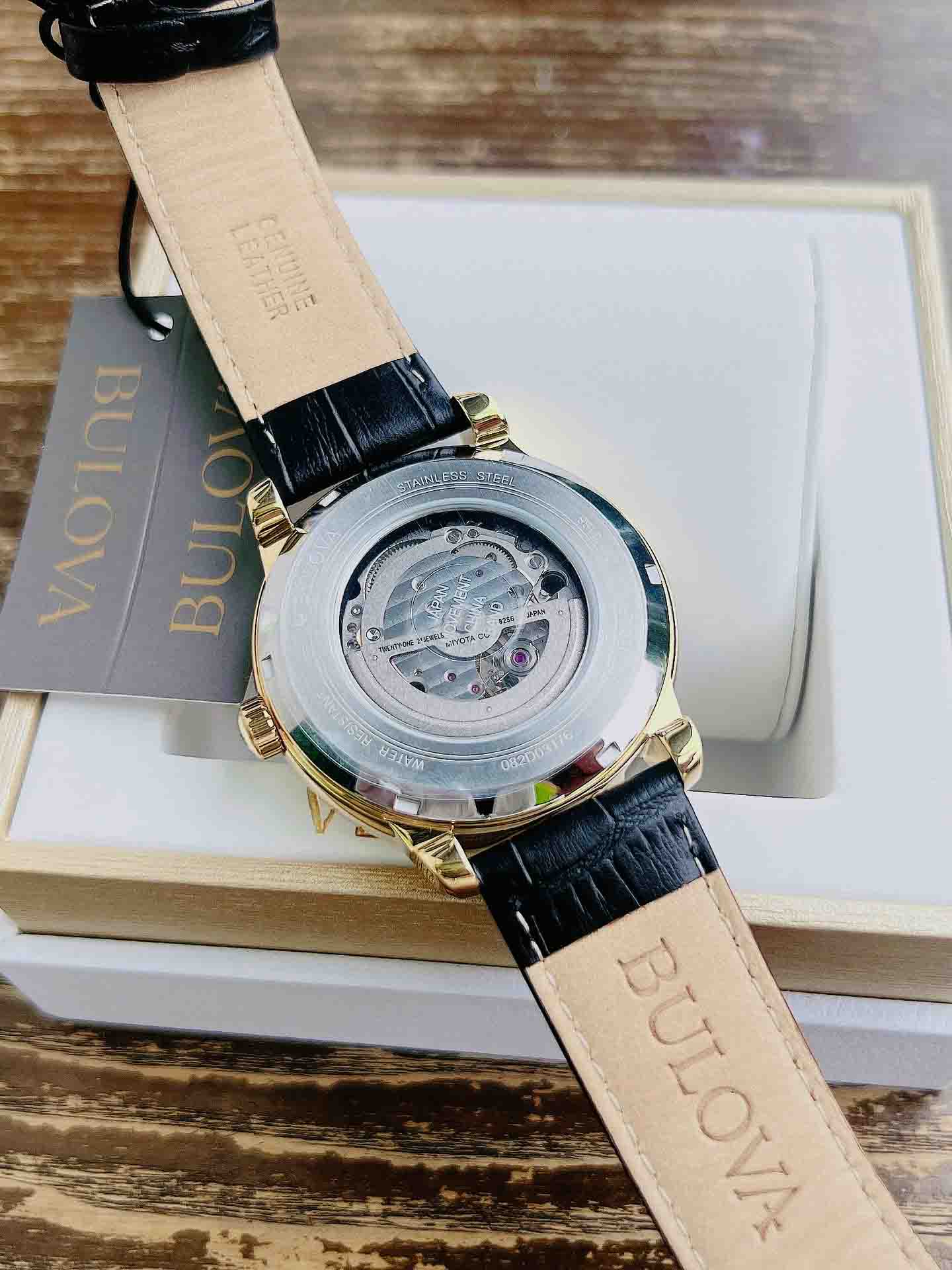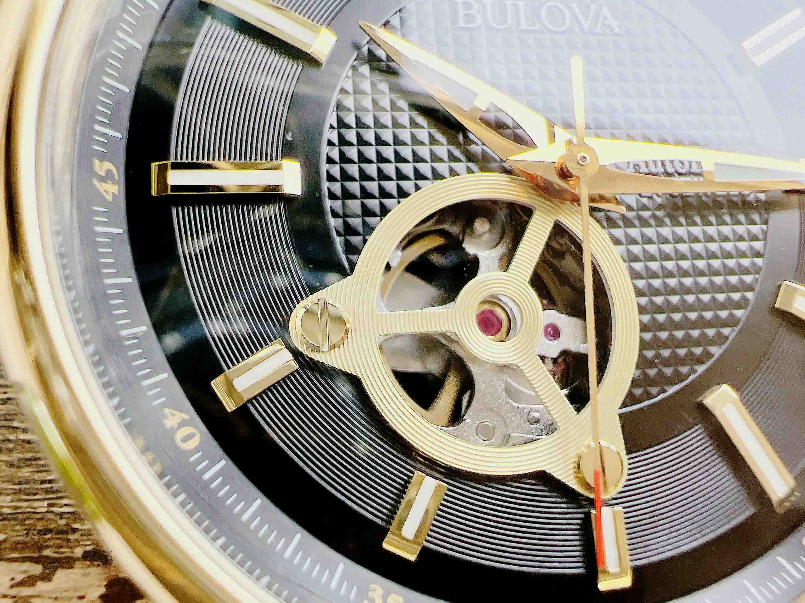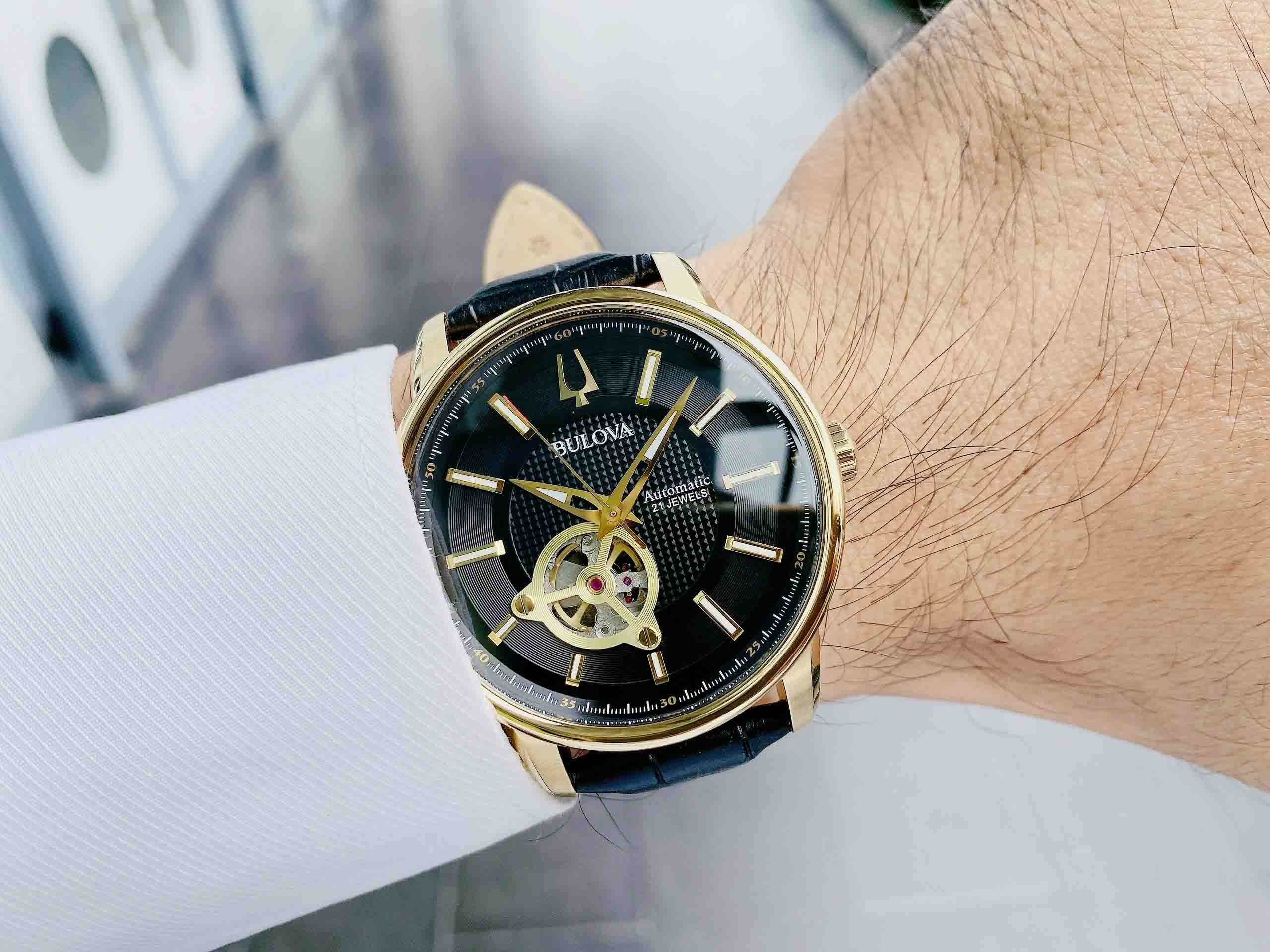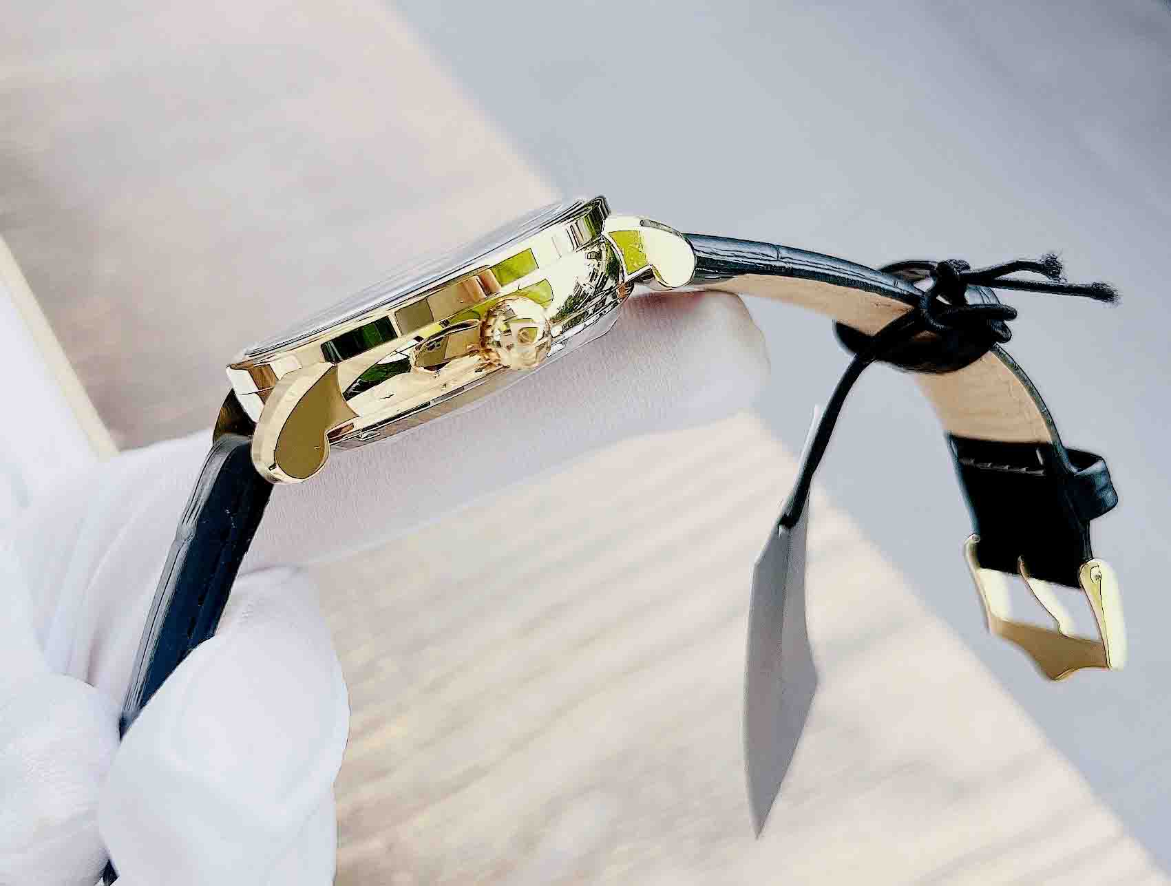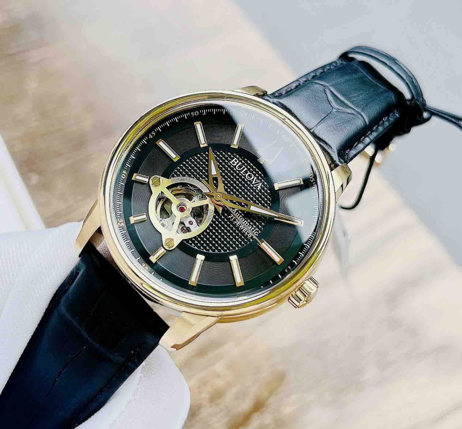 Mặt đồng hồ màu đen tinh xảo, kim phút và kim giờ được làm thon một cách tinh tế.