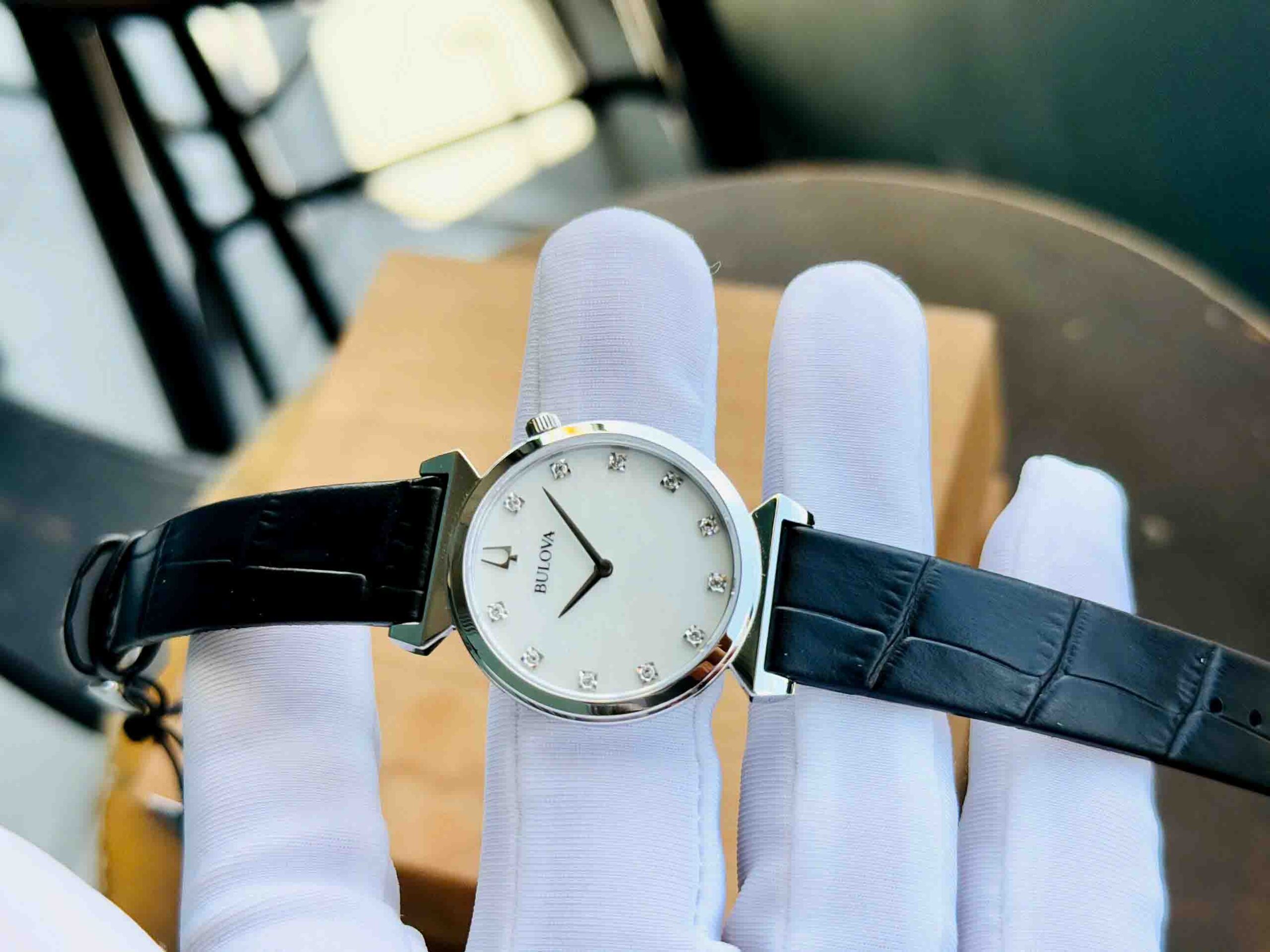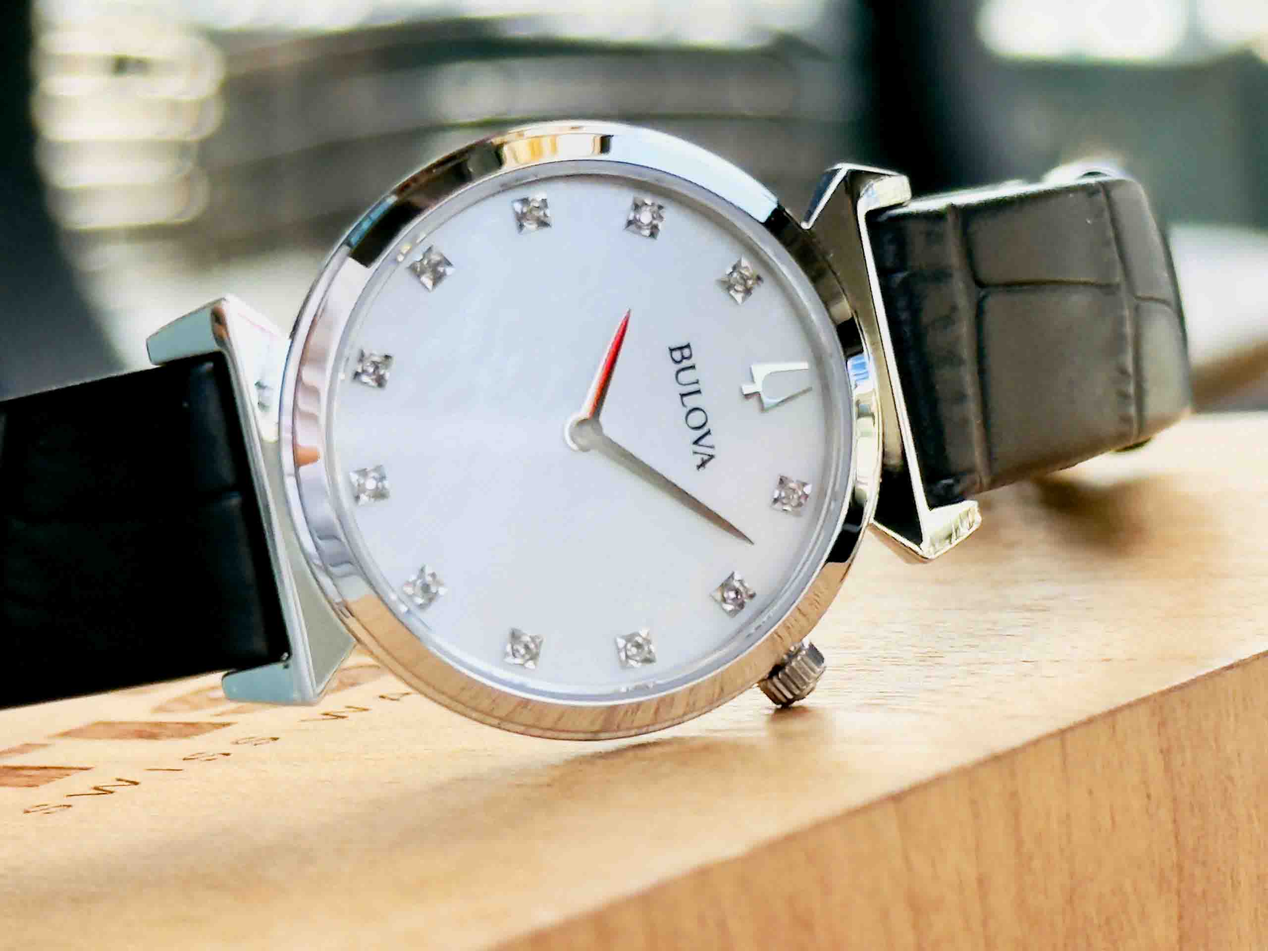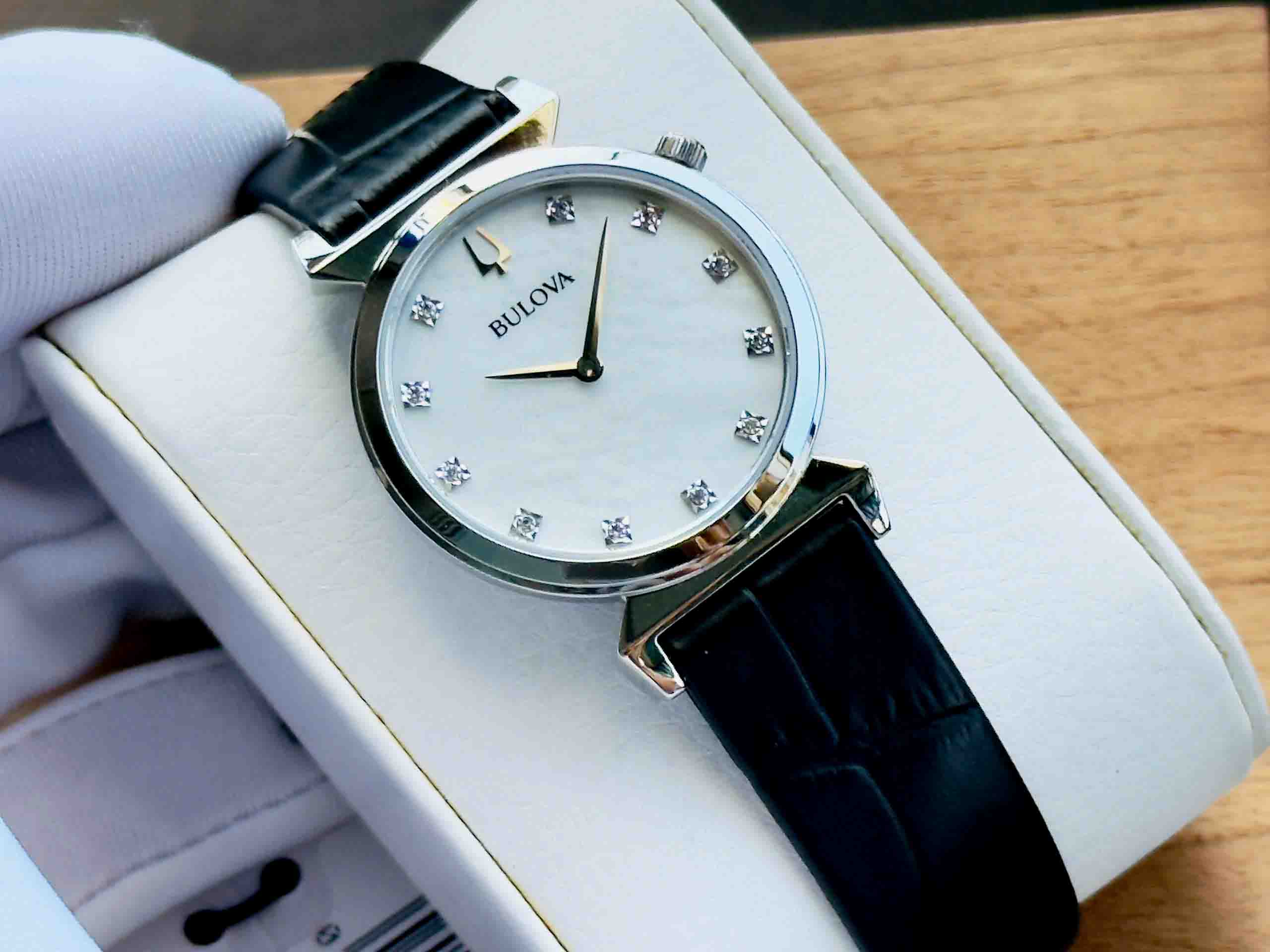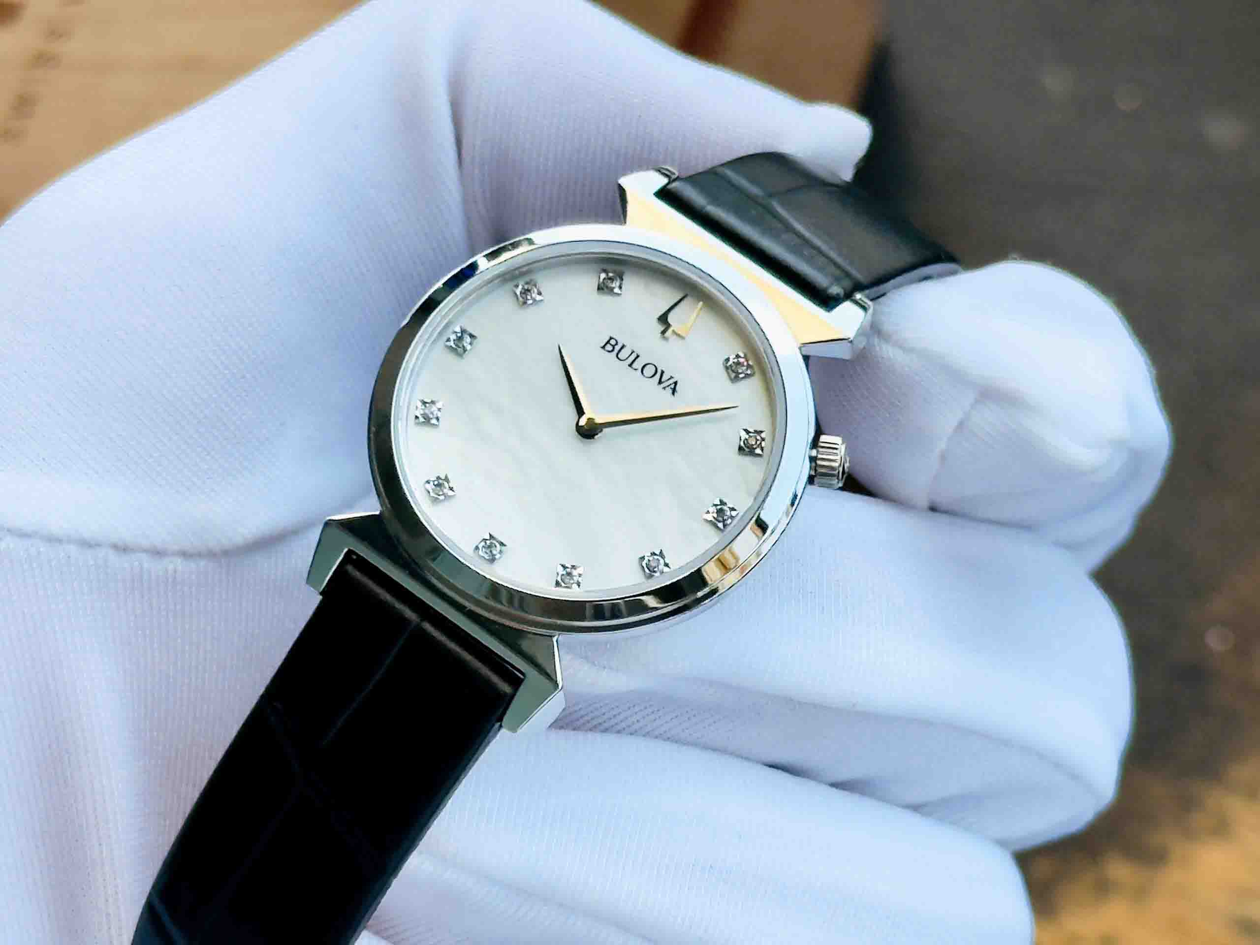 – Kim và vạch số được đính 11 viên diamond nổi bật trên nền mặt xà cừ sang trọng