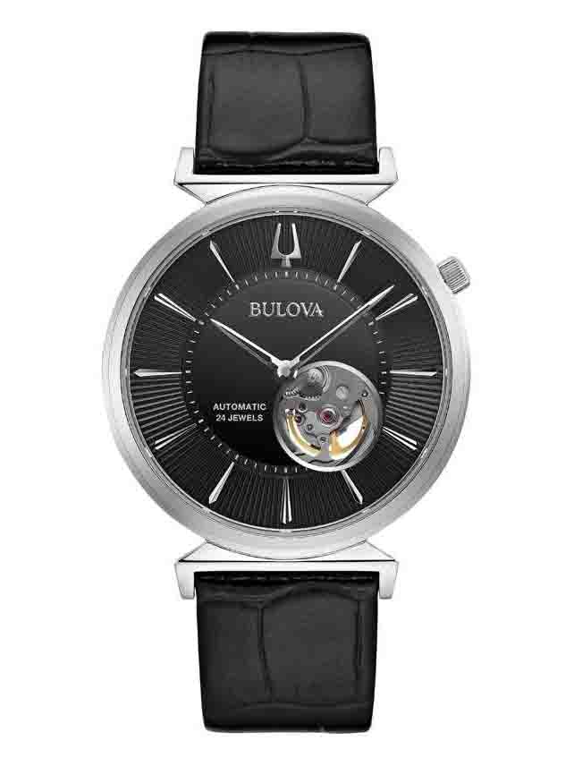 Bulova Regatta Automatic Black Dial Leather Strap Men’s Watch 96A234 Thiết kế dây da đen chính hãng, viền bạc sáng bóng và hở tim nhìn rất cuốn hút trên mặt số.