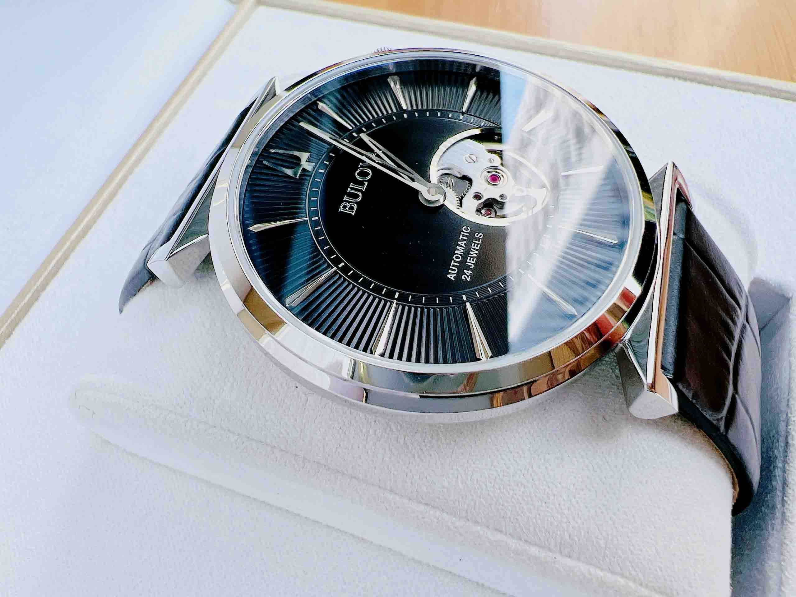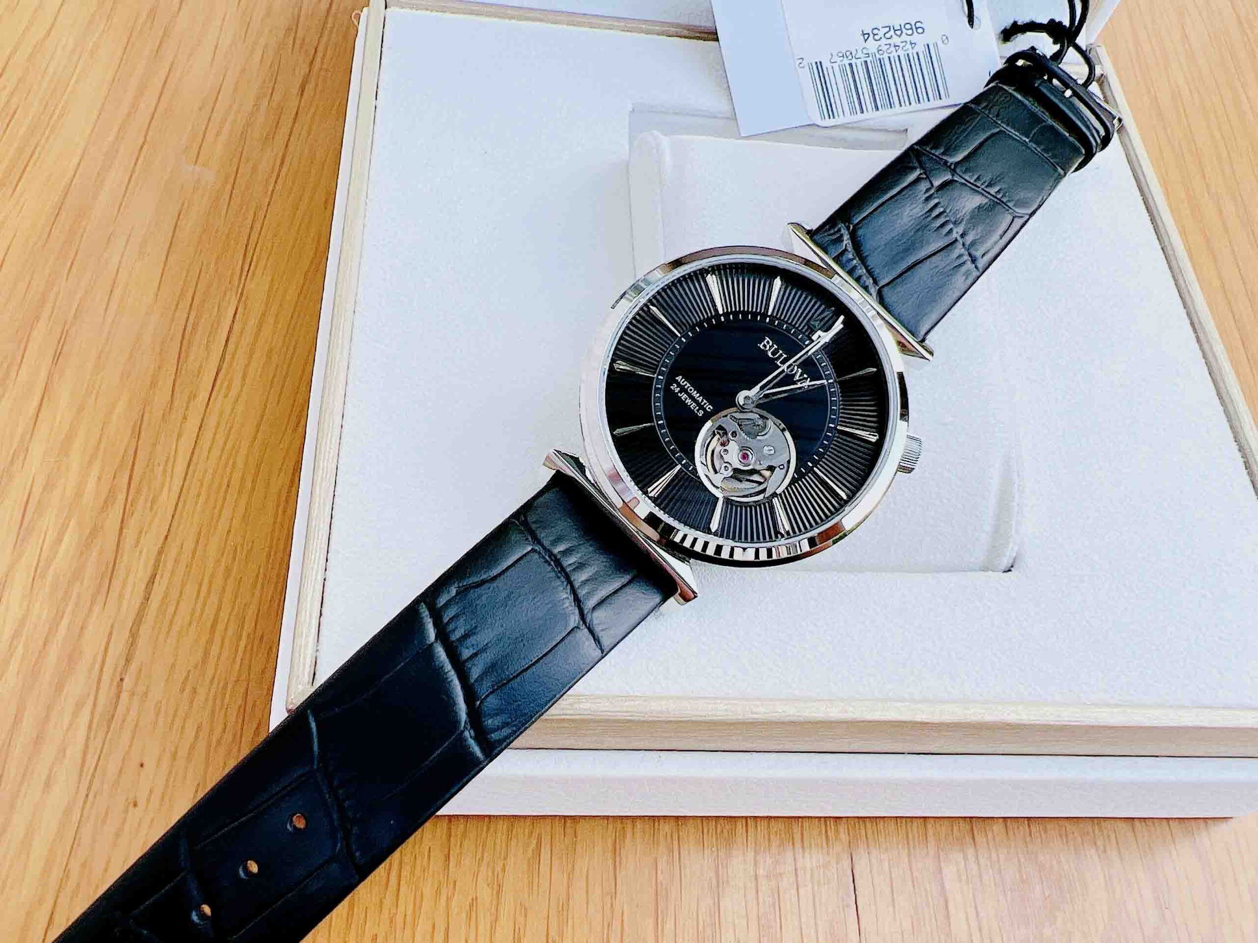 Bulova Regatta Automatic Black Dial Leather Strap Men’s Watch 96A234 Thiết kế dây da đen chính hãng, viền bạc sáng bóng và hở tim nhìn rất cuốn hút trên mặt số.