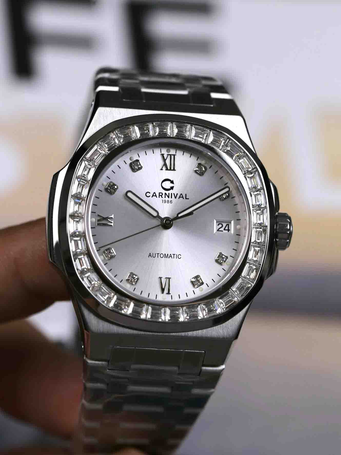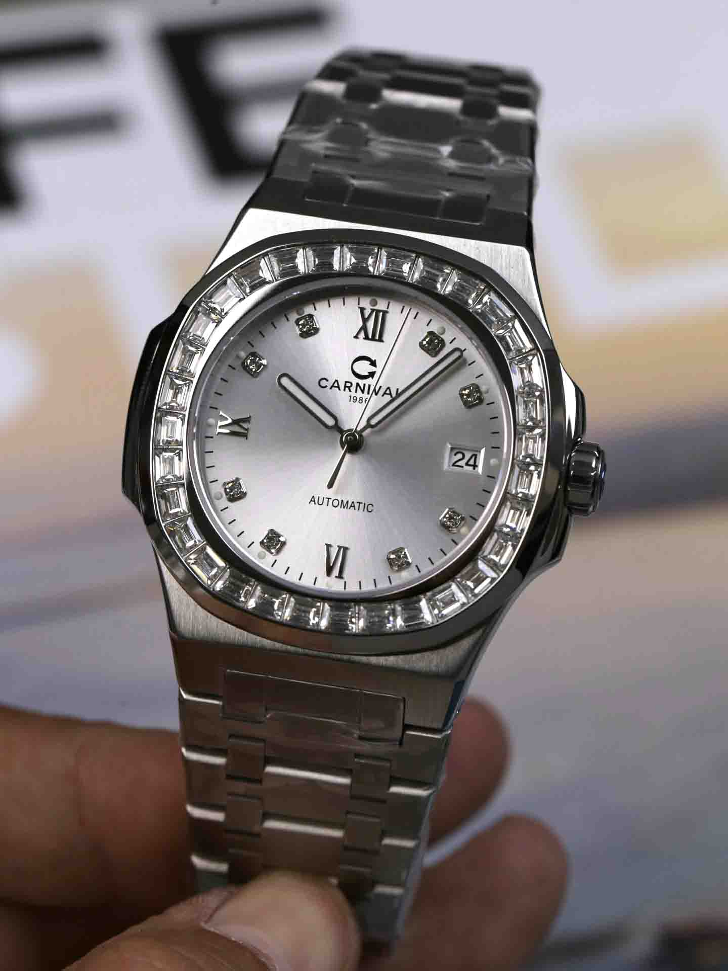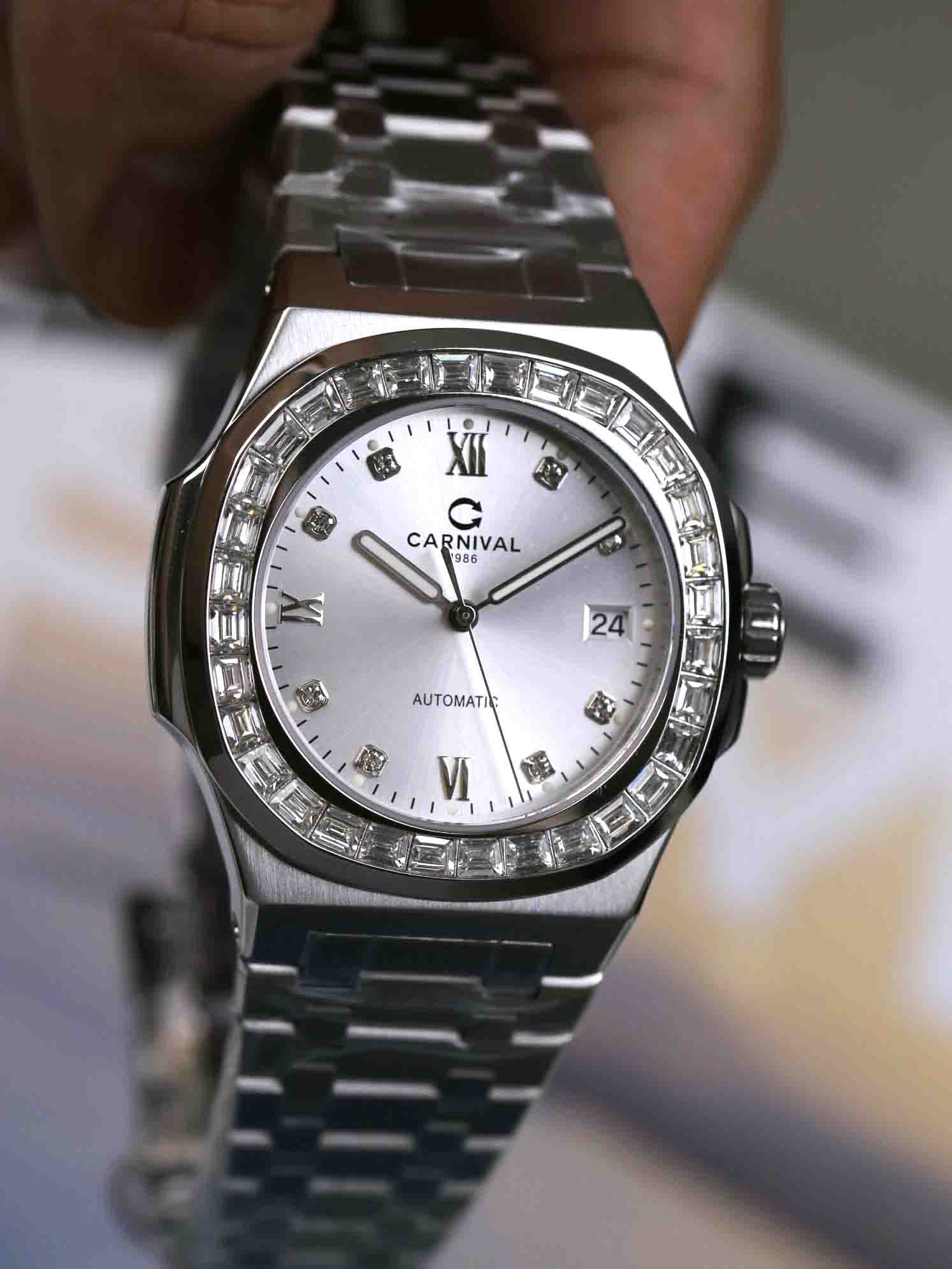 Nằm trong BST với phom dáng Nautilus nhà Carnival đã một lần nữa khẳng định được sức hút vượt thời gian của dòng sản phẩm mới 8129G Dial mới với cọc số và viền đính đá sáng bóng, mặt trải tia cực đẹp