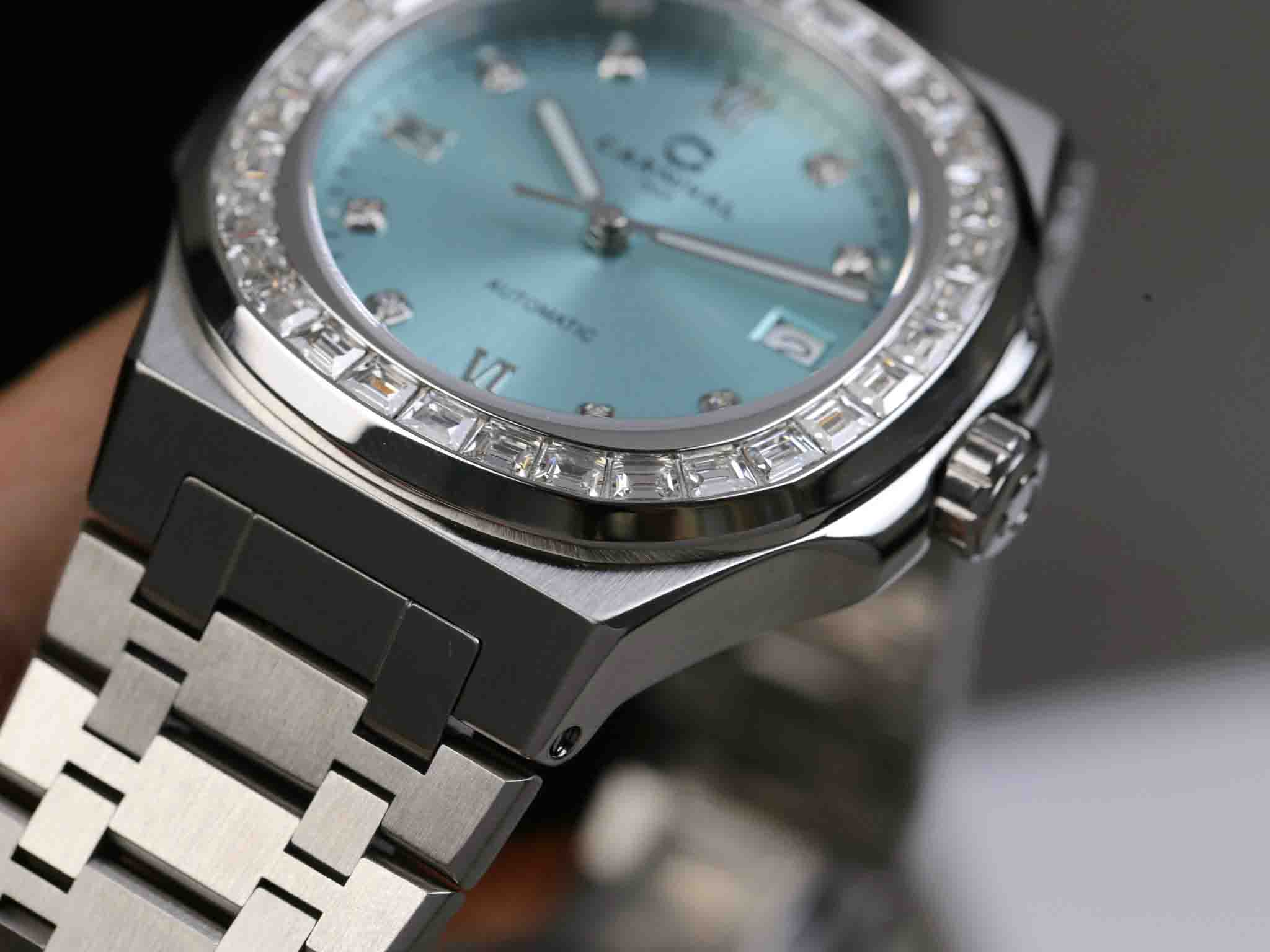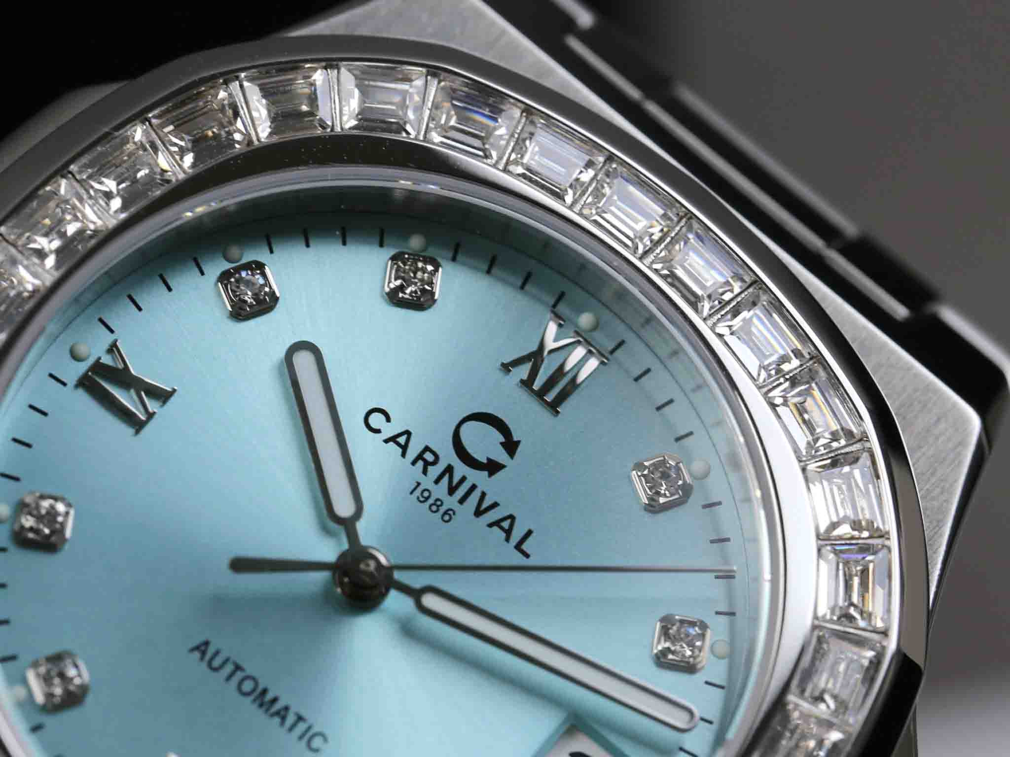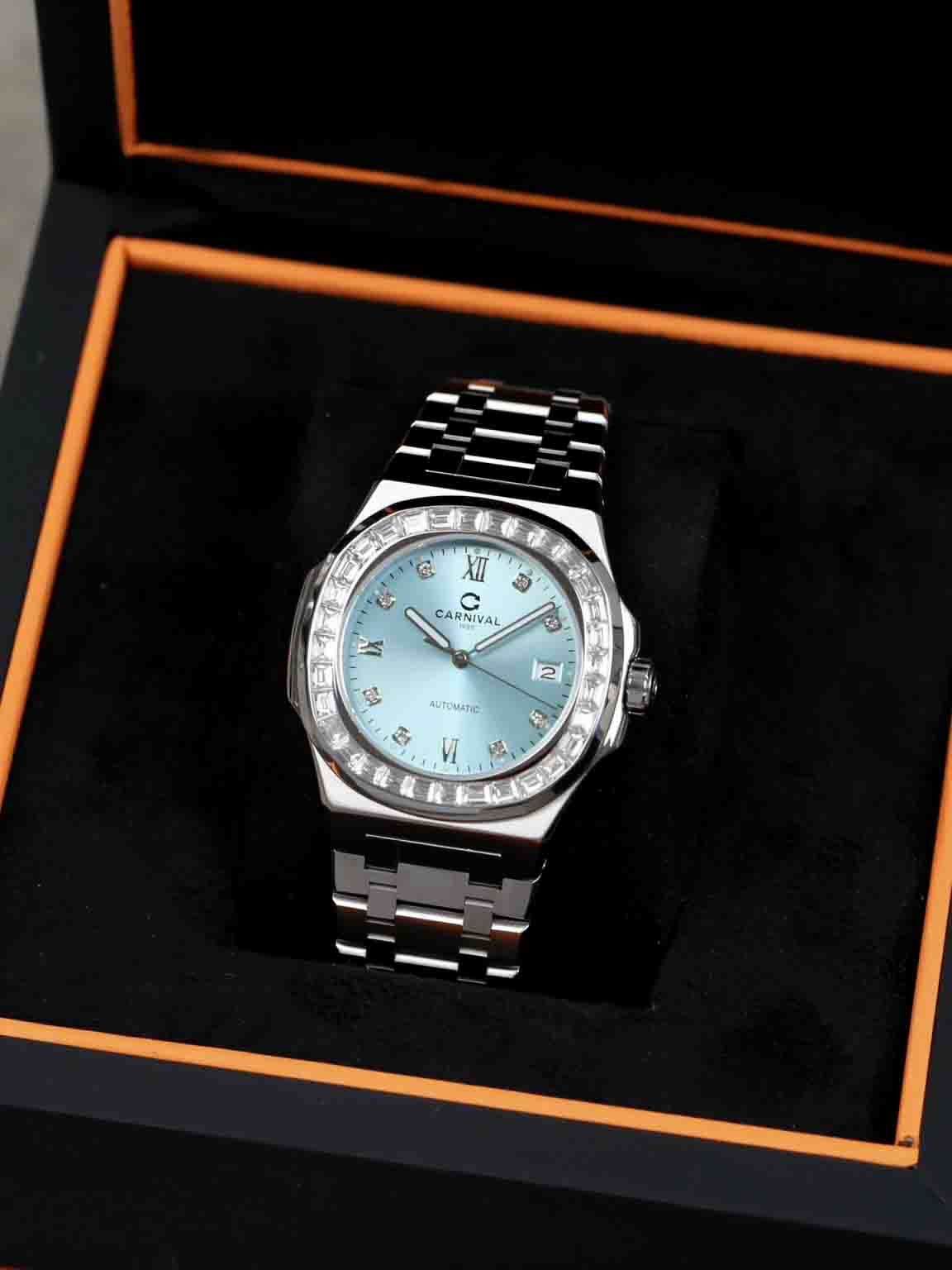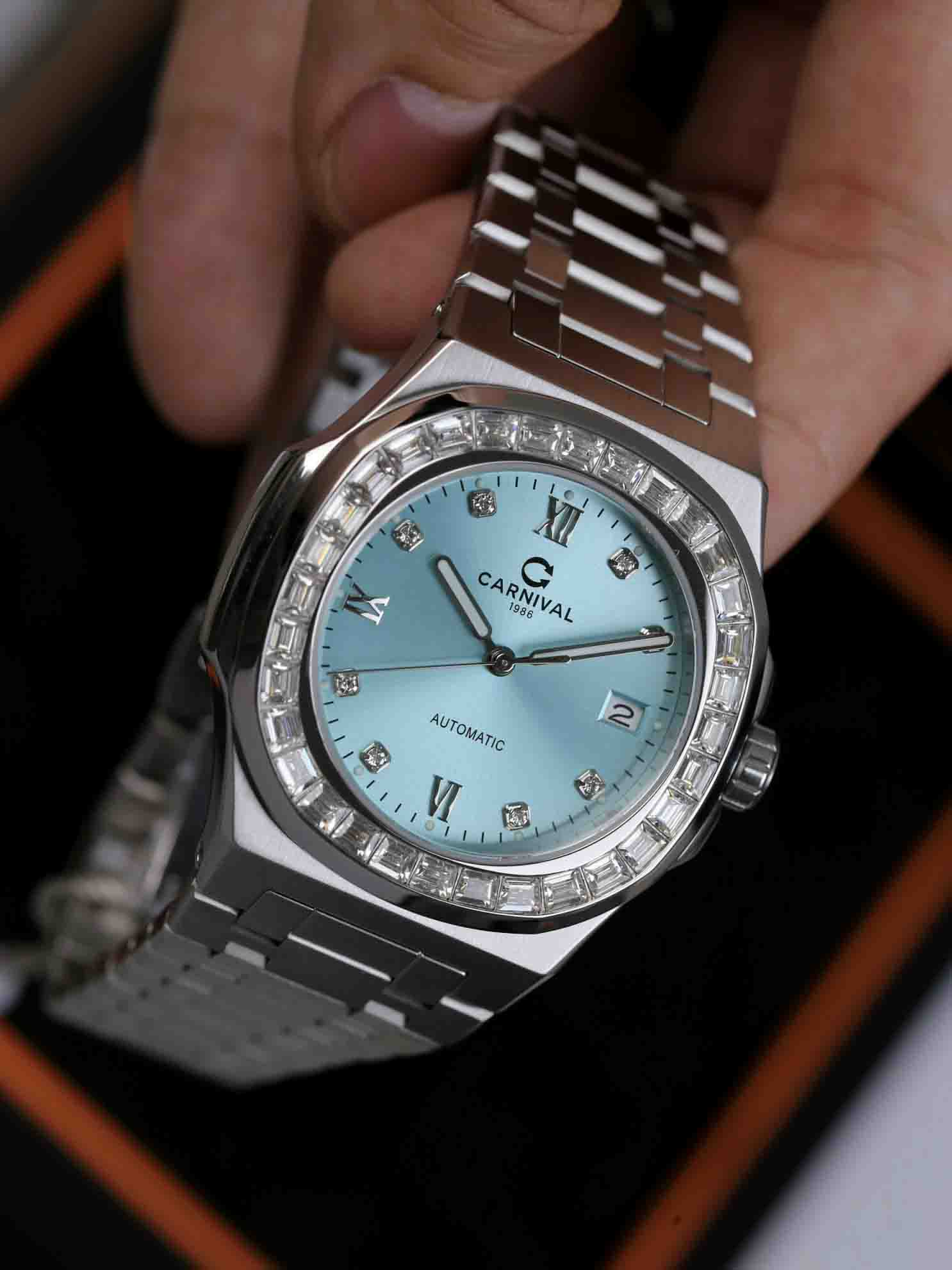 Nằm trong BST với phom dáng Nautilus nhà Carnival đã một lần nữa khẳng định được sức hút vượt thời gian của dòng sản phẩm mới 8129G Dial mới với cọc số và viền đính đá sáng bóng, mặt trải tia cực đẹp