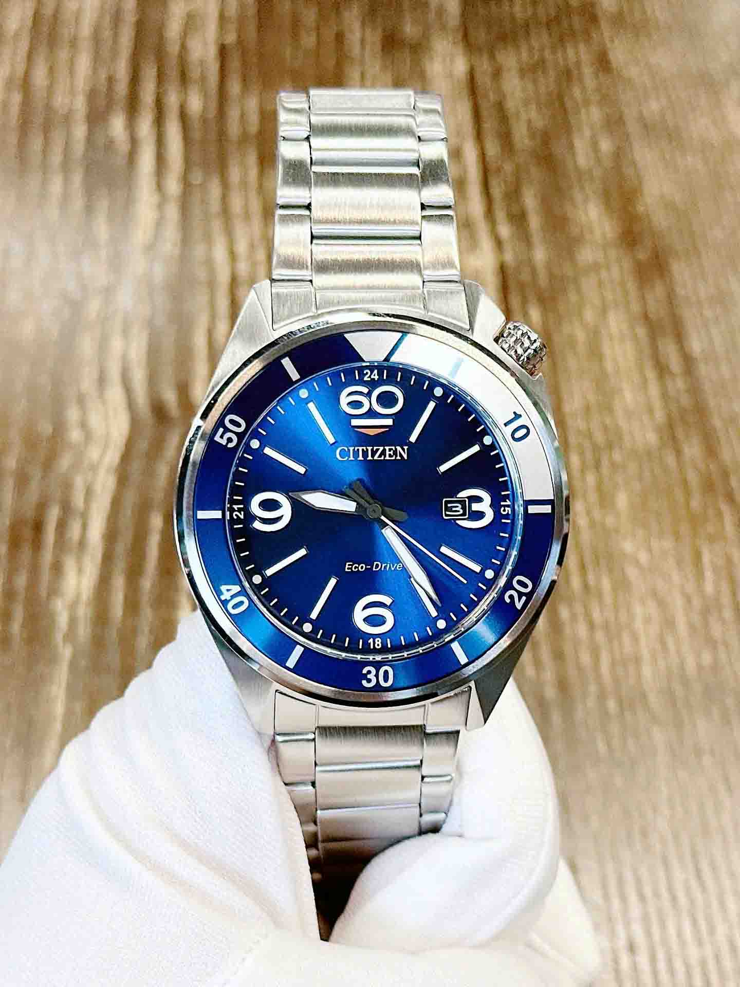 Mặt số màu xanh lam với các kim có tông màu bạc và vạch chỉ giờ bằng chữ số Ả Rập.