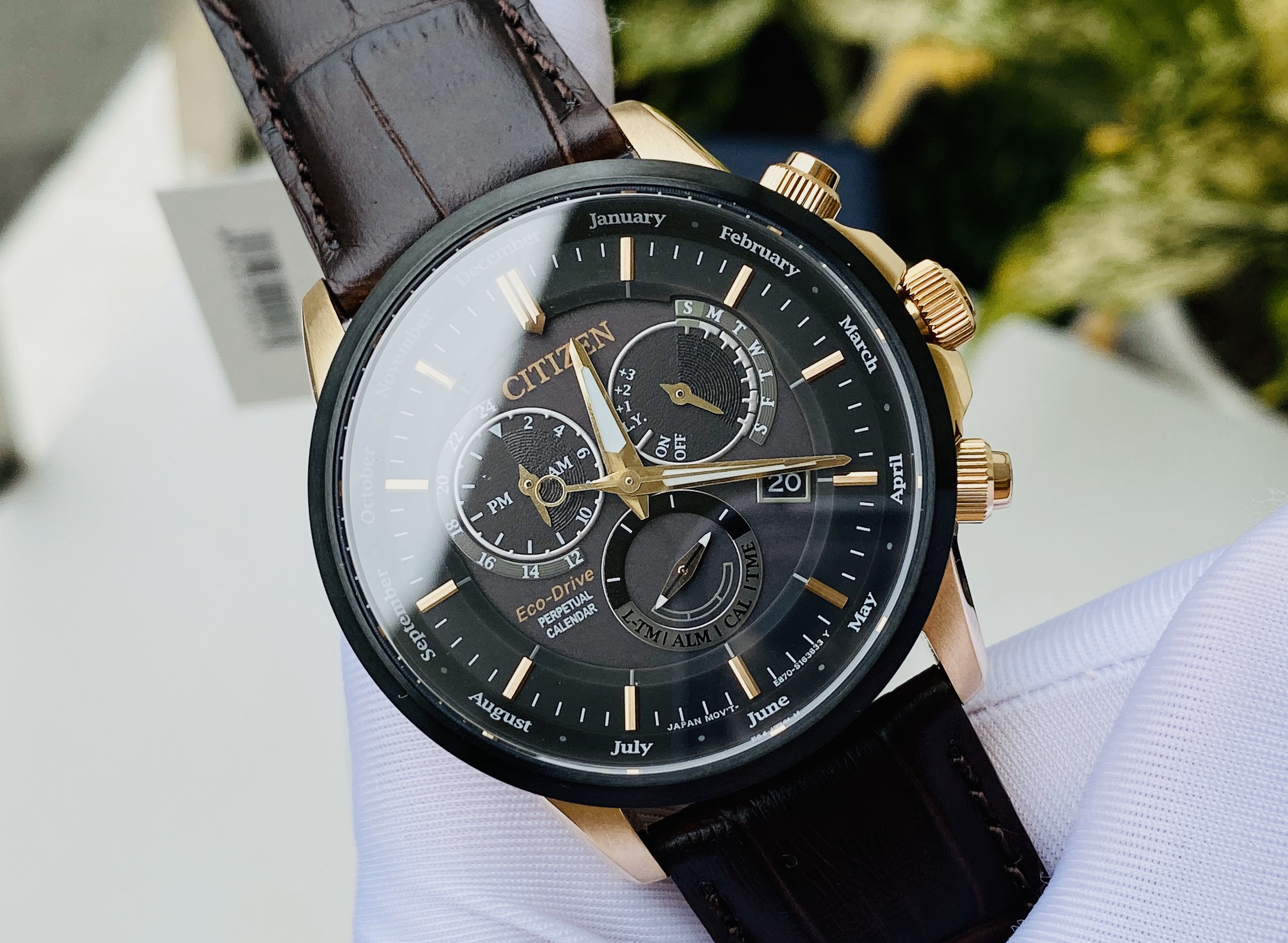 Là sự kết hợp hài hòa giữa sắc màu đen lịch lãm chủ đạo và vàng hồng tươi sáng ở viền, bừng lên vẻ đẹp sang trọng và quý phái của người sở hữu : Citizen Eco Drive PERPETUAL CALENDAR BL8156-12E