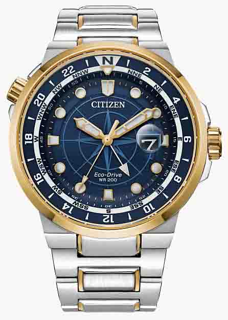 Citizen BJ7144-52L Eco_Drive Endeavor GMT. Chiếc đồng hồ mang đến hởi thở và một sự tự tin mới khi được sở hữu em nó. với tone màu blue kết hợp cùng màu gold sang trọng, bắt mắt. Dial biểu tượng la bàn cực độc, lạ và hiếm cùng chức năng GMT tiện lợi