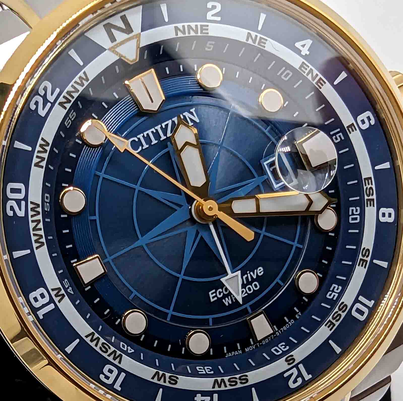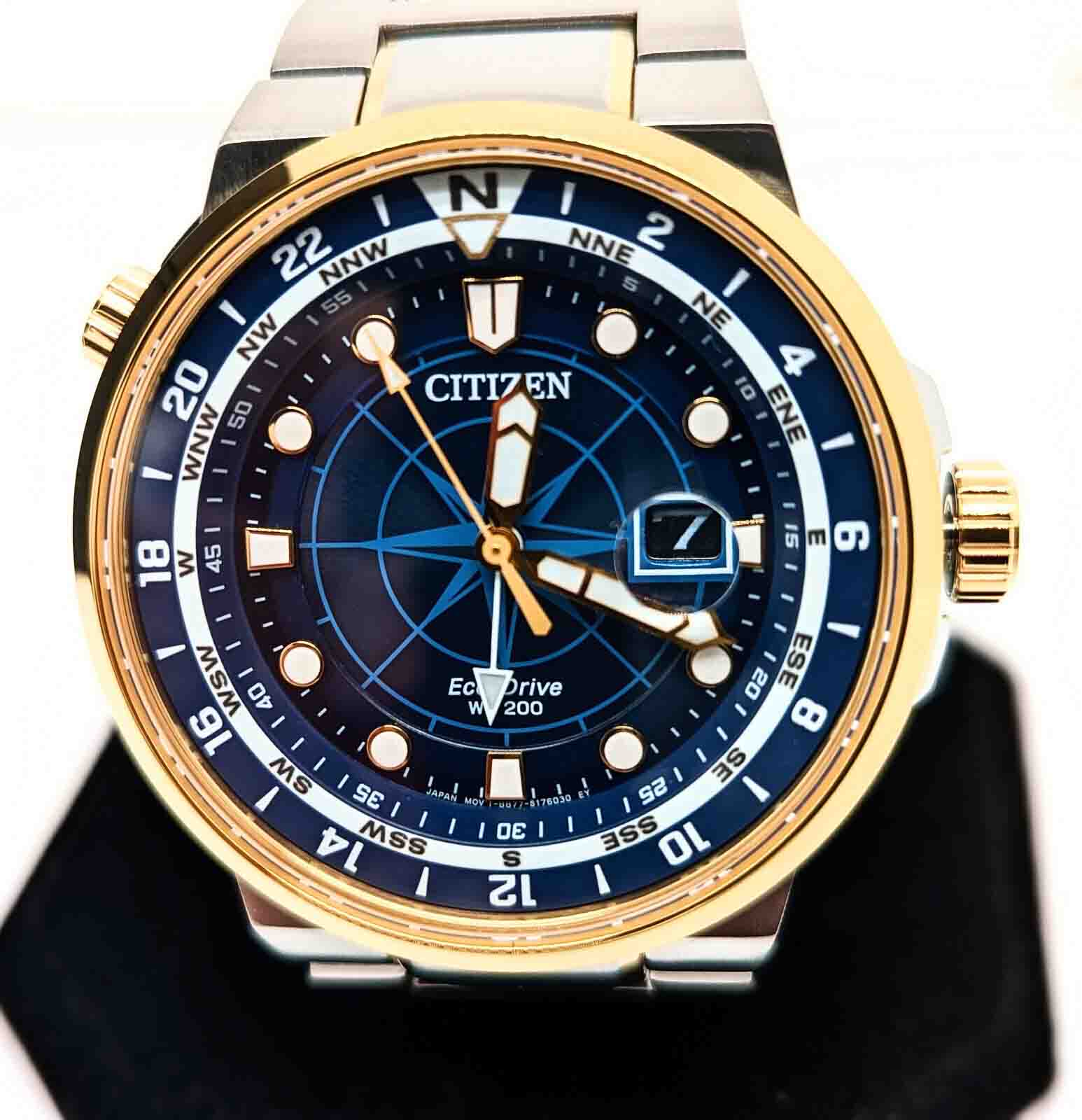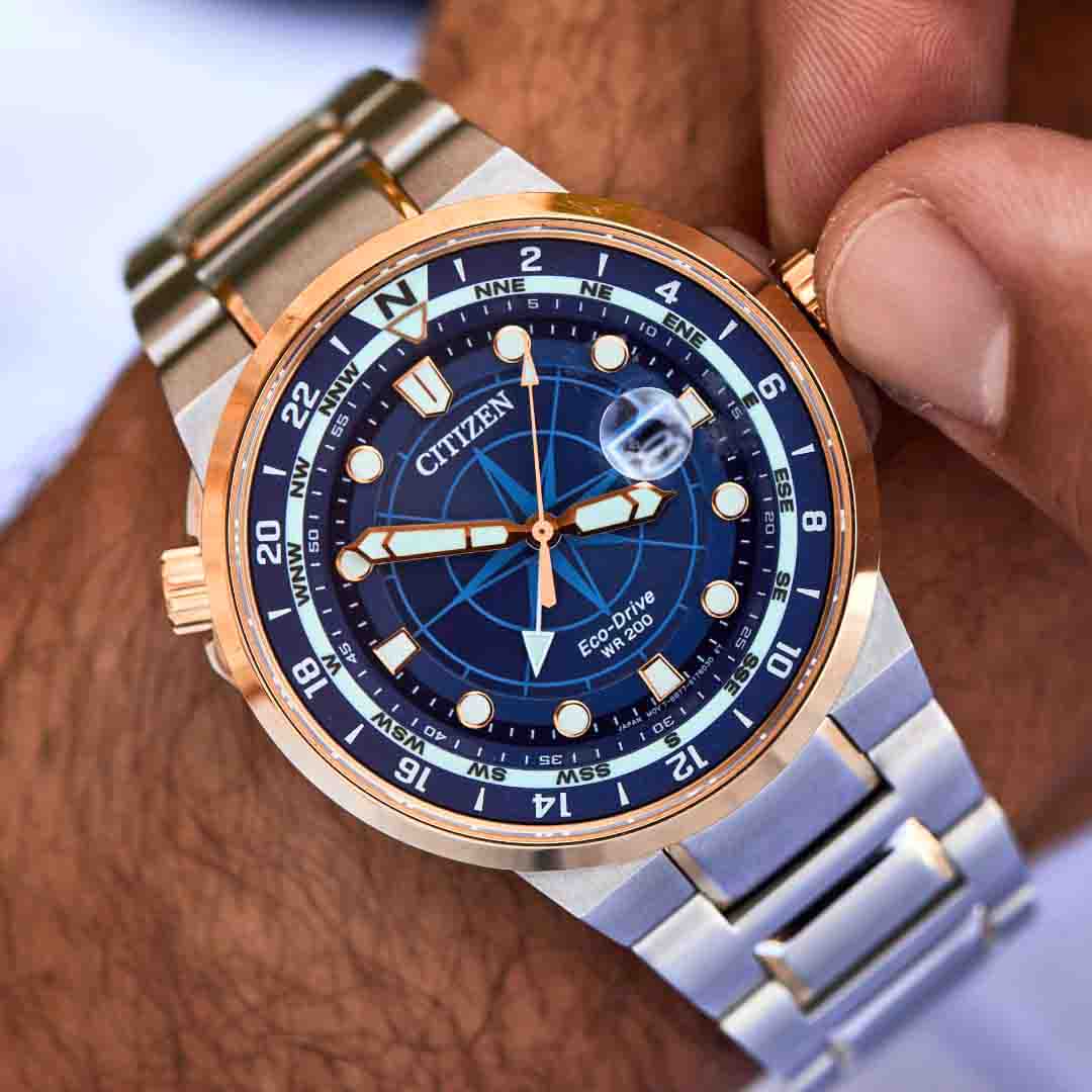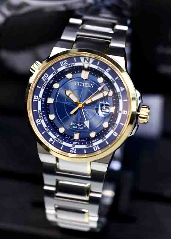 Citizen BJ7144-52L Eco_Drive Endeavor GMT. Chiếc đồng hồ mang đến hởi thở và một sự tự tin mới khi được sở hữu em nó. với tone màu blue kết hợp cùng màu gold sang trọng, bắt mắt. Dial biểu tượng la bàn cực độc, lạ và hiếm cùng chức năng GMT tiện lợi