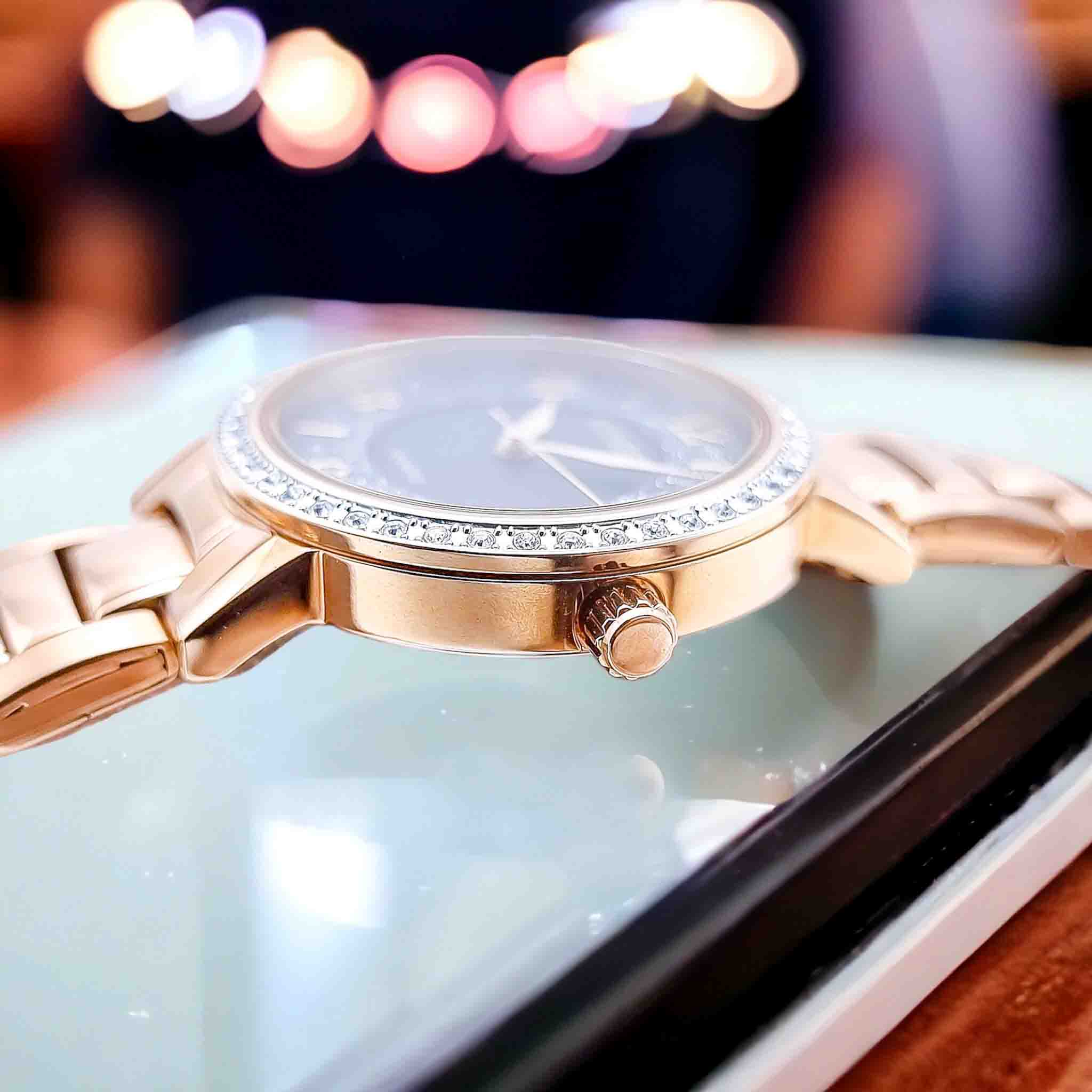 Sở hữu thiết kế đầy mạnh mẽ nhưng không mất đi sự tinh tế, hiện đại và đẳng cấp. Với dây thép không gỉ cao cấp màu vàng hồng làm nổi bật viền đính đá lấp lánh cùng mắt số đen ấn tượng, sẵn sàng cùng nàng chinh phục mọi phong cách thời trang.