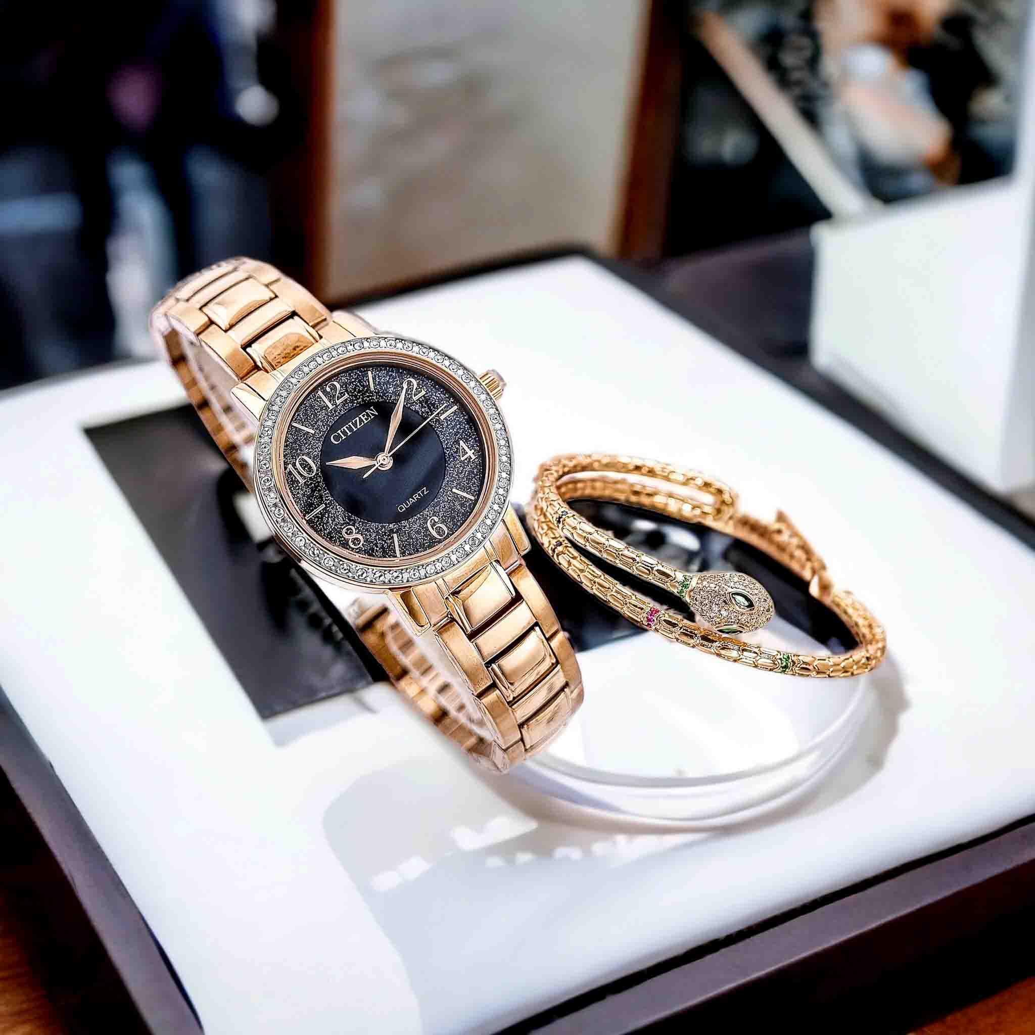 Đồng Hồ Nữ Citizen Pin EL3048-53E Dây Sắt Vỏ Vàng Hồng Mặt Đen