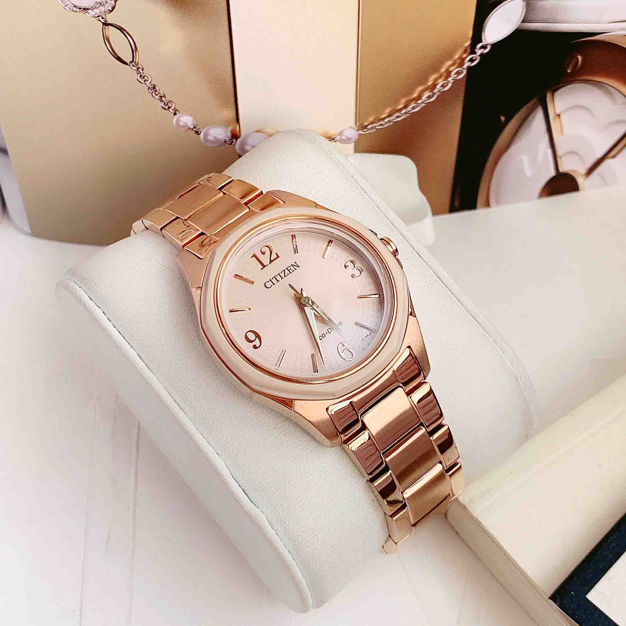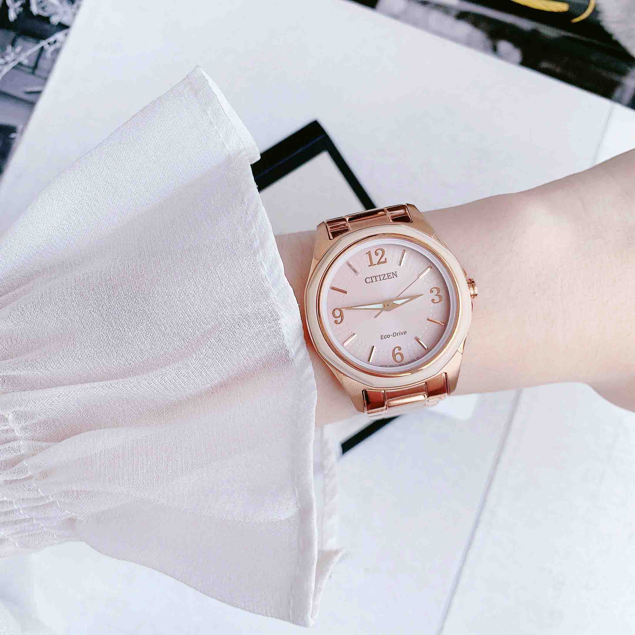 FE7053-51X Eco-drive pin năng lượng mọi ánh sáng. Thiết kế tone rose gold nhẹ nhàng xinh xắn, phù hợp với mọi màu da hay trang phục nào.