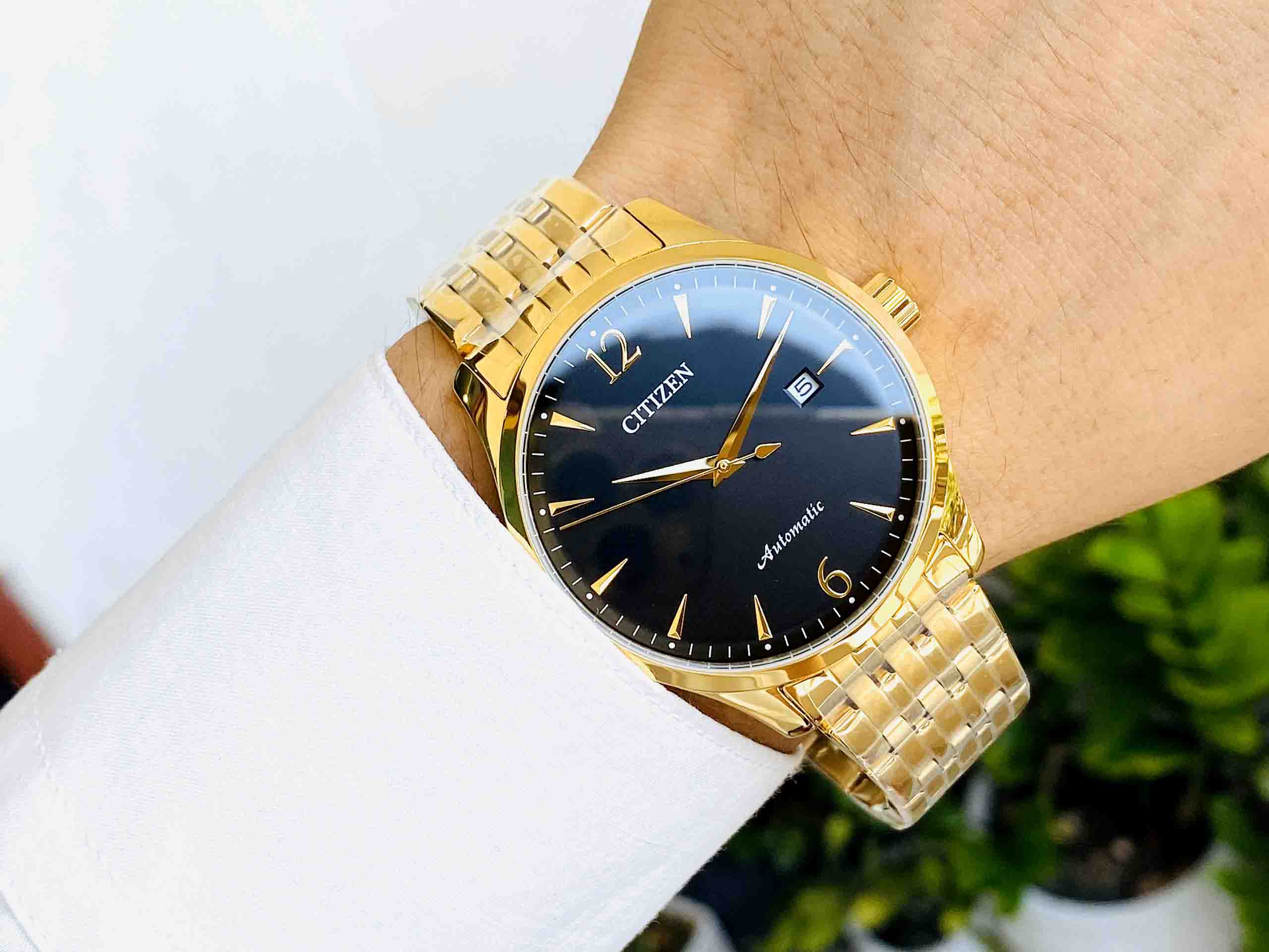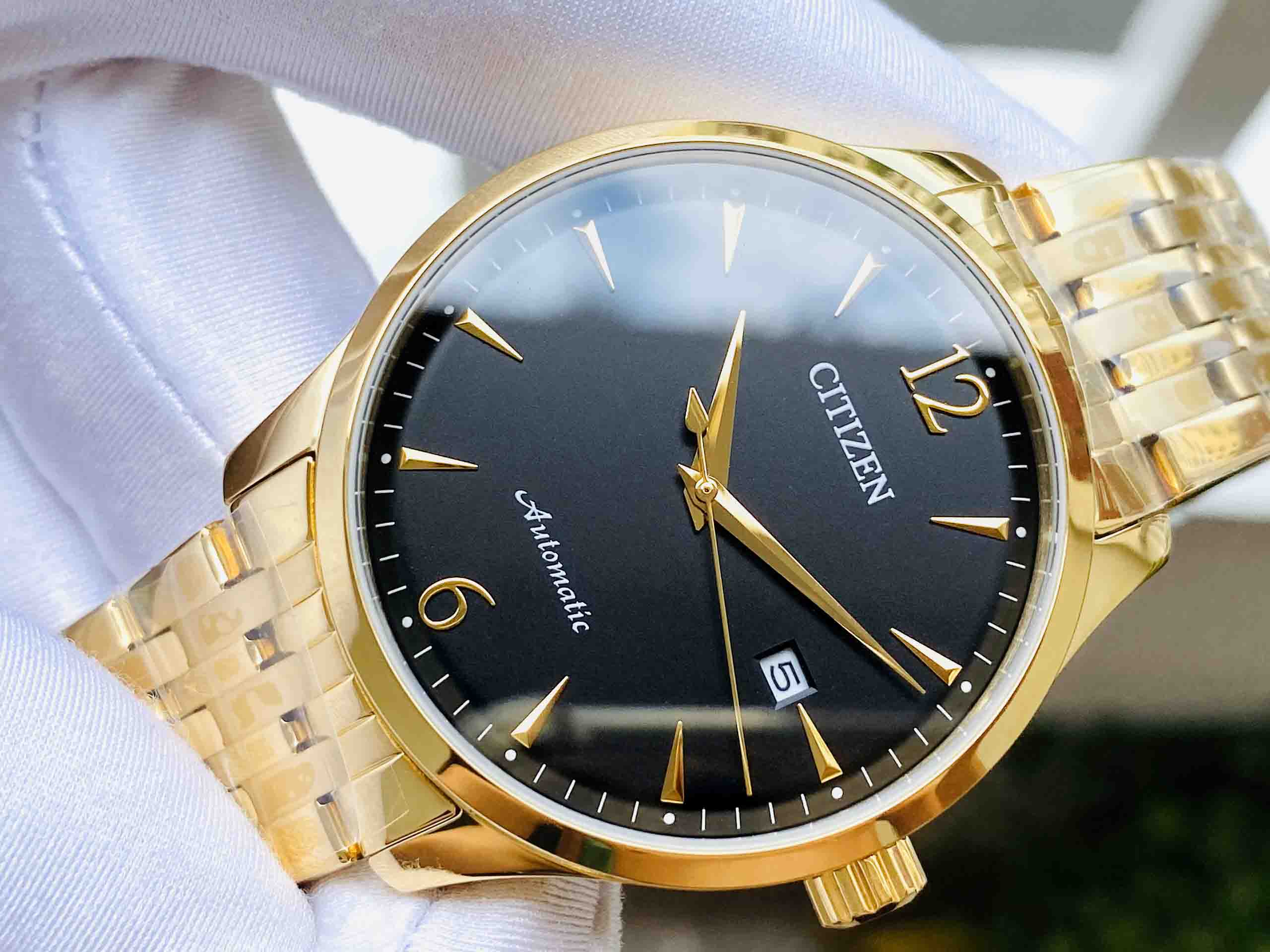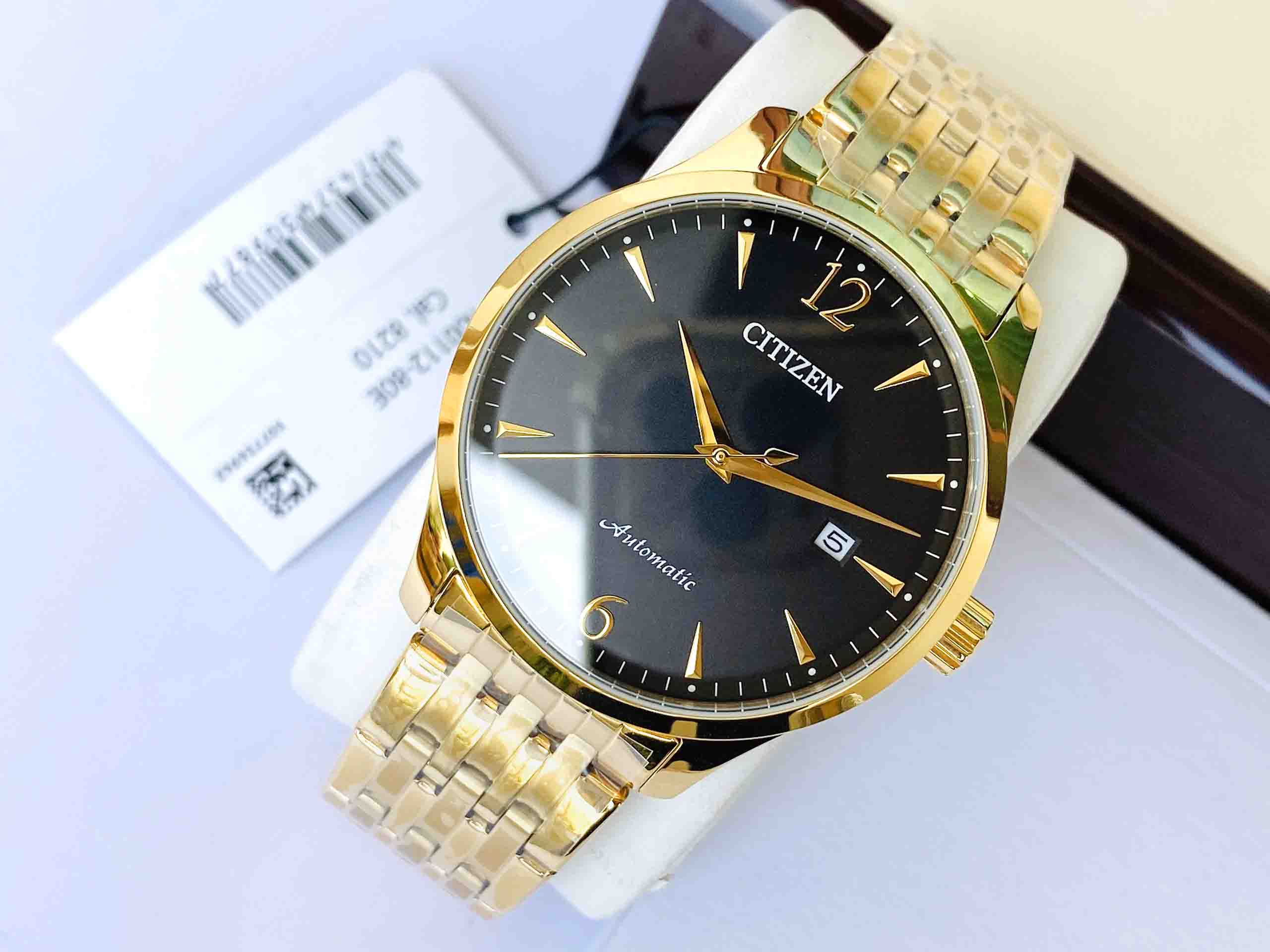Mẫu đồng hồ Nam Citizen Automatic NJ0112-80E được phủ lên mình lớp mạ vàng PVD cực chất, với mặt số màu đen thêm vẻ huyền bí. Lịch ngày góc 3h cổ điển, bộ kim được chế tác tinh xảo mạ vàng nổi bật tên nền đen của mặt số