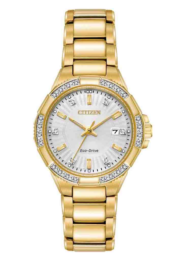 • Tỏa sáng rực rỡ với bộ sưu tập Citizen Riva, được cung cấp năng lượng bởi bất kỳ ánh sáng nào với công nghệ Pin Eco-Drive. Được trang trí bằng kim cương trên viền và mặt số, bạn sẽ chắc chắn nổi bật khi đeo Riva. Nổi bật với chất liệu thép không gỉ tông vàng với mặt số và ngày màu bạc rực rỡ.