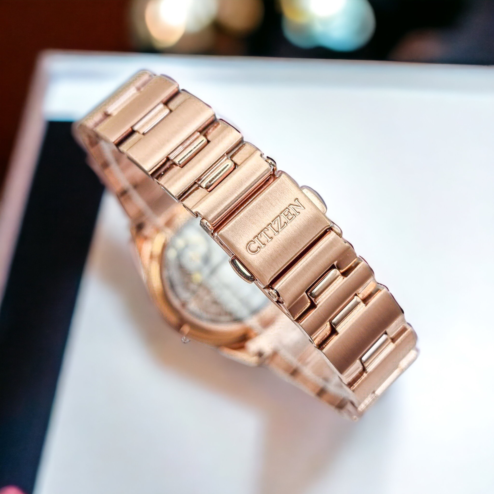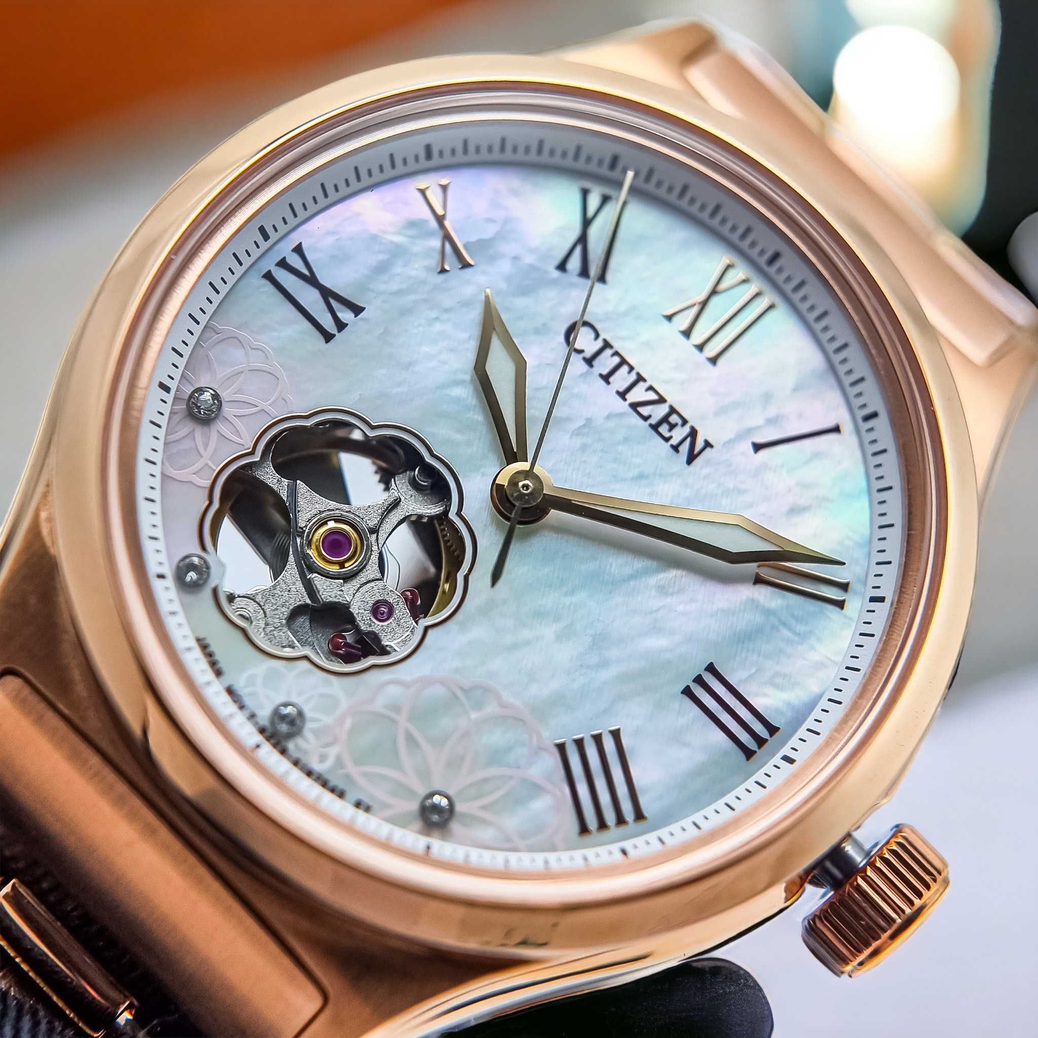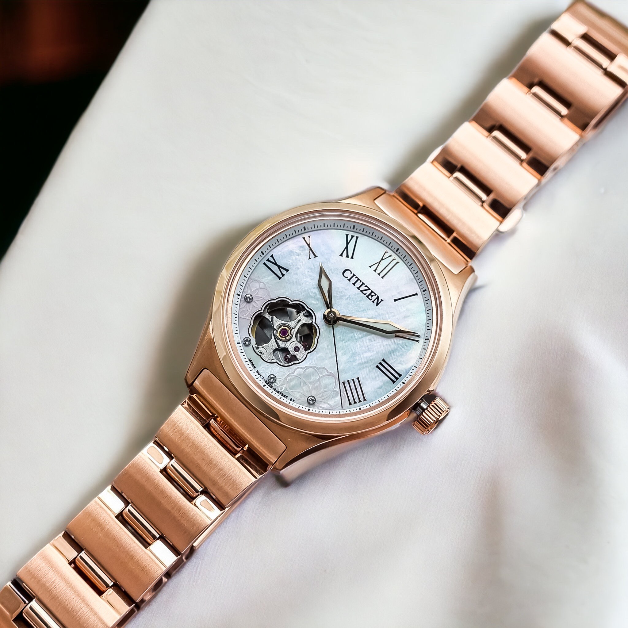 – Đồng Hồ Nữ Citizen Automatic PC1007-81D Dây Sắt Vàng Hồng Mặt Khảm Trai Sapphire