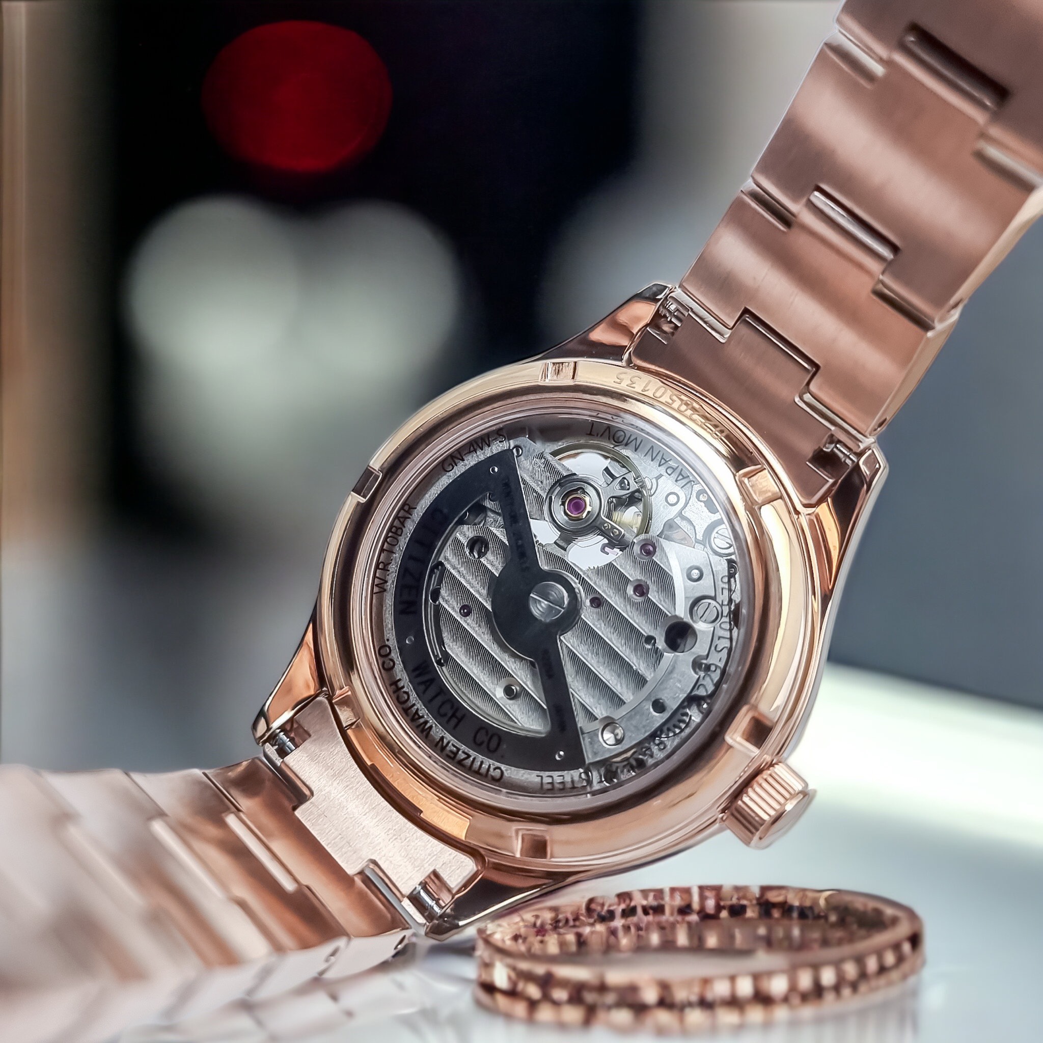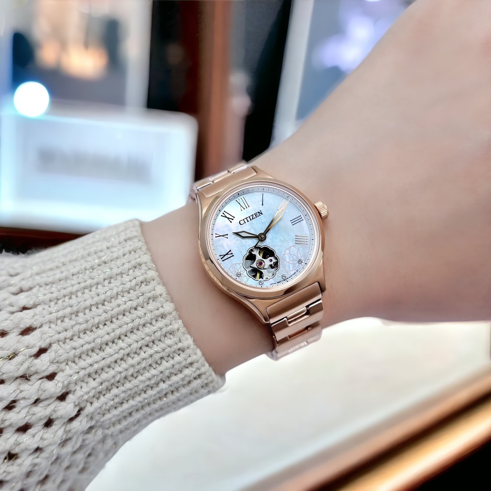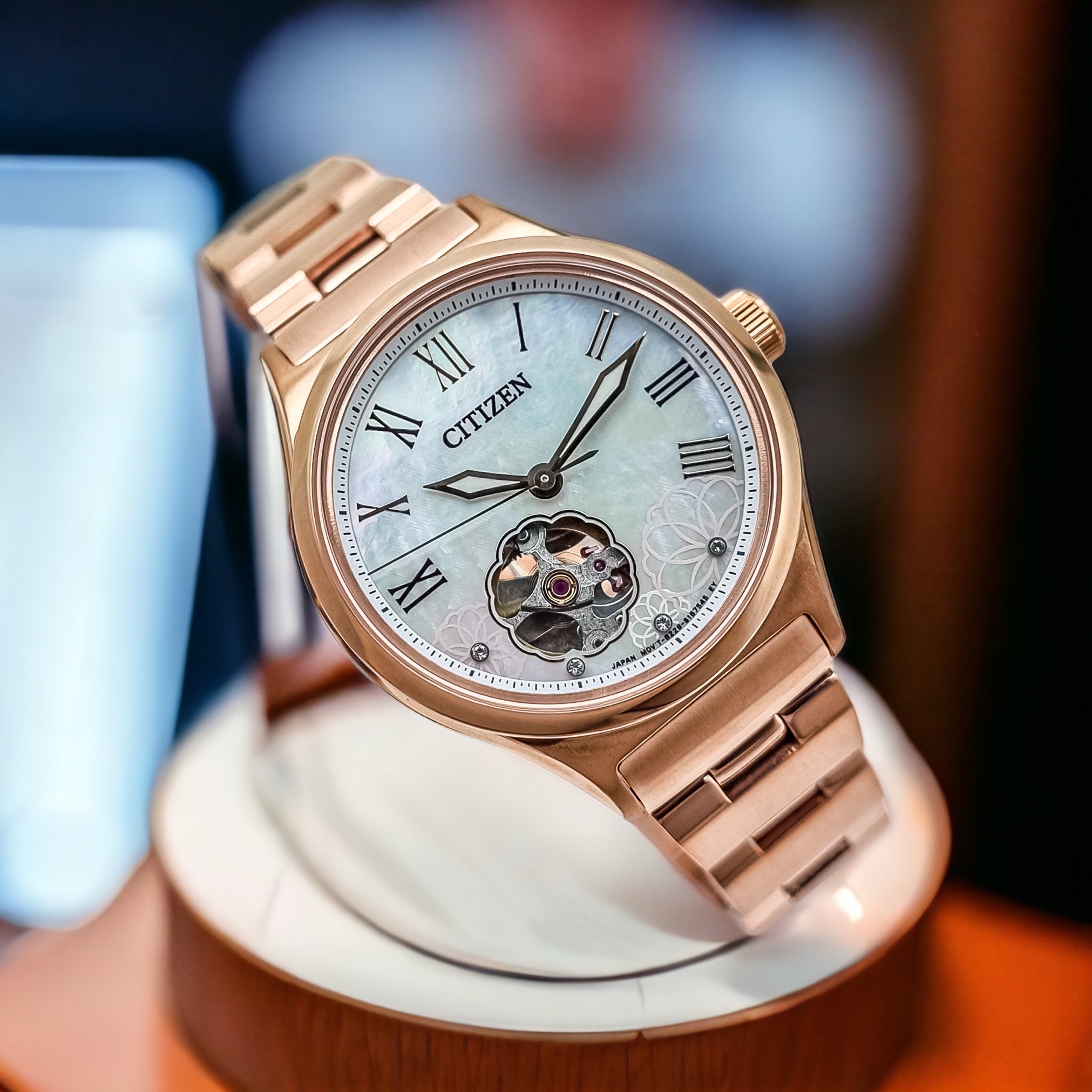 – Đồng Hồ Nữ Citizen Automatic PC1007-81D Dây Sắt Vàng Hồng Mặt Khảm Trai Sapphire