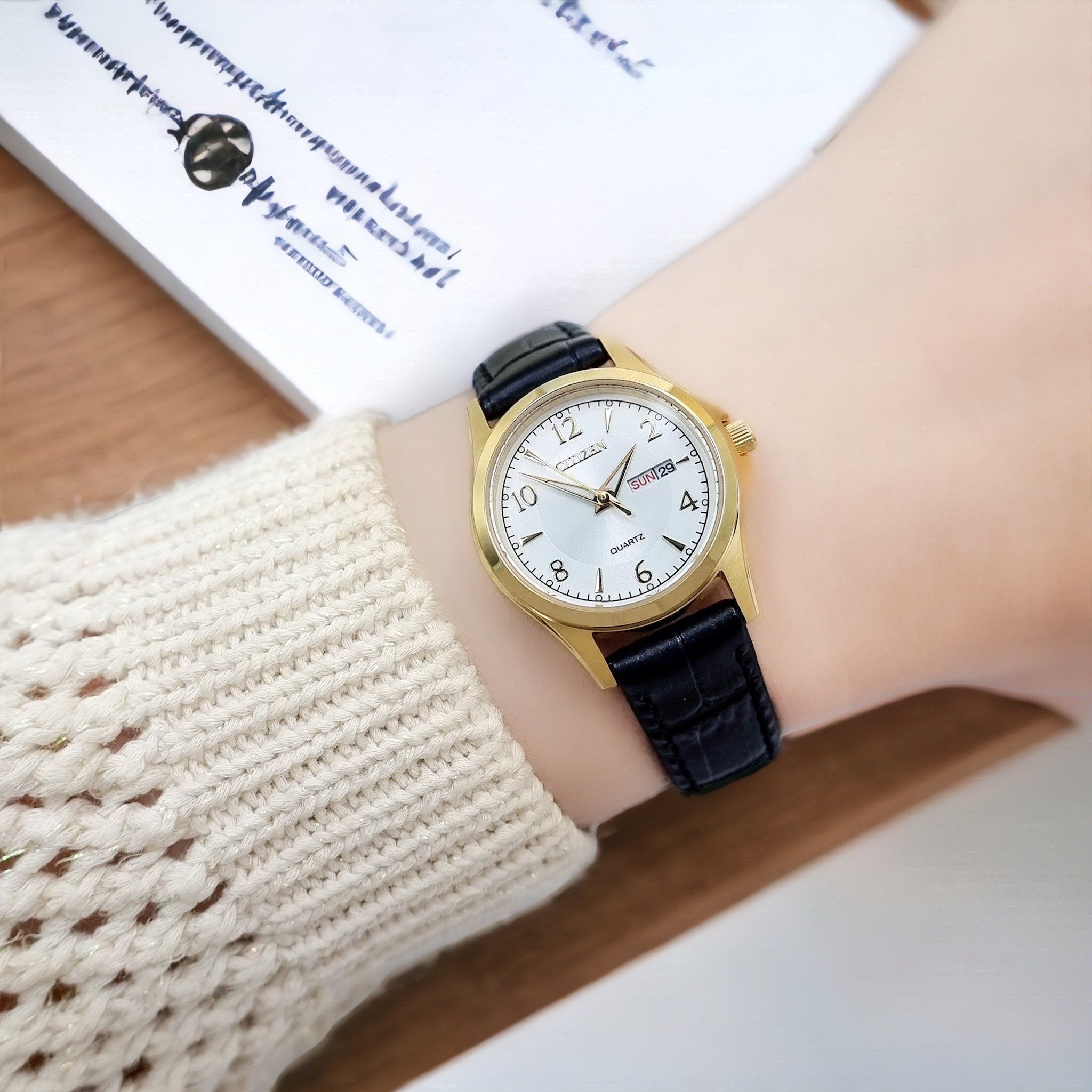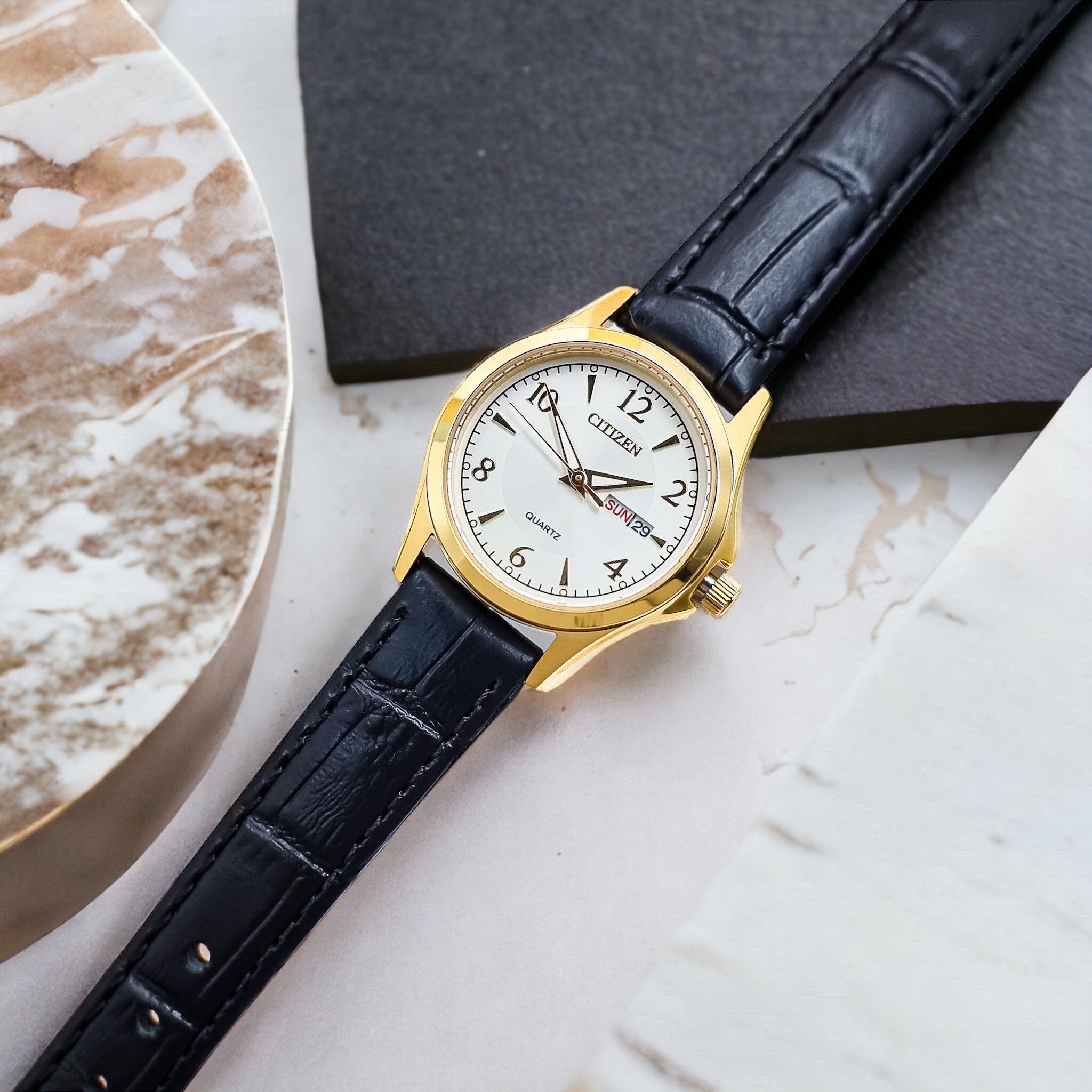 – Đồng Hồ Nữ Citizen Quartz EQ0593-26A Dây Da Đen Mặt Trắng Tinh Tế Kiểu dáng thiết kế tinh tế, đơn giản nhưng không kém phần sang trọng với dây đeo da màu đen, mặt kính trắng chống trầy xước và kim chỉ mạ vàng. Kết hợp tính năng lịch ngày và lịch thách giúp các nàng dễ dàng sử dụng ở mọi nơi.