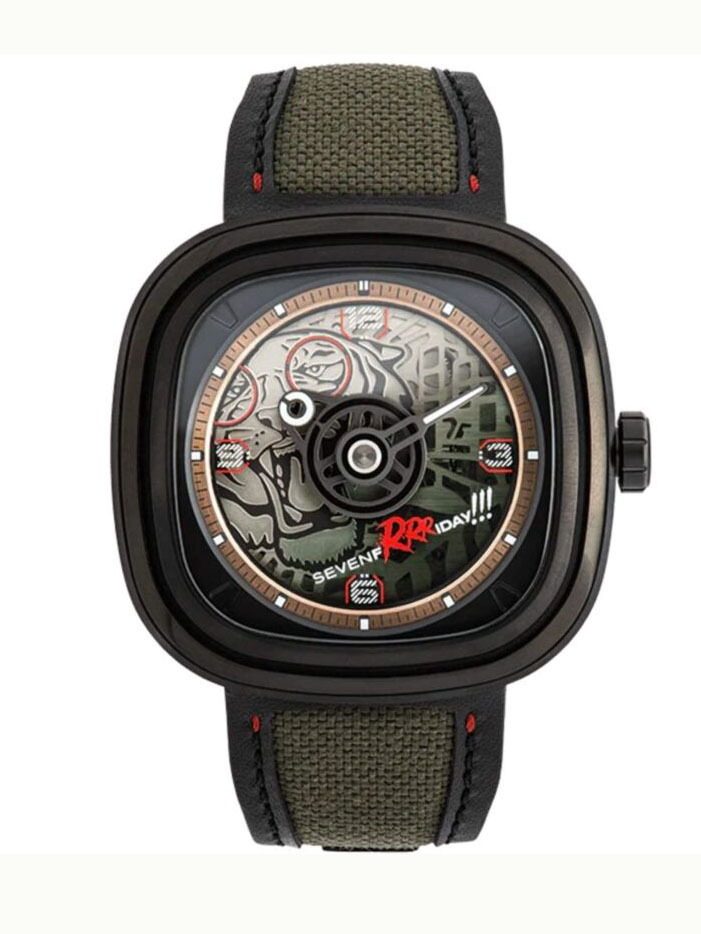– Máy automatic skeleton Với nguồn cảm hứng từ những chú hổ năng động và đầy phấn khích. “SevenfRRRday” sở hữu cấu trúc bốn lớp, mặt số được làm bằng từ thấu kính semi-transparent màu xanh lá cây.