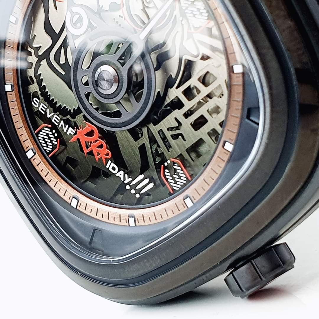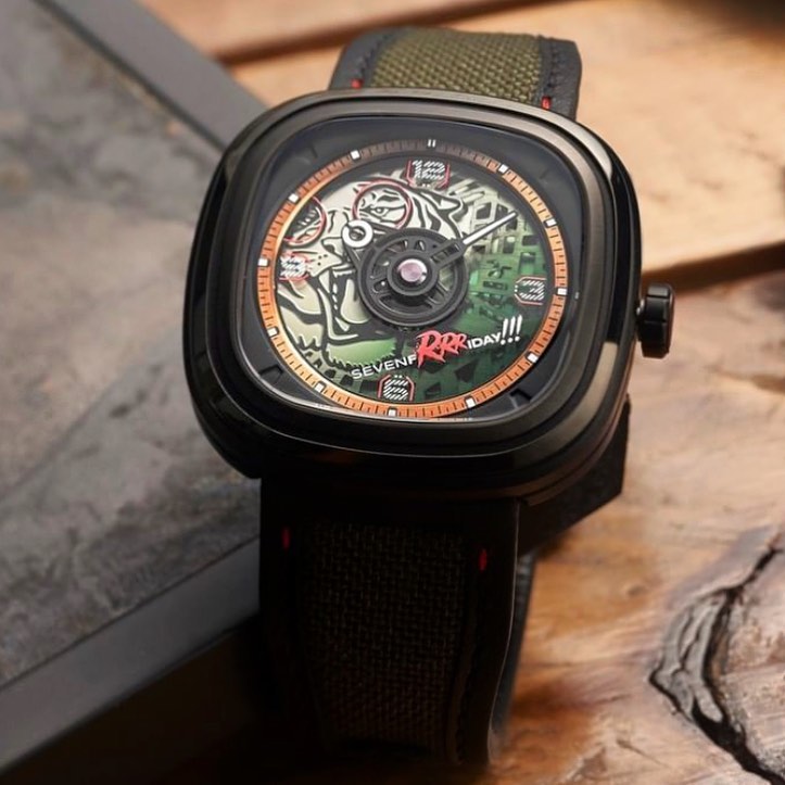 – Máy automatic skeleton Với nguồn cảm hứng từ những chú hổ năng động và đầy phấn khích. “SevenfRRRday” sở hữu cấu trúc bốn lớp, mặt số được làm bằng từ thấu kính semi-transparent màu xanh lá cây.