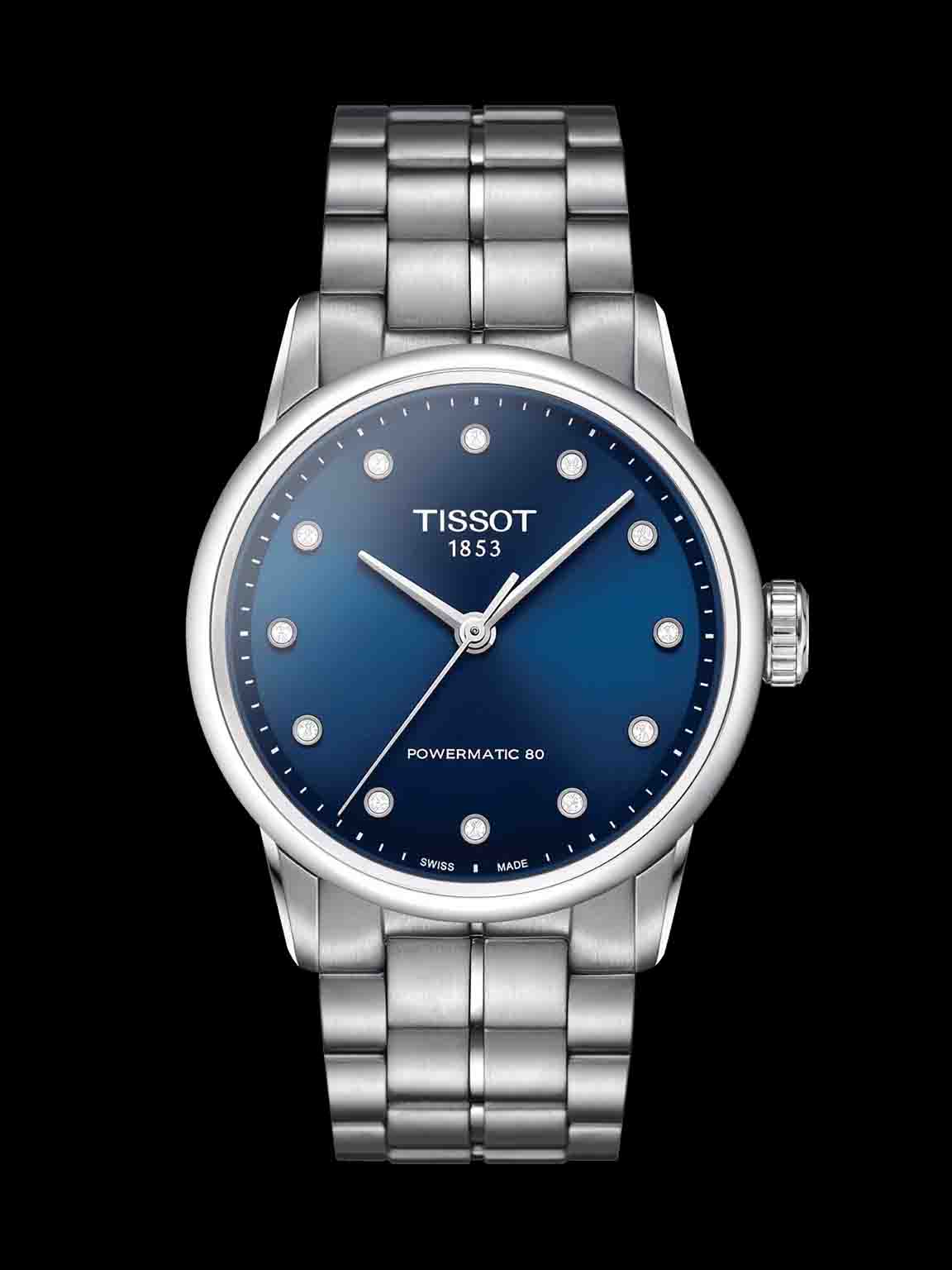 TISSOT LUXURY AUTOMATIC T086.207.11.046.00 thiết kế dây thép không gỉ sáng bóng, mặt số xanh dương cuốn hút. Nổi bật hơn là đính 12 viên kim cương.