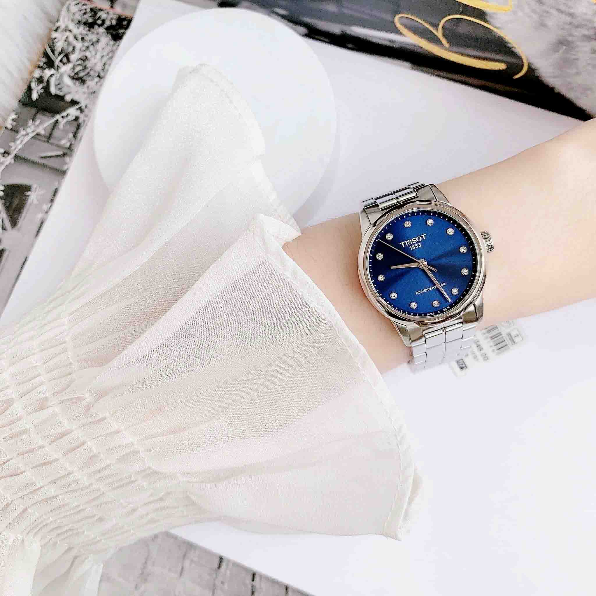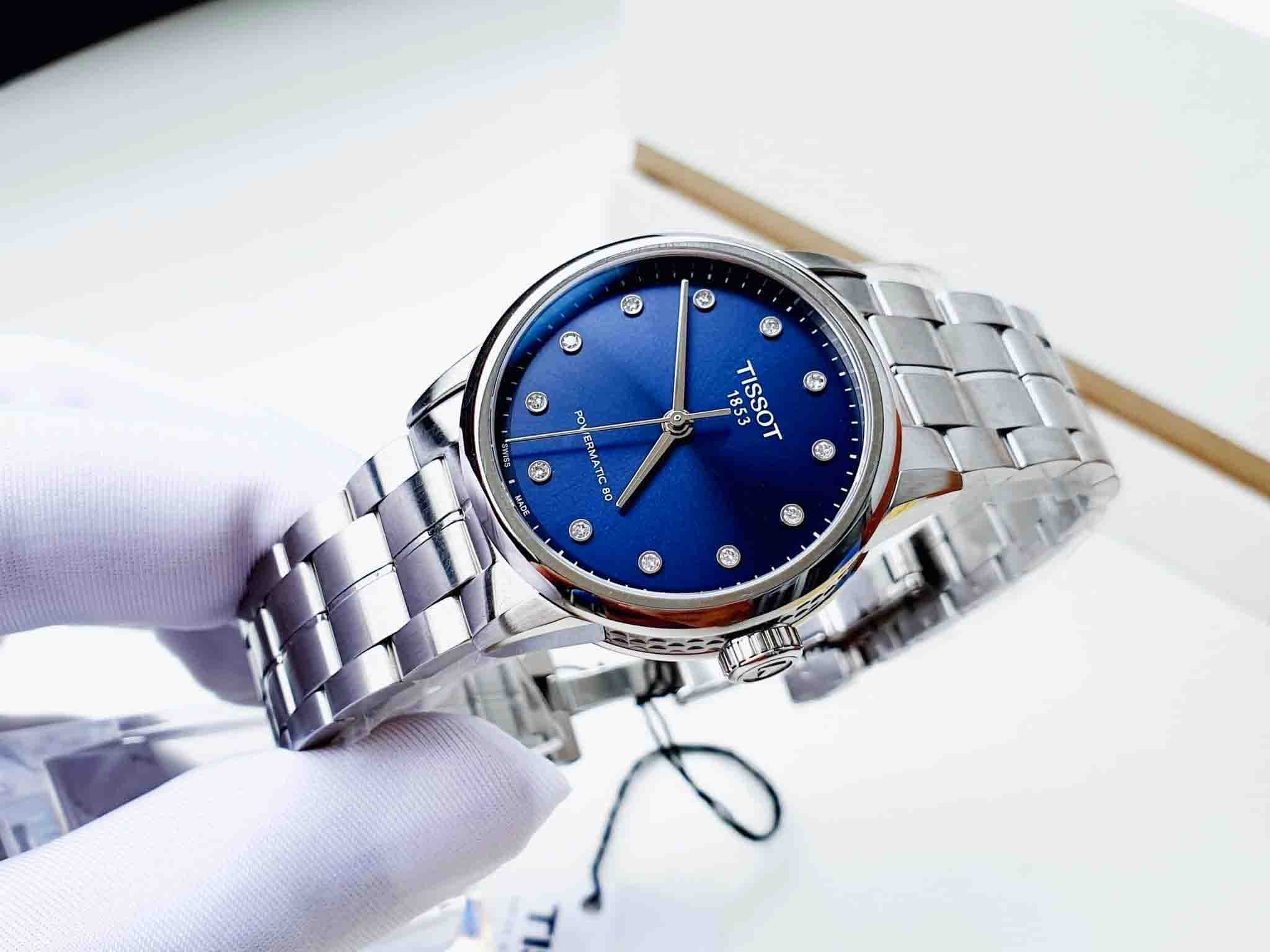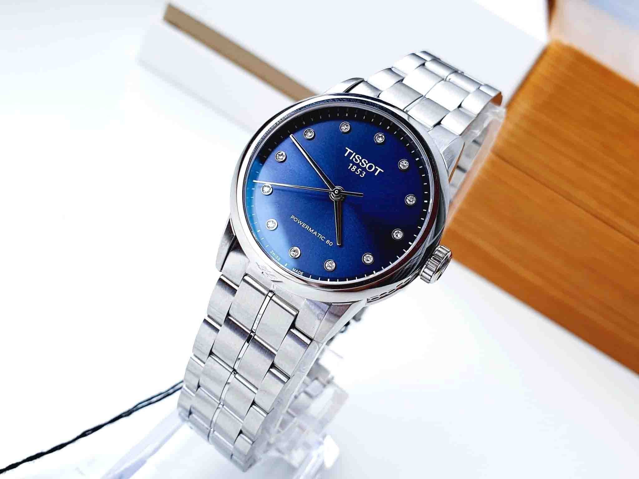 TISSOT LUXURY AUTOMATIC T086.207.11.046.00 thiết kế dây thép không gỉ sáng bóng, mặt số xanh dương cuốn hút. Nổi bật hơn là đính 12 viên kim cương.