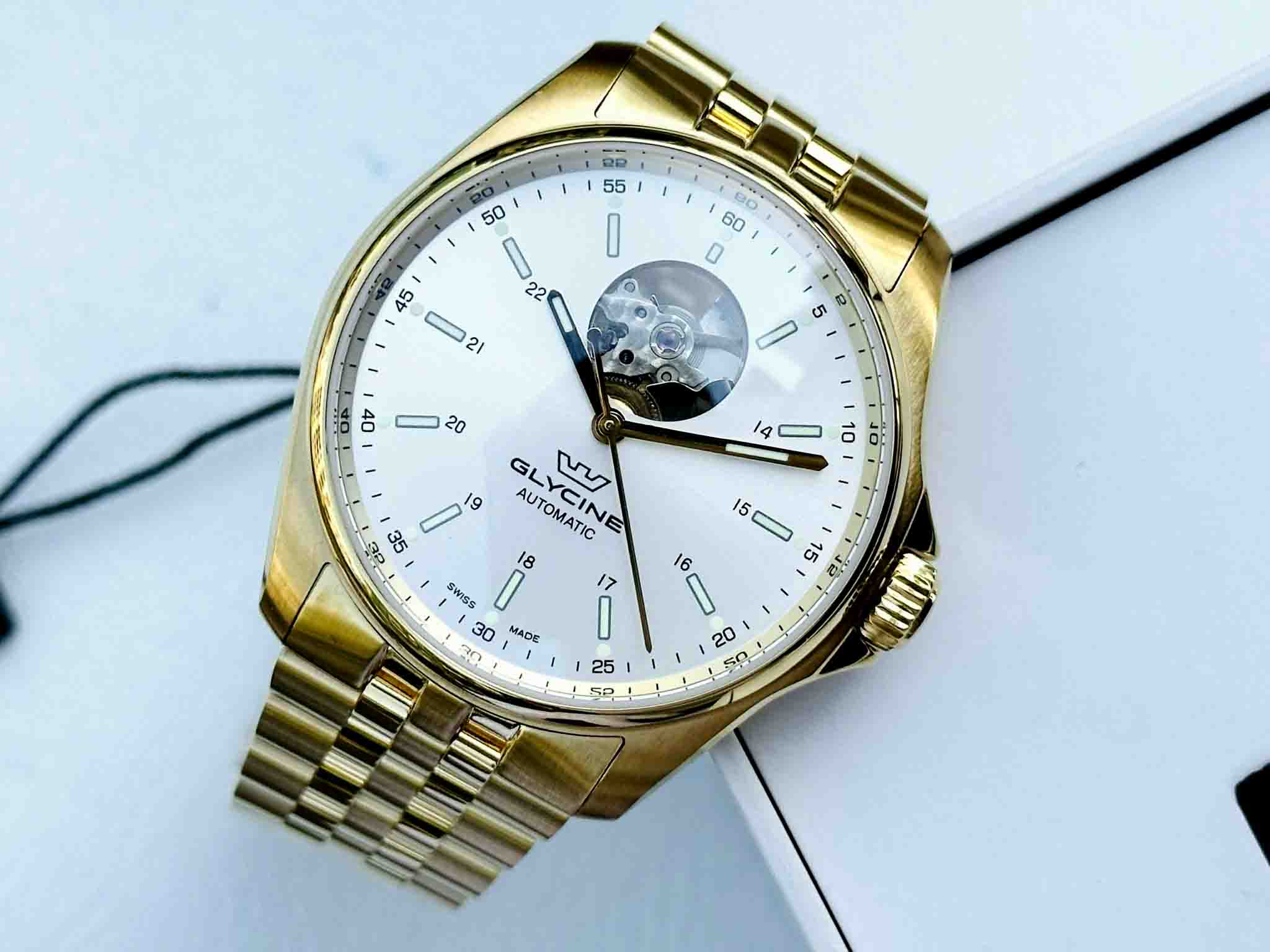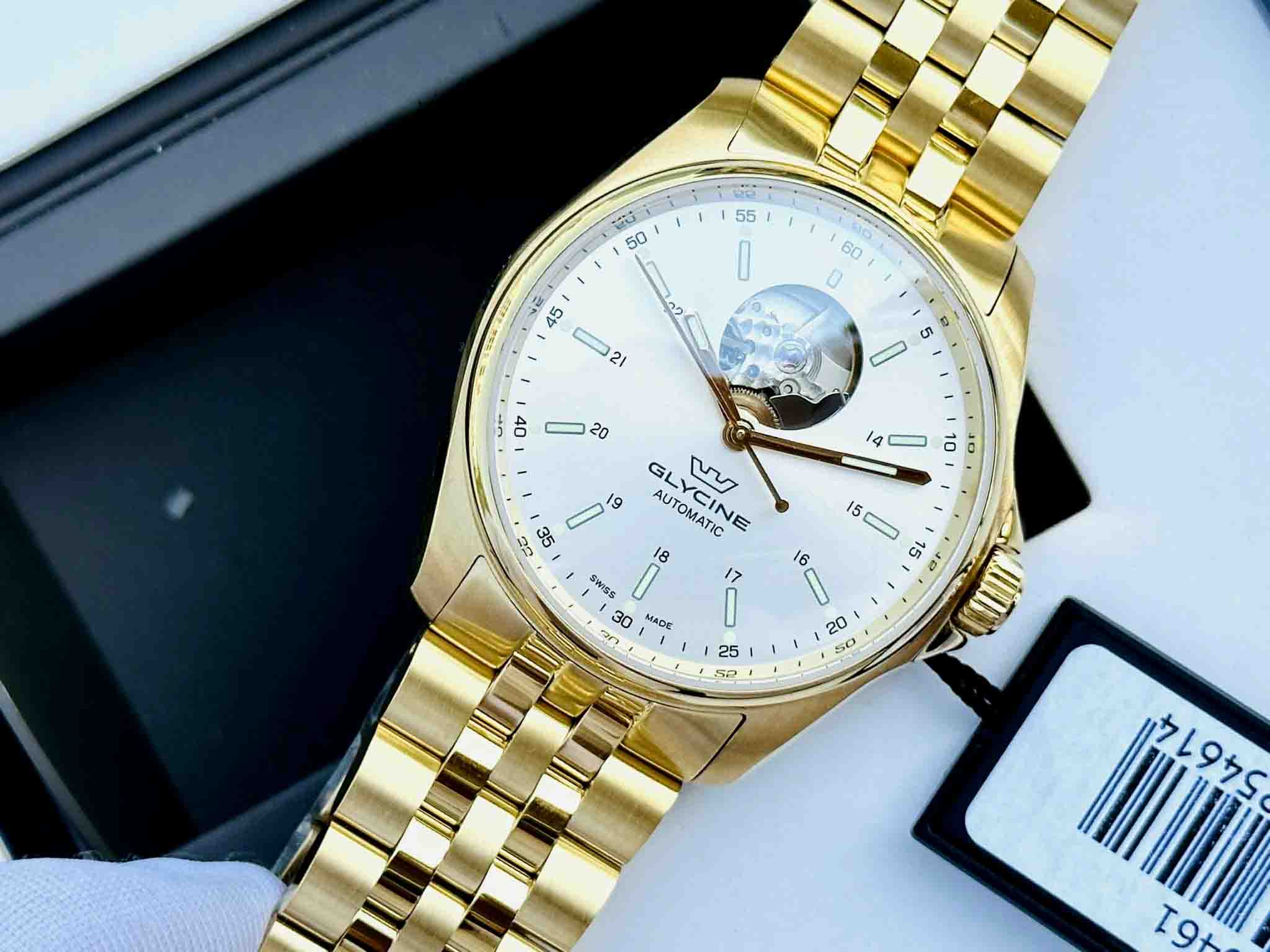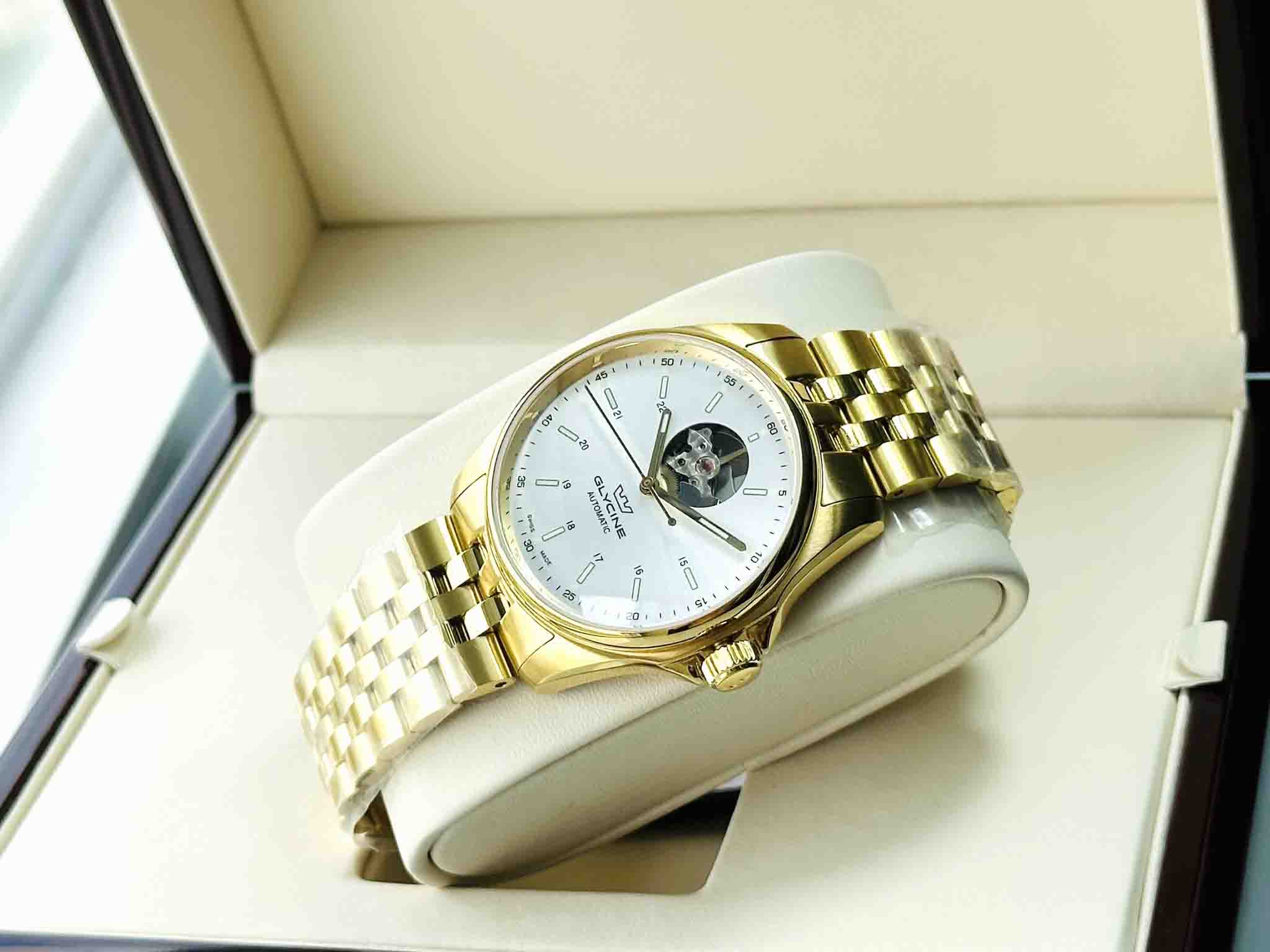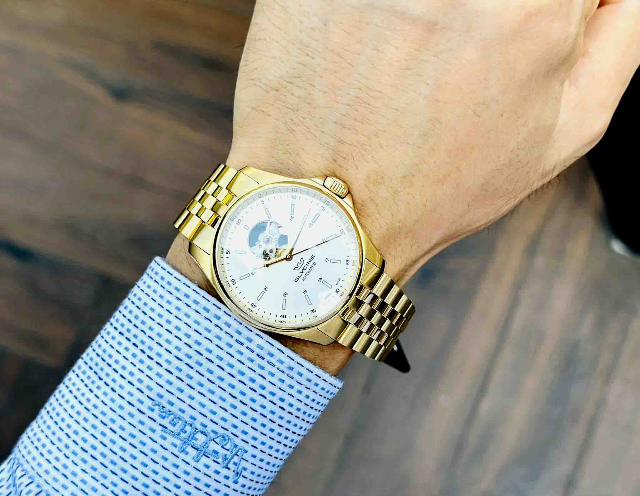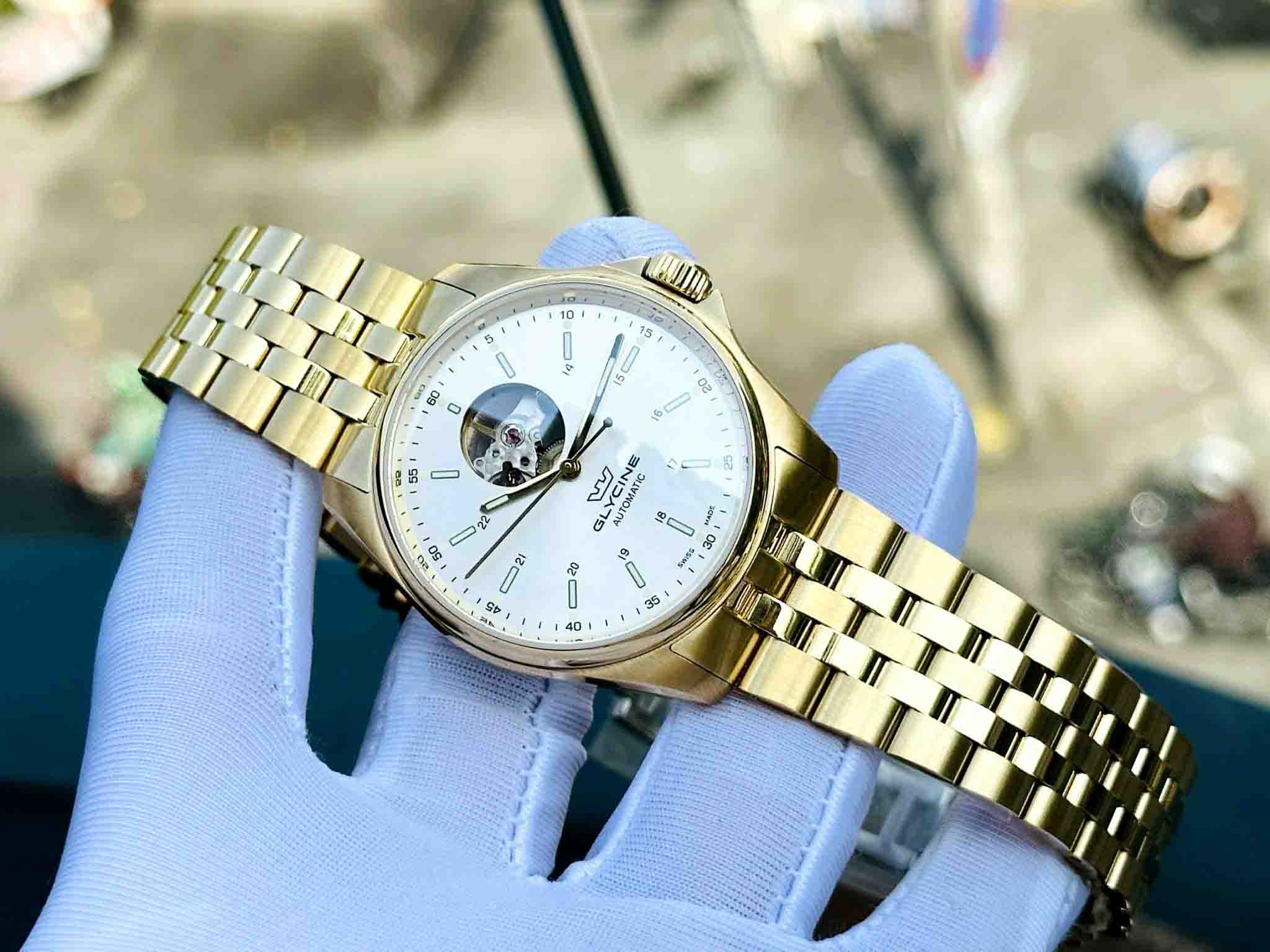 Đồng hồ nam THUỴ SỸ : Glycine Swiss hở tim tuyệt đẹp , cảm nhận vẻ vượt thời gian táo bạo tông vàng chủ đạo trên đôi tay của các quý ông .
