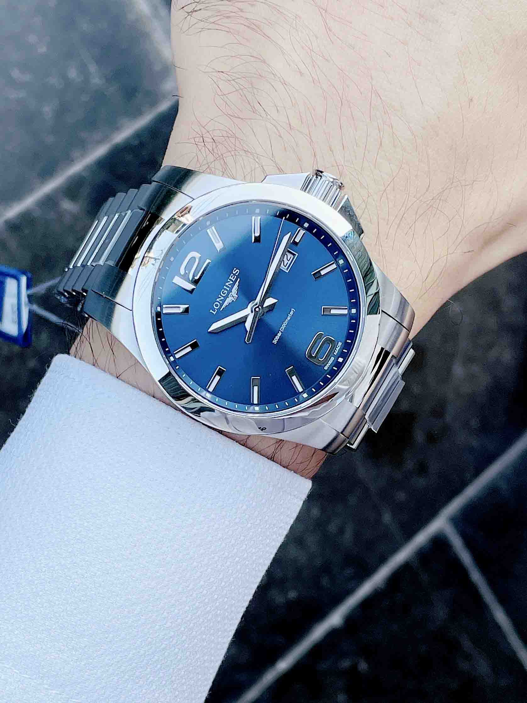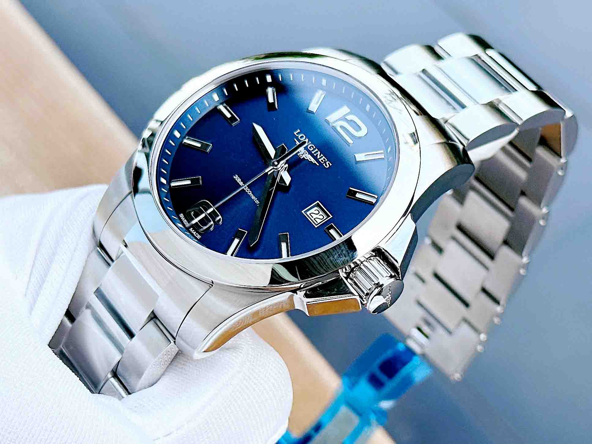 Mẫu đồng hồ xuất xứ Thụy Sĩ nổi bật với mặt số Xanh lam đi kèm cọc kim dạ quang. Đồng thời có mức chống nước lên đến 300 mét.