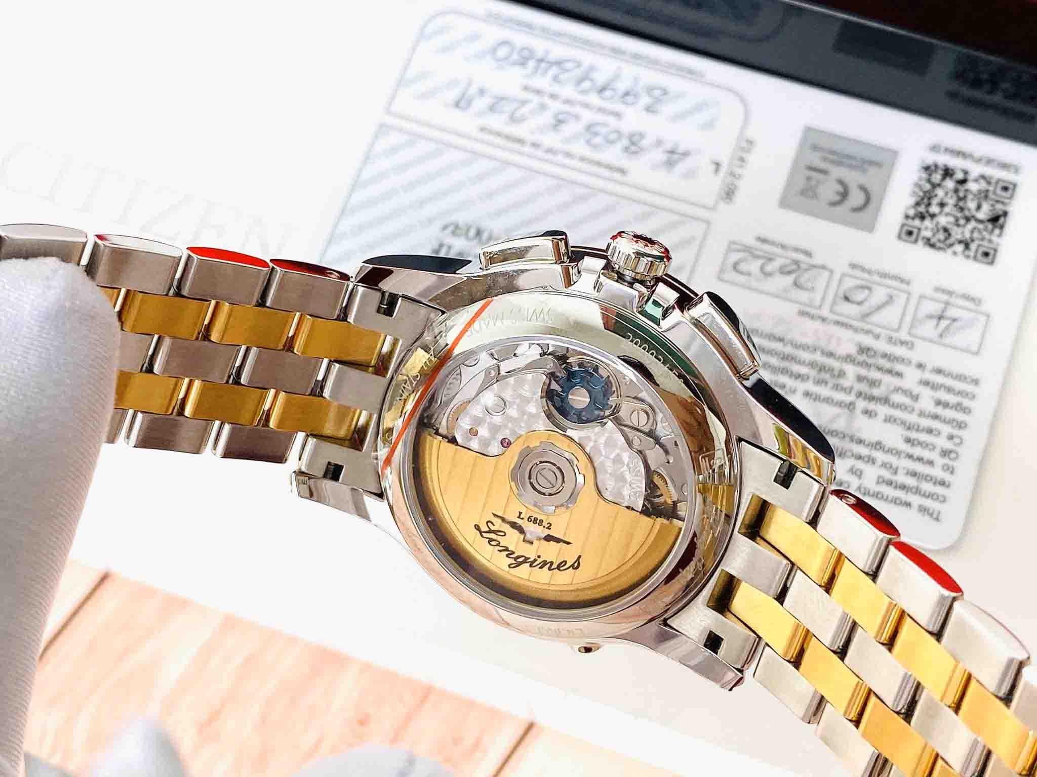– Sử dụng bộ máy cao cấp đời mới Longi.nes Calibre L688.2 (ETA) với column wheel chronograph, giờ, phút, giây, với 27 chân kính, tần số dao động 28800 vph và 54h trữ cót