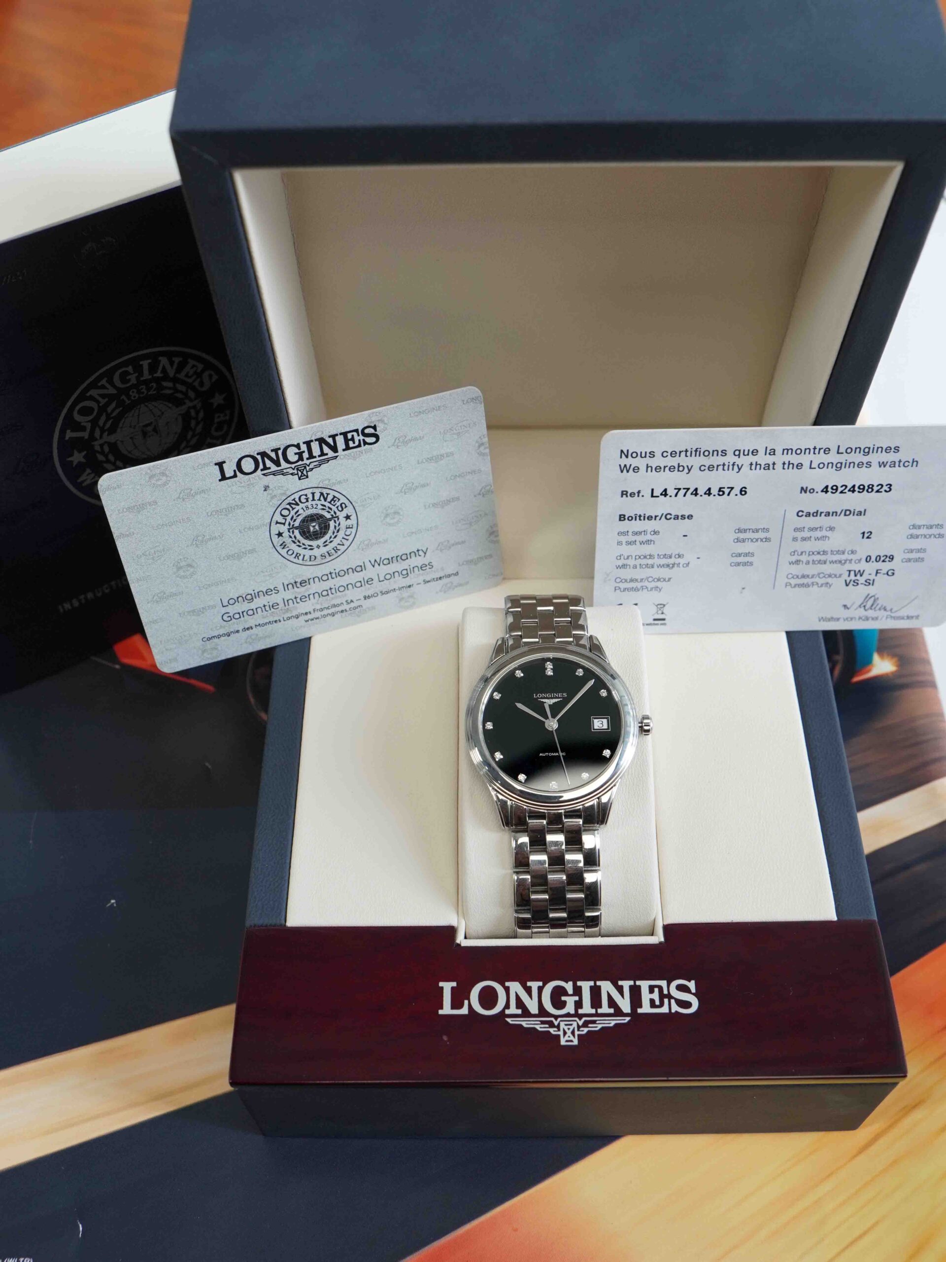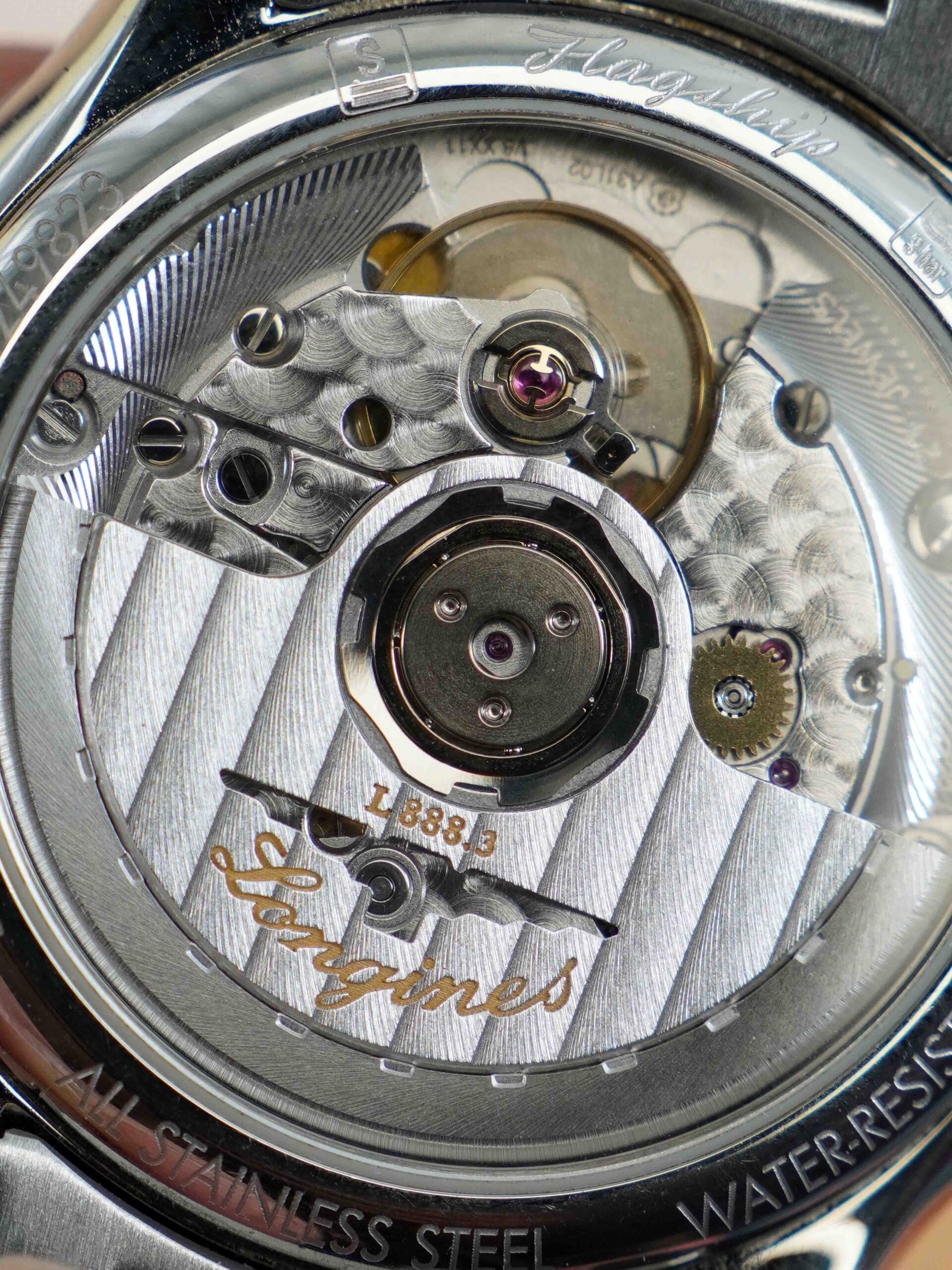 – Bộ truyền động Longines L888.3 (based ETA) với 21 chân kính, 25200 vph & 64h tích cót