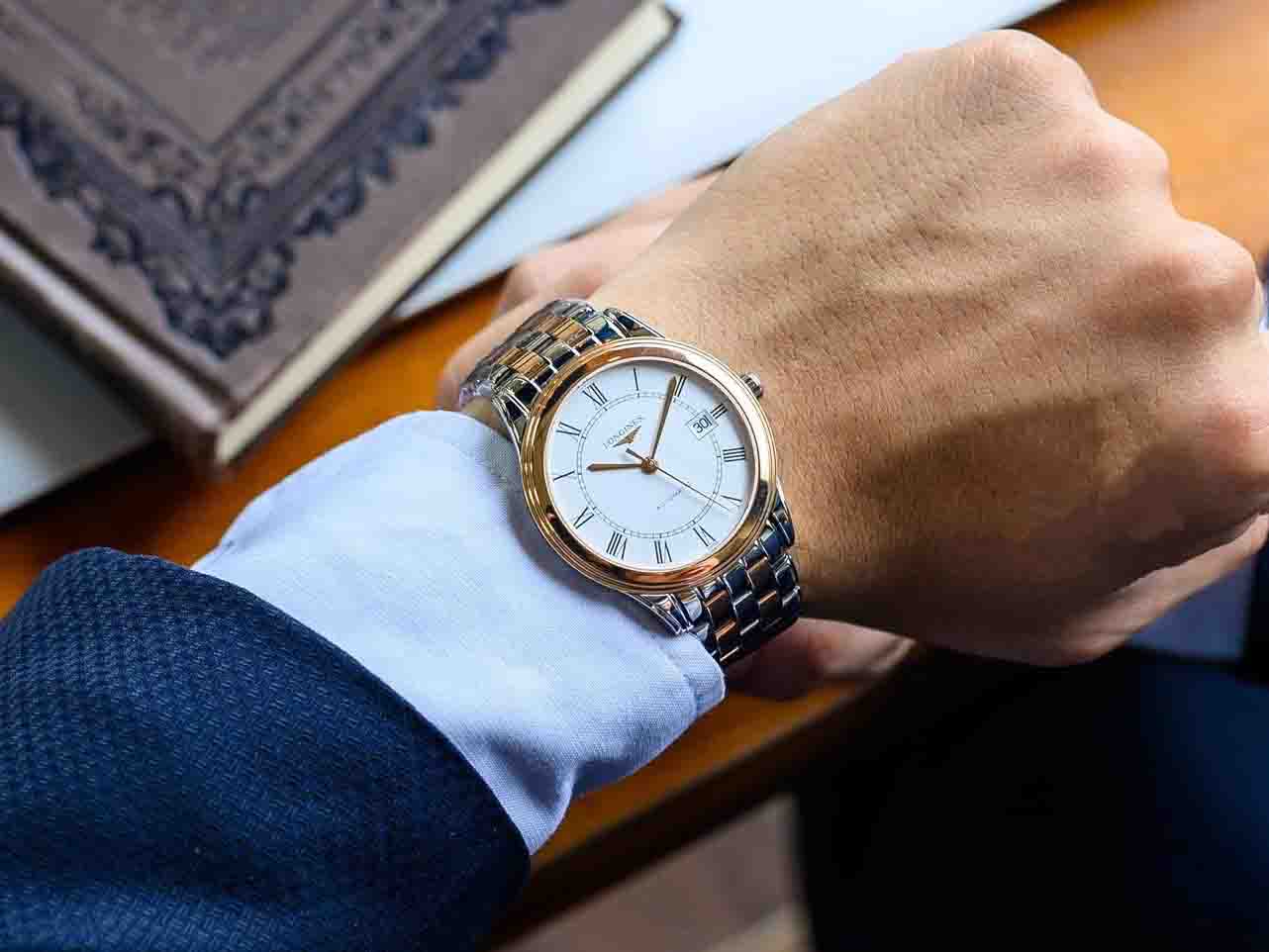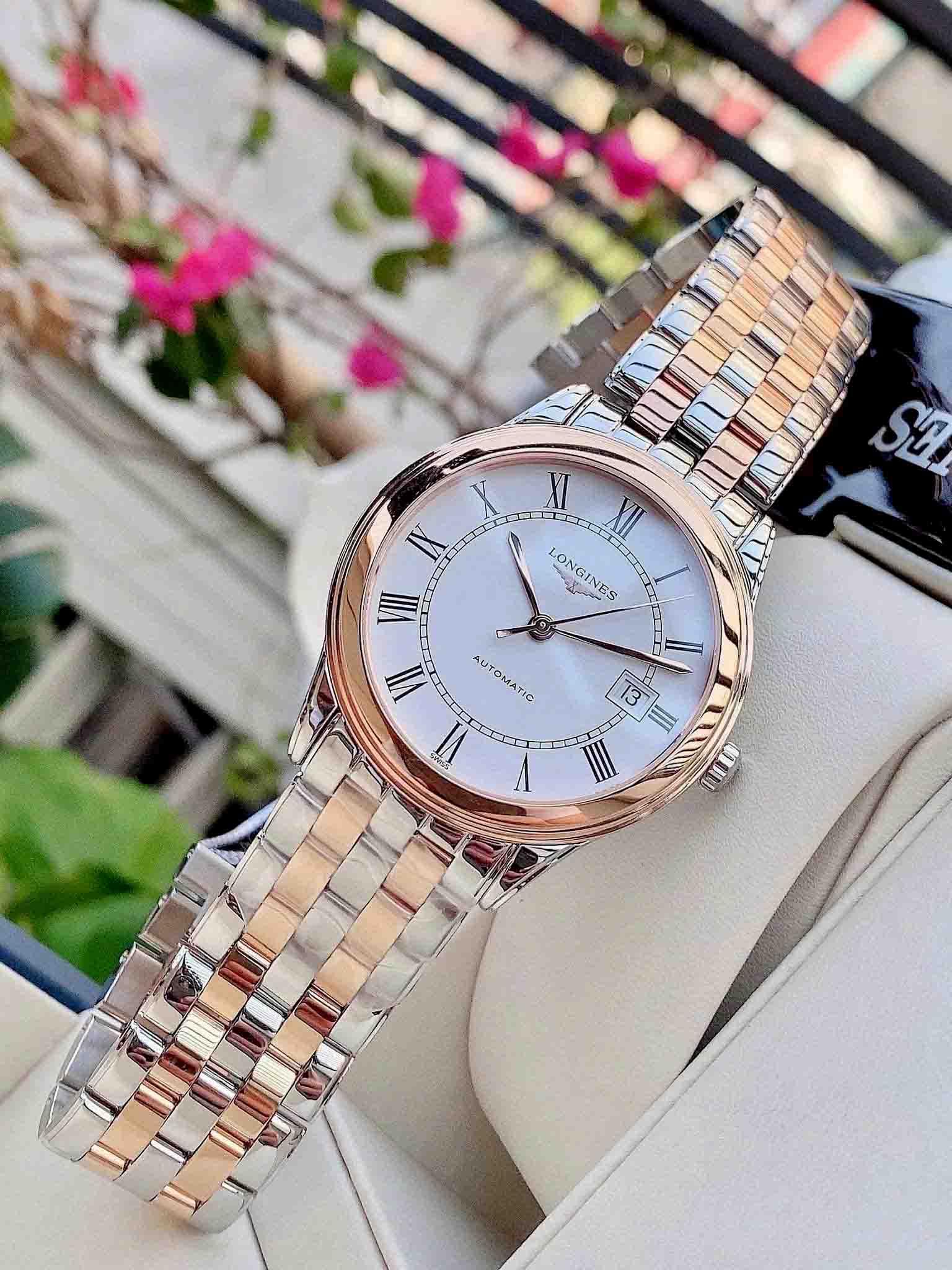 Thiết kế vỏ và dây thép không gỉ demi mạ vàng hồng sang trọng, kim chỉ thanh mảnh tông vàng hồng nổi bật trên nền số màu trắng thanh lịch cùng cọc số La mã đem hơi thở cổ điển tạo nên thiết kế sang trọng hoài cổ dành cho các quý ông.