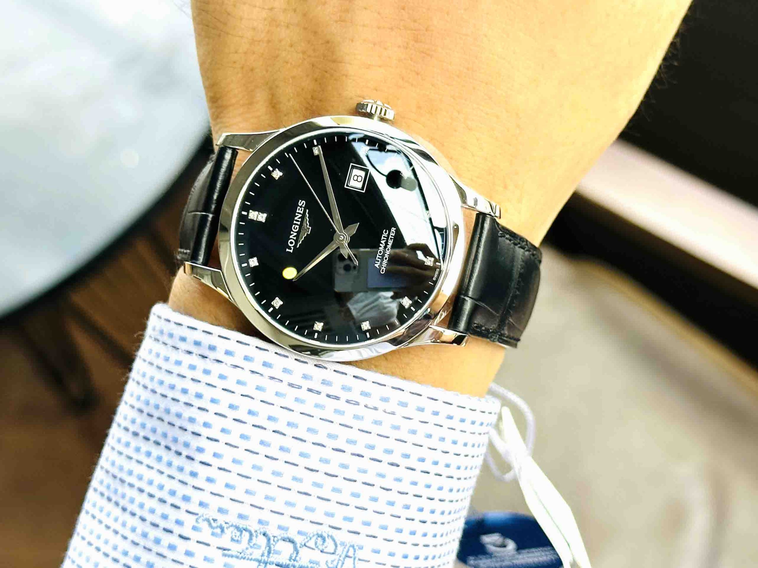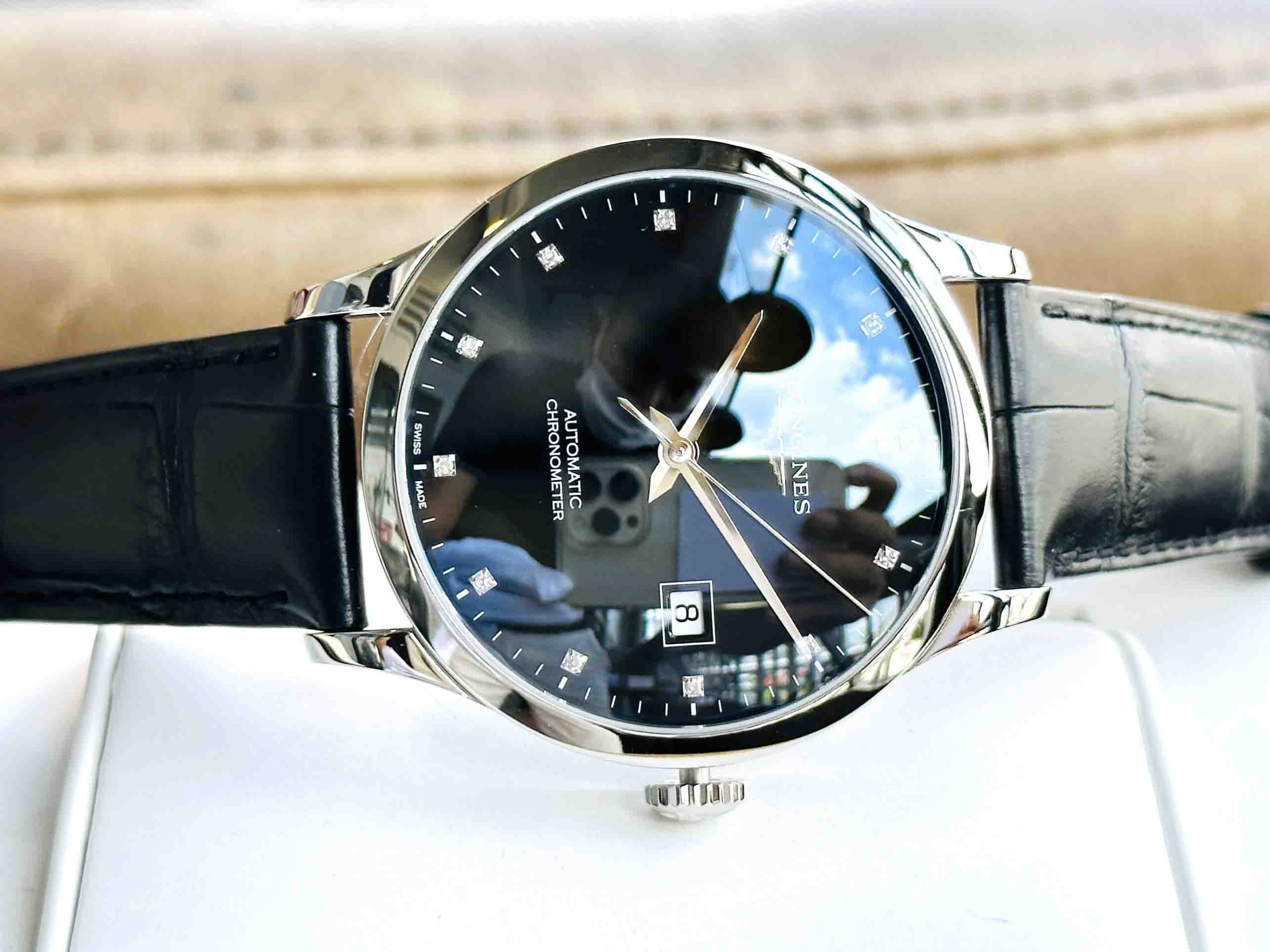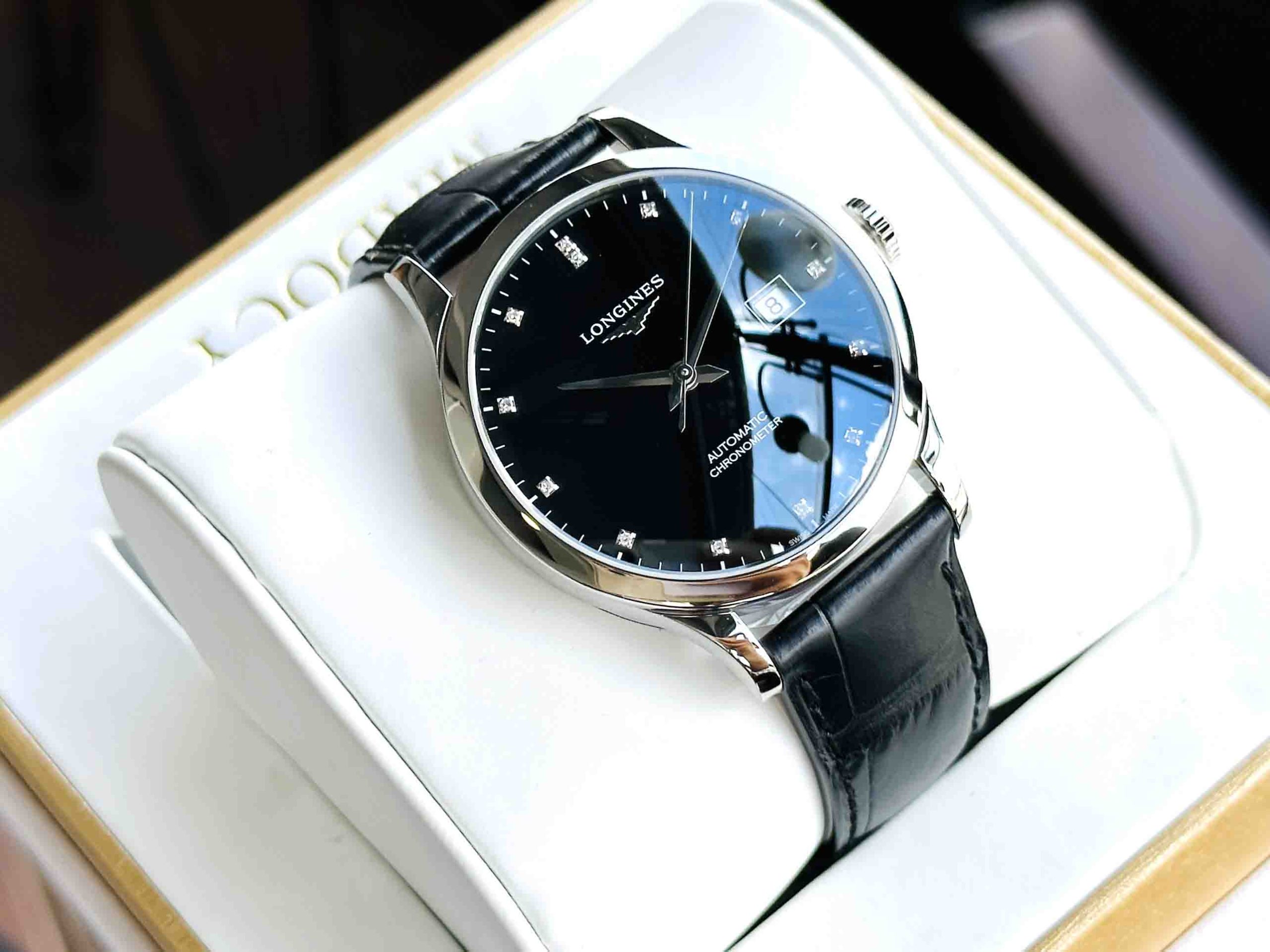 – Dial đen nam tính thiết kế với 3 kim 1 lịch tiện lợi. – -Cọc số đính full kim cương sang trọng.