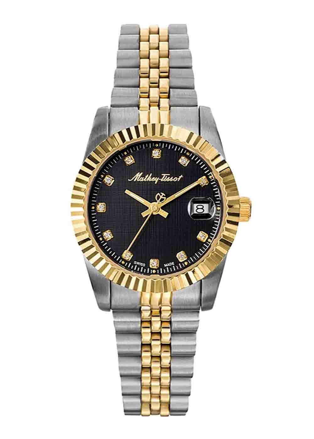 Đồng hồ Mathey Tissot D810BN với thiết kế mặt tròn đầy được bao bọc bởi lớp niềng khía mạ vàng PVD sang trọng kết hợp bộ kim cùng tone được chau chuốt tỉ mỉ