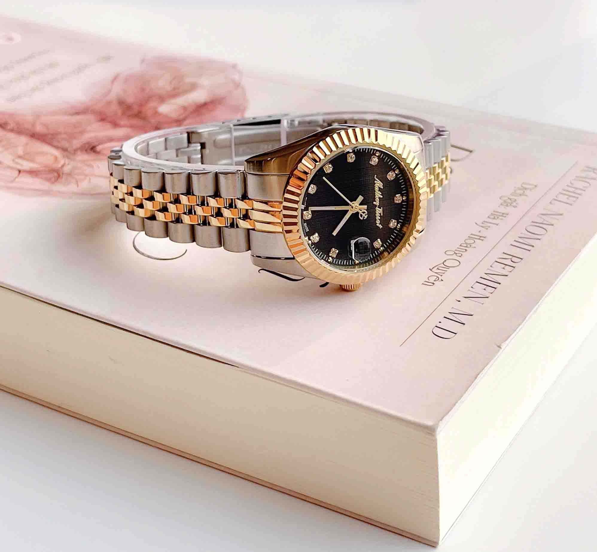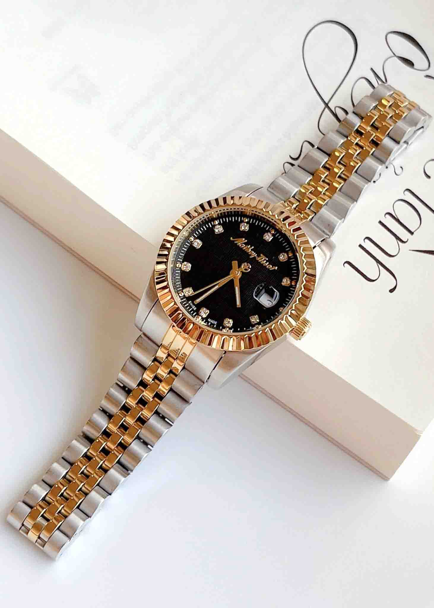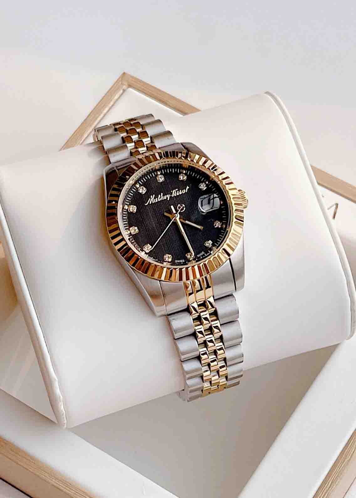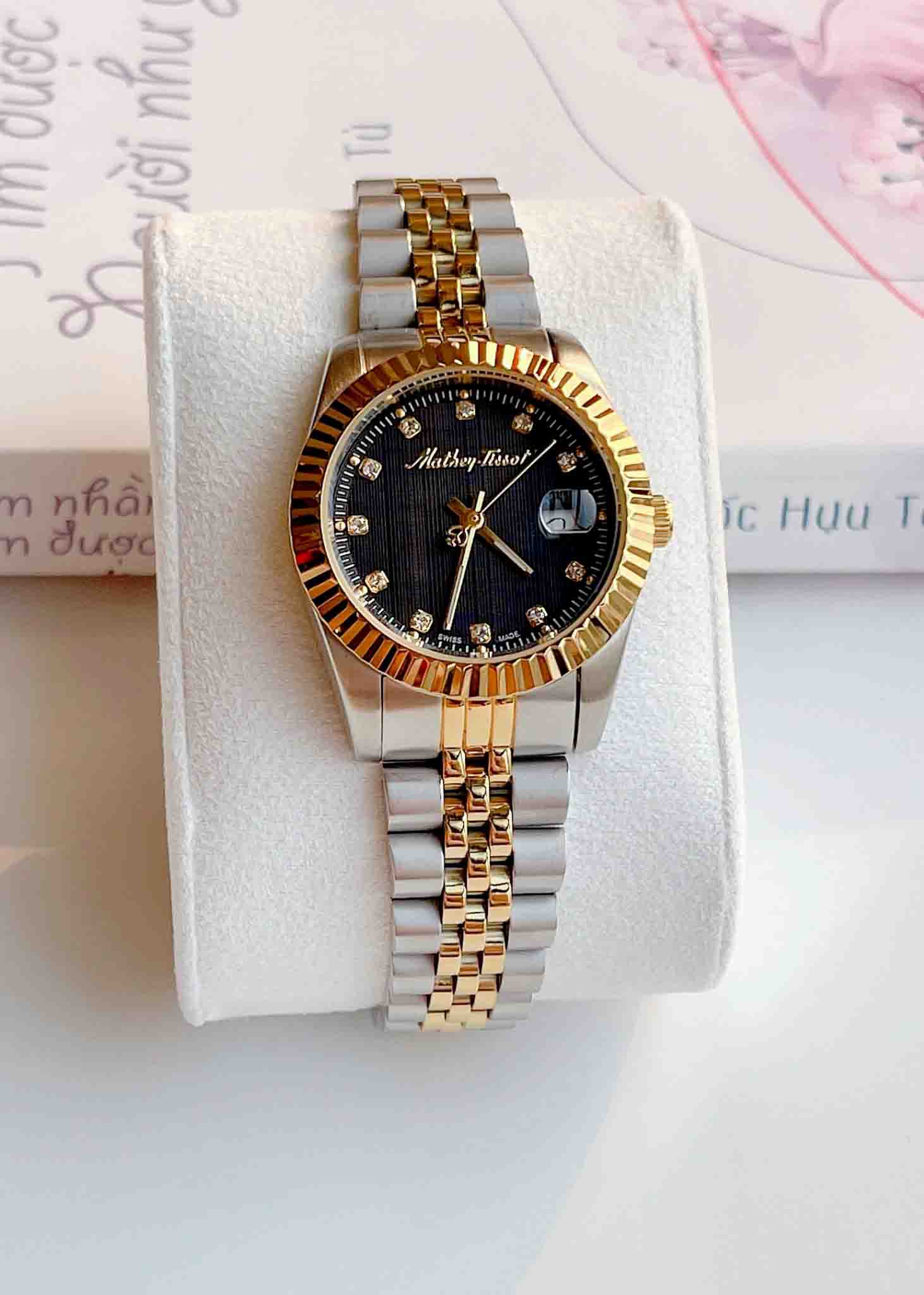 Đồng hồ Mathey Tissot D810BN với thiết kế mặt tròn đầy được bao bọc bởi lớp niềng khía mạ vàng PVD sang trọng kết hợp bộ kim cùng tone được chau chuốt tỉ mỉ