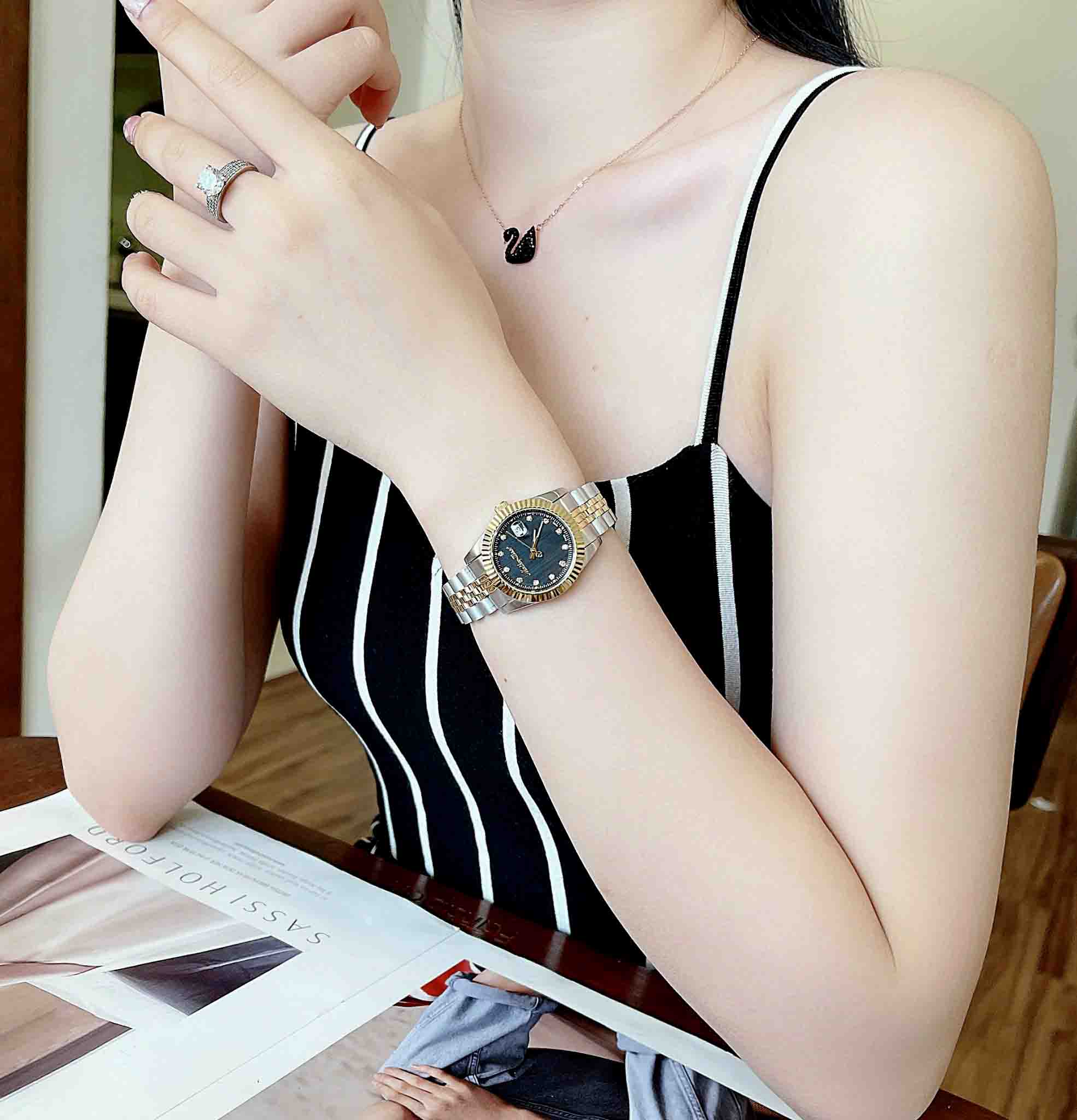 Các cọc số đính đá nổi bật trên nền mặt đen. Dây đeo dạng mắt xích được đan cài tinh tế, nhẹ nhàng ôm trọn tay khi đeo