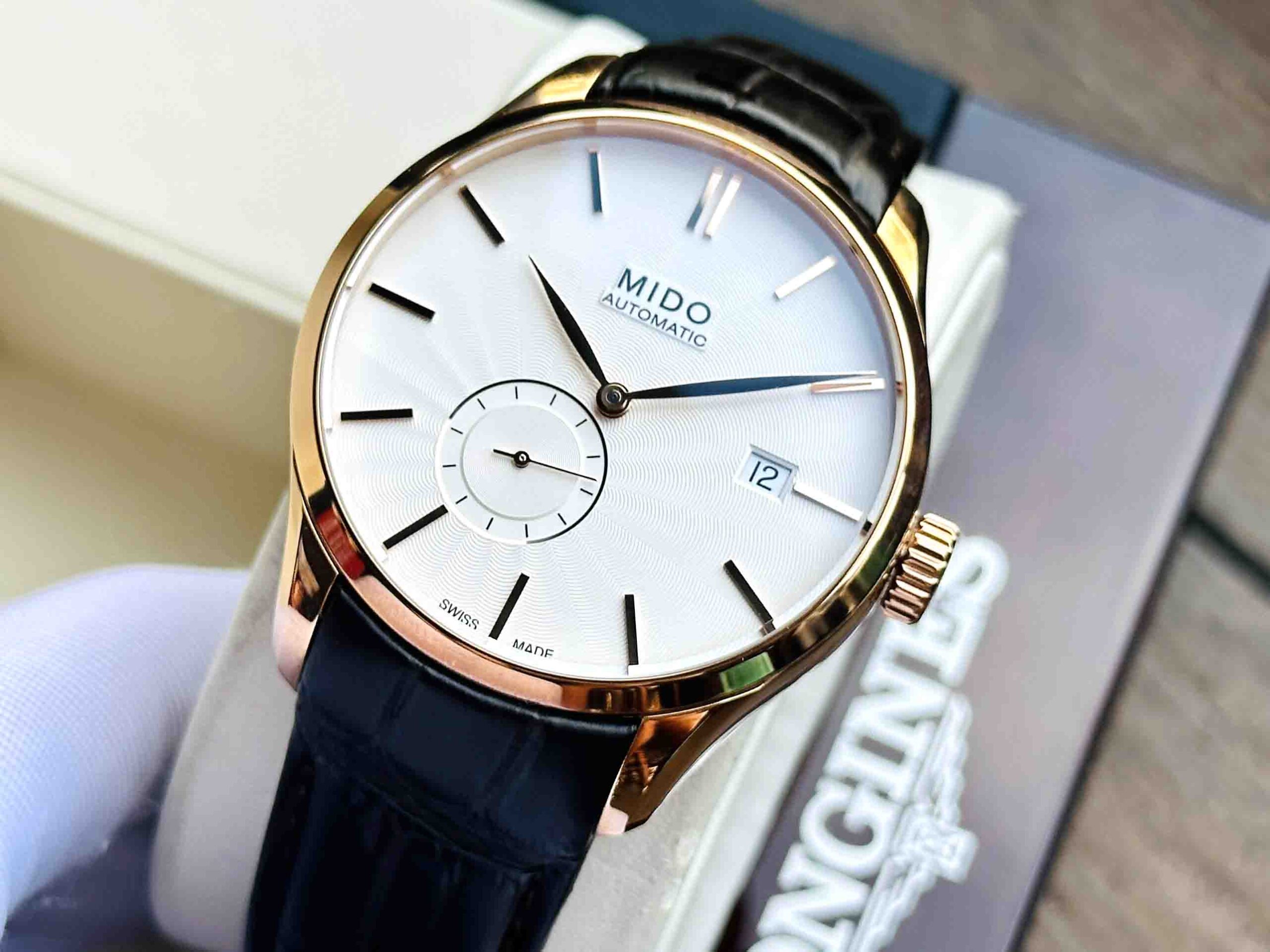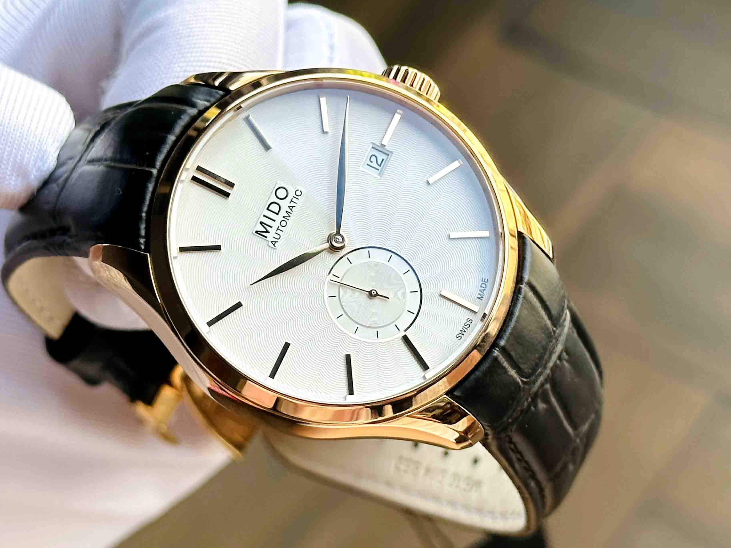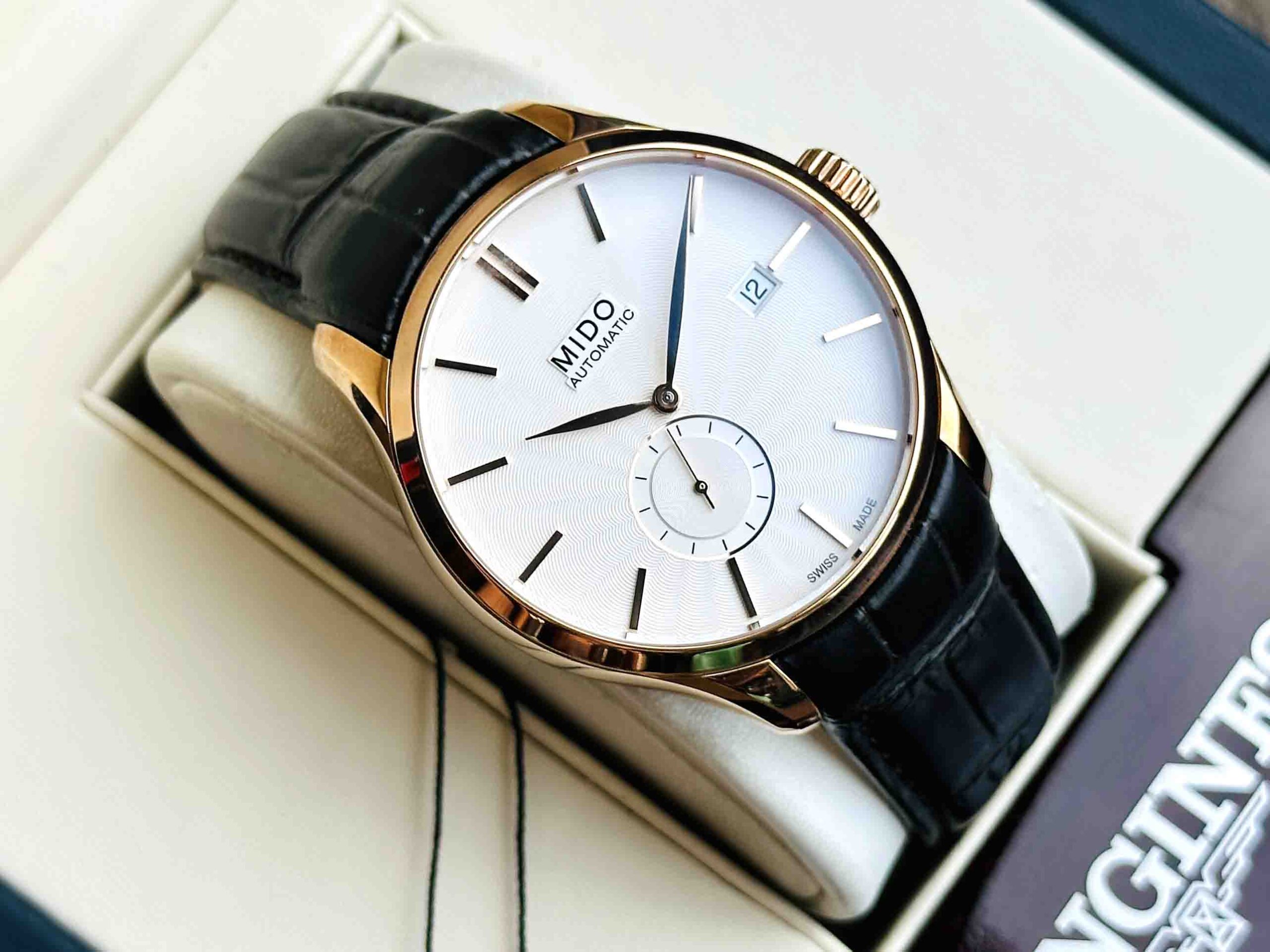 – Bộ truyền động Mido Caliber 80 với 25 chân kính, 21600 vph & 80h tích cót