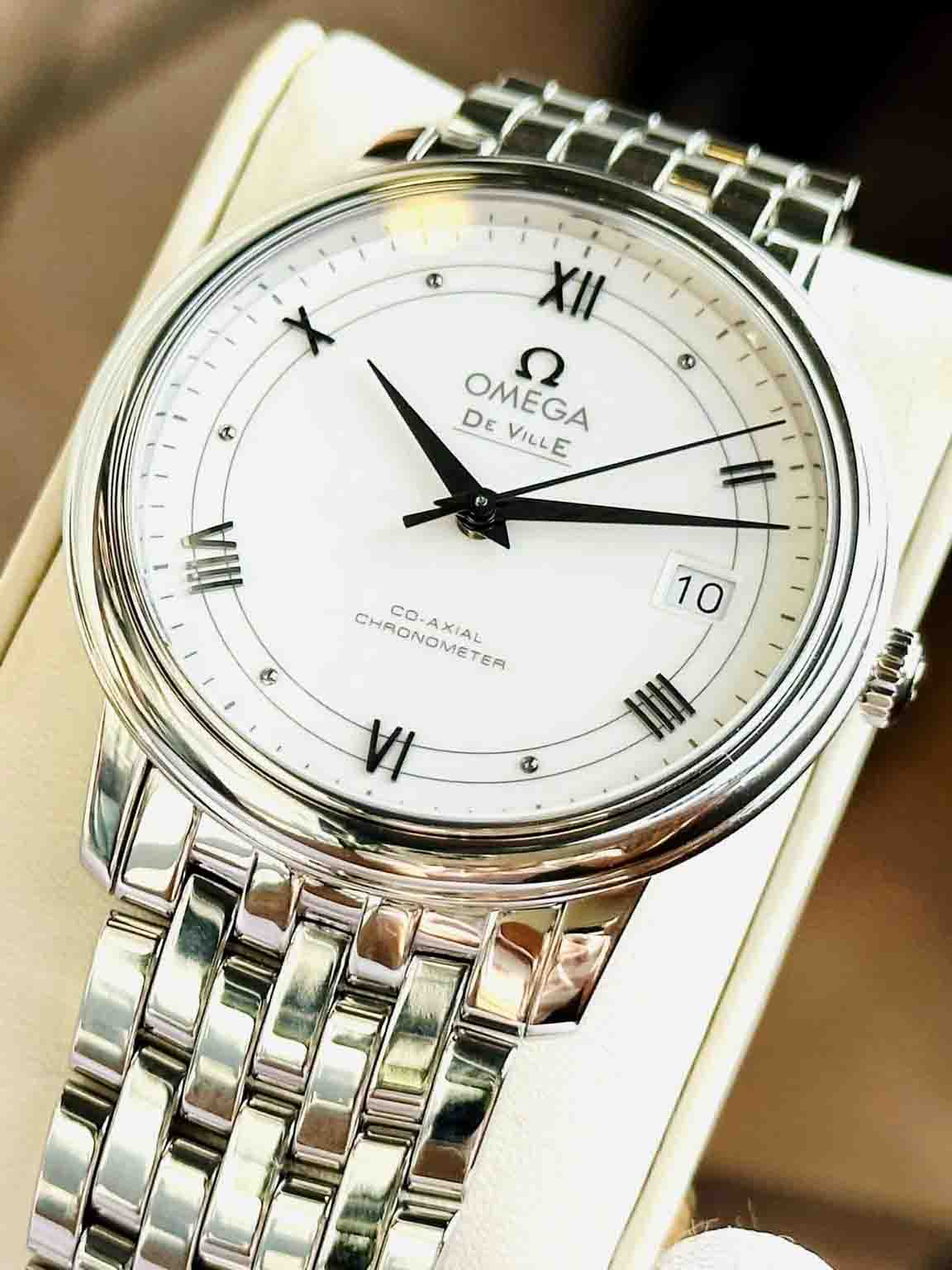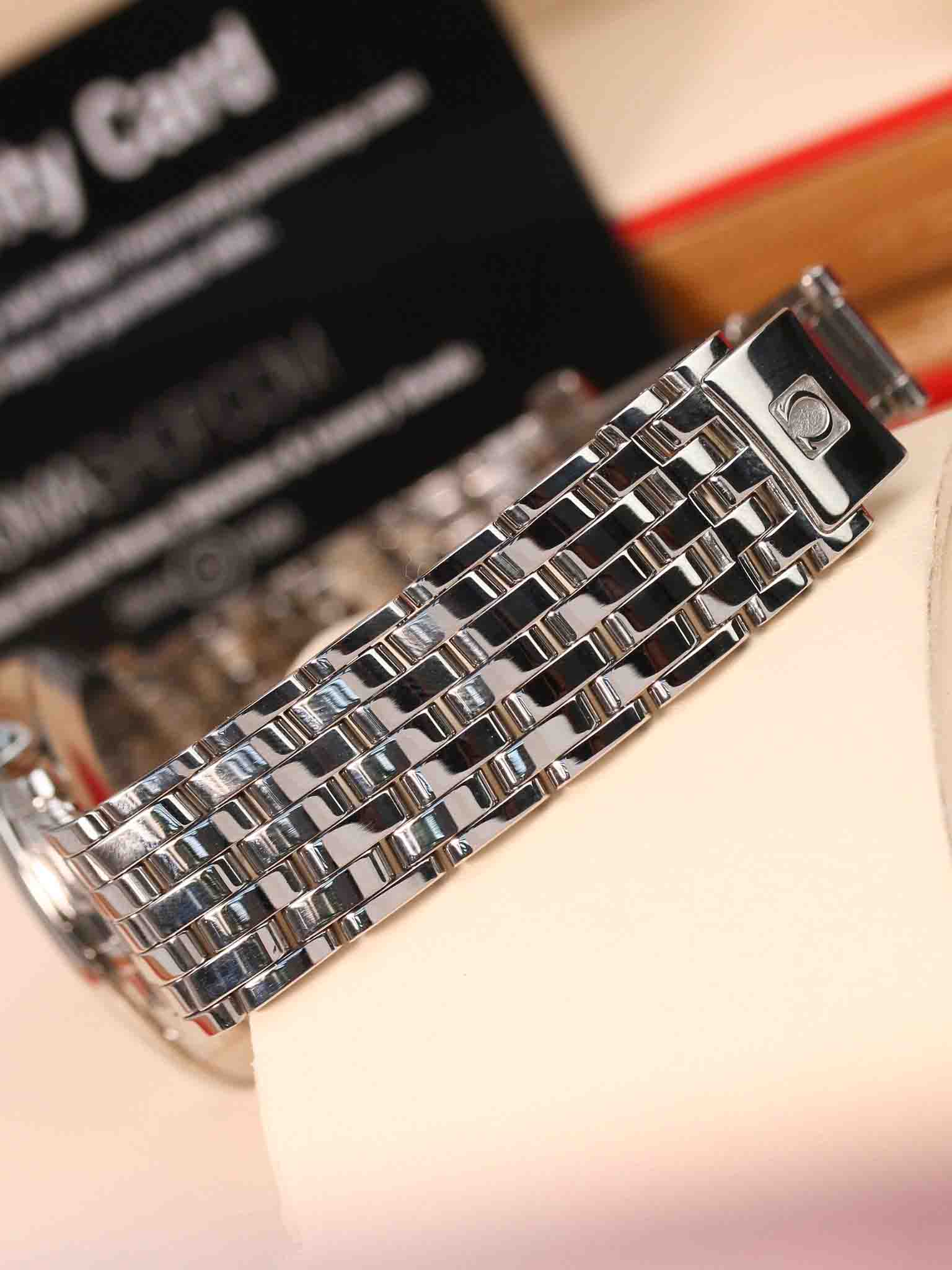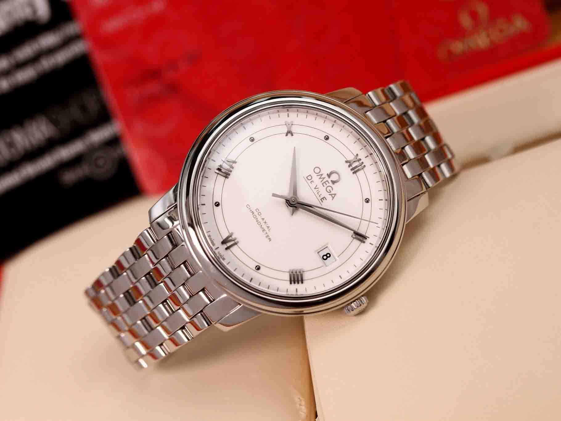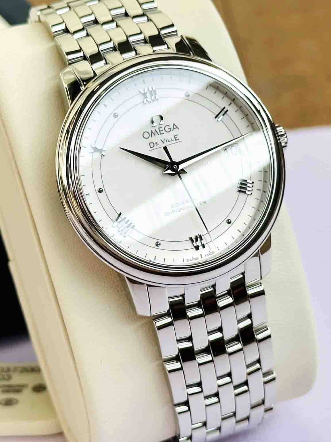 Mẫu Omega thiết kế thanh lịch đơn giản. Kim và cọc số thiết kế nổi khối trên mặt số trắng
