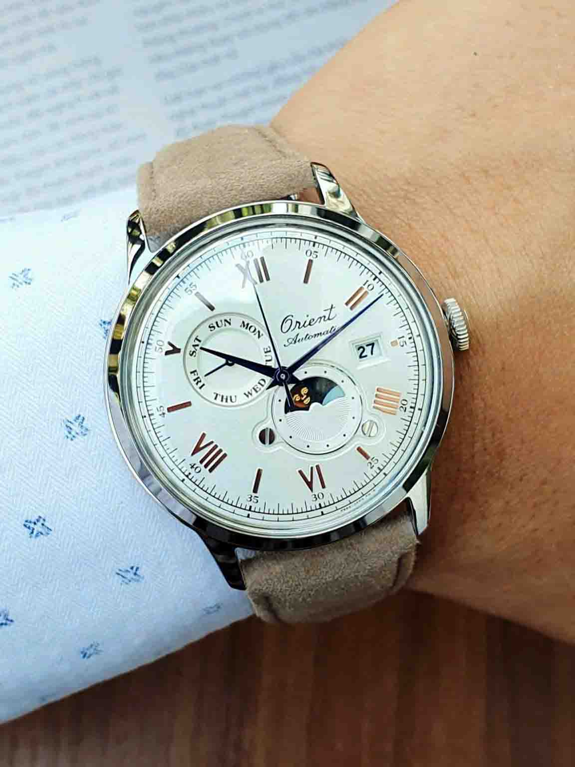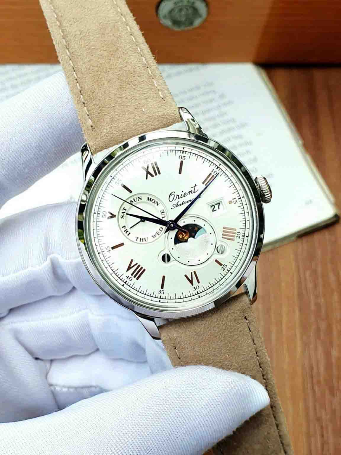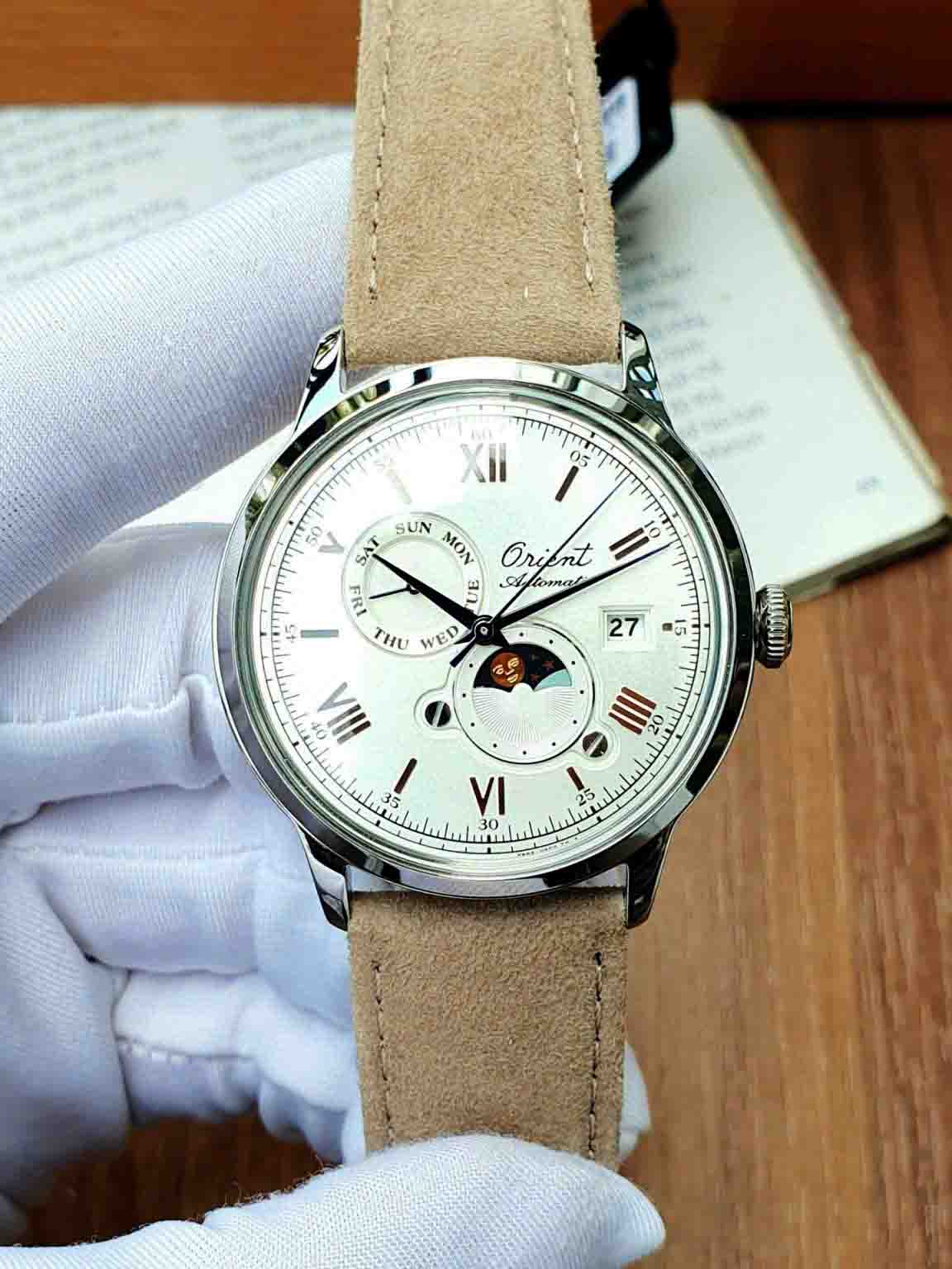 Sự kết hợp giữa mặt kính cong, thiết kế vintage với lịch Sun & Moon để tạo nên 1 kiệt tác của thời gian _ mang tới trải nghiệm chưa từng có cho những mẫu đồng hồ đến từ dòng sản phẩm Classic Bambino Sun & Moon của Orient.