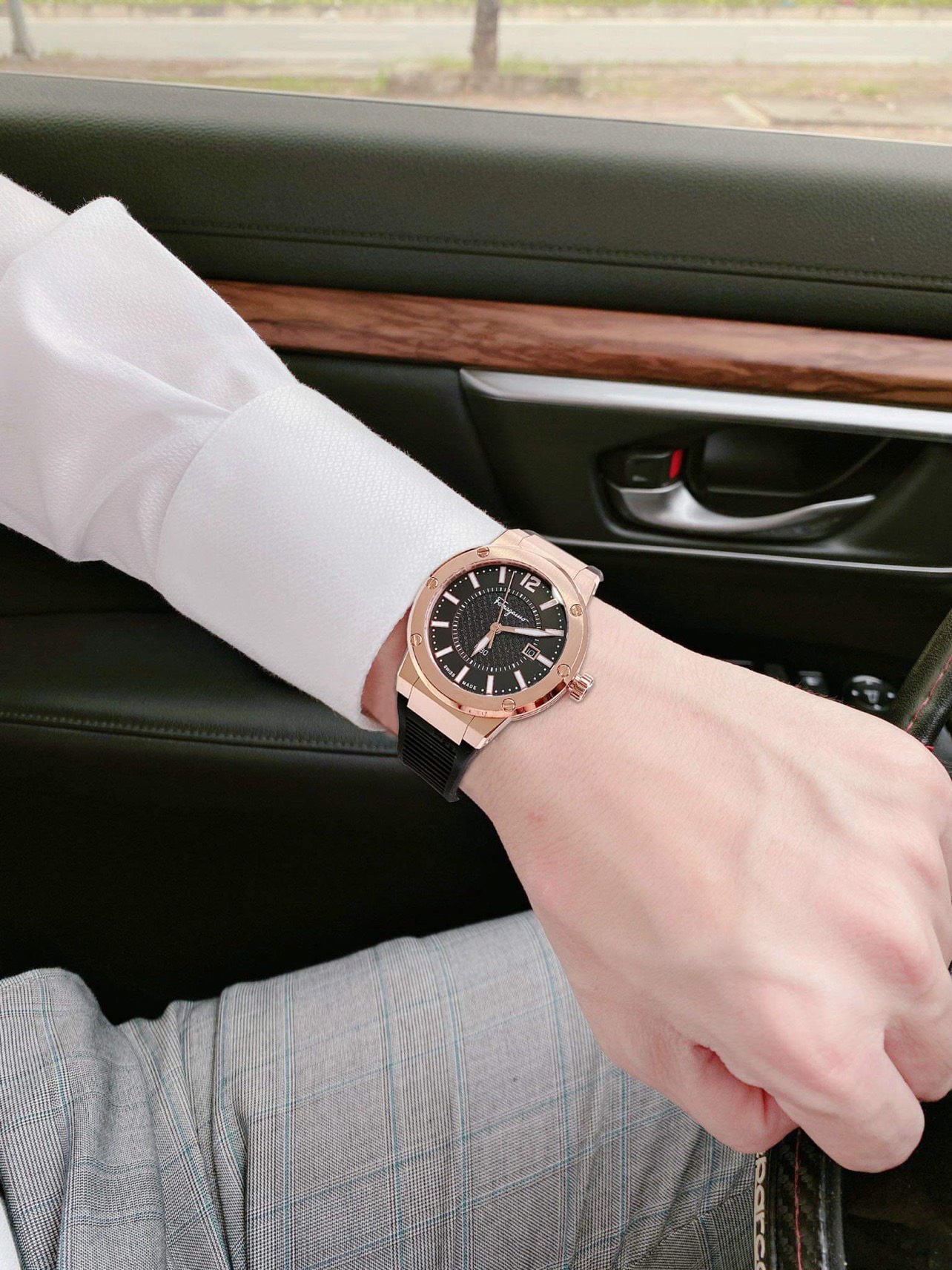 Mặt đồng hồ nền đen, viền thép không gỉ rose, điểm đinh tán