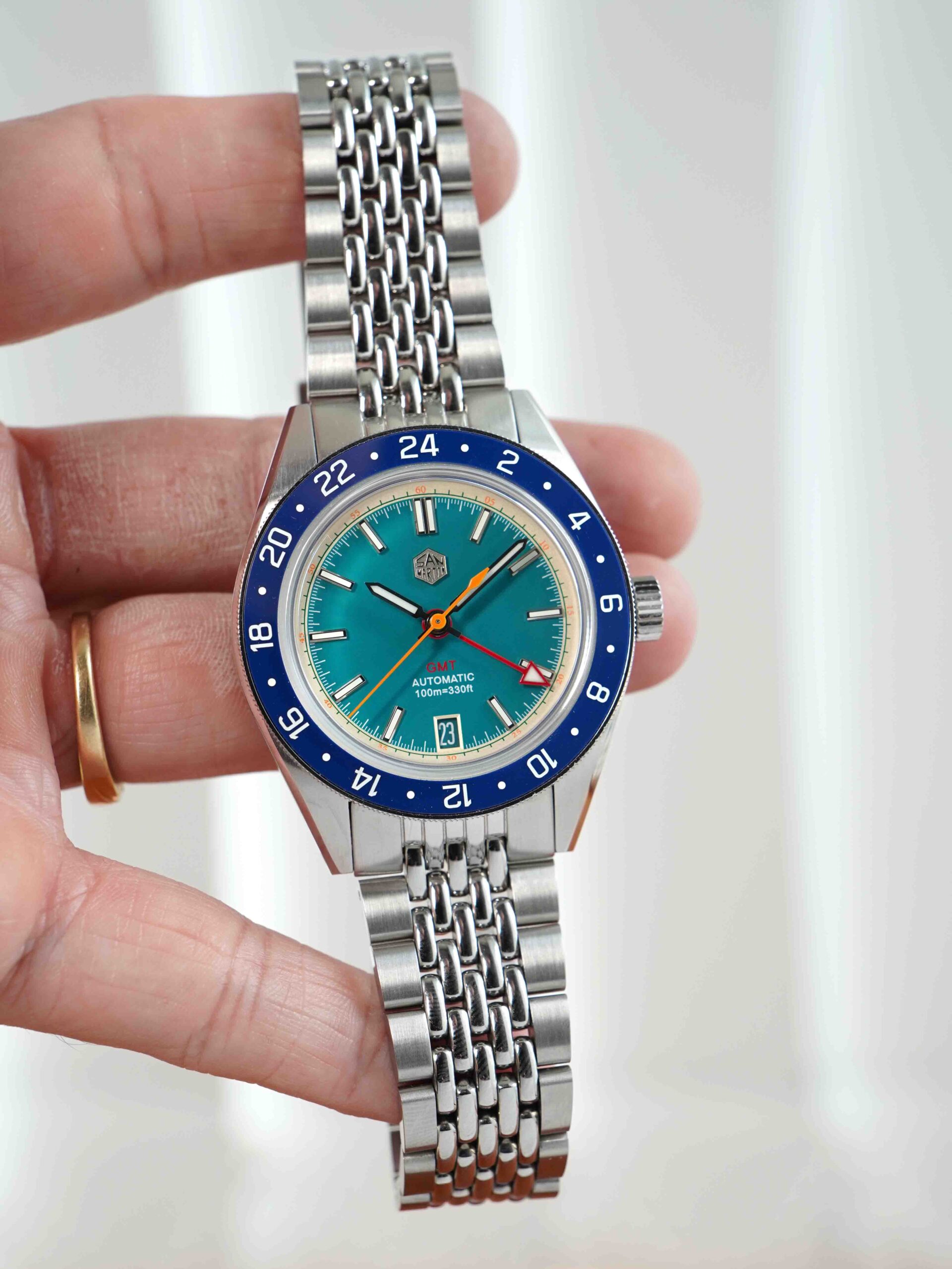 Sở hữu combo hoành tráng nhưng giá chỉ dưới 5 chẹo : kính sapphire box shape phủ AR , niềng ceramic , máy Nhật . Mã mới ra mắt của nhà San Martin nên sở hữu bộ khóa mới tăng chỉnh hơi bị đã tay. Phối màu mã này cực kỳ tươi trẻ sắc màu và yêu đời : kim giây cam , kim GMT đỏ , nền xanh ngọc viền vàng nhạt.