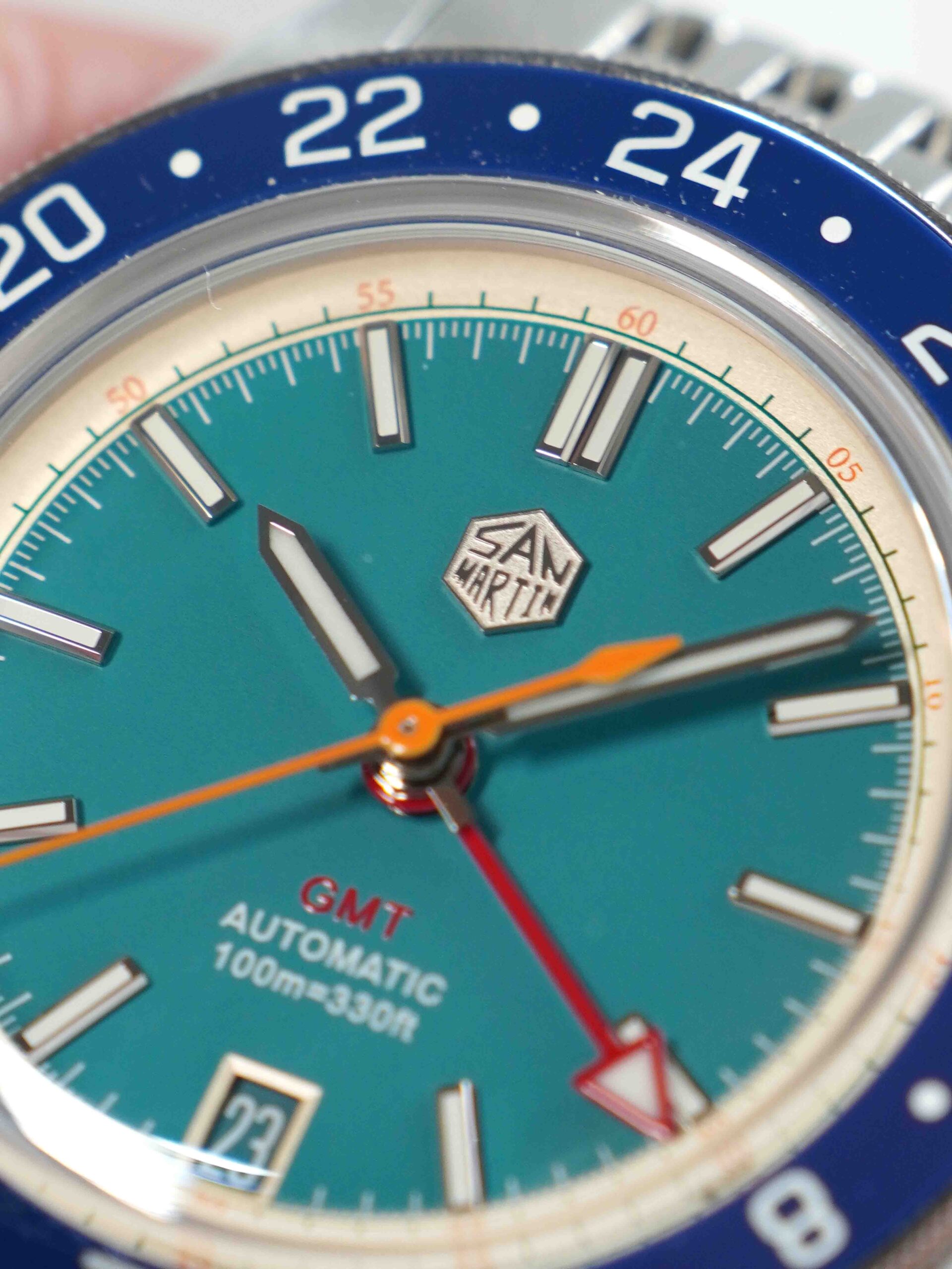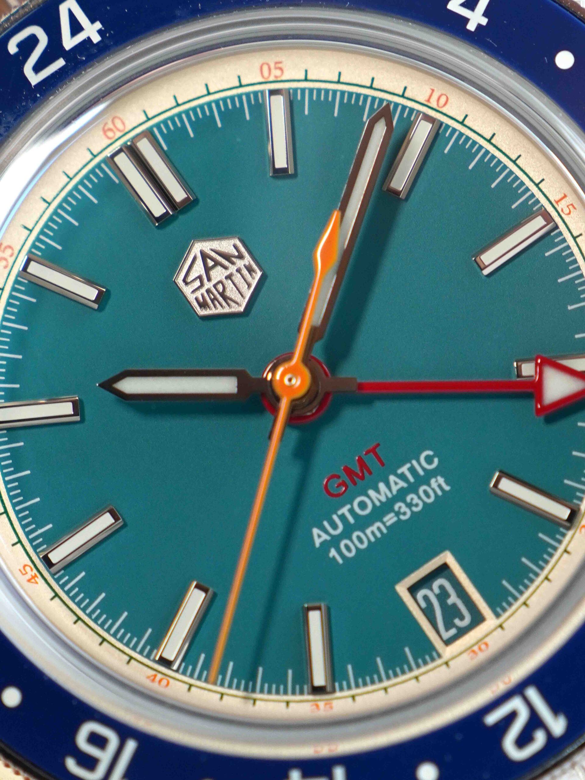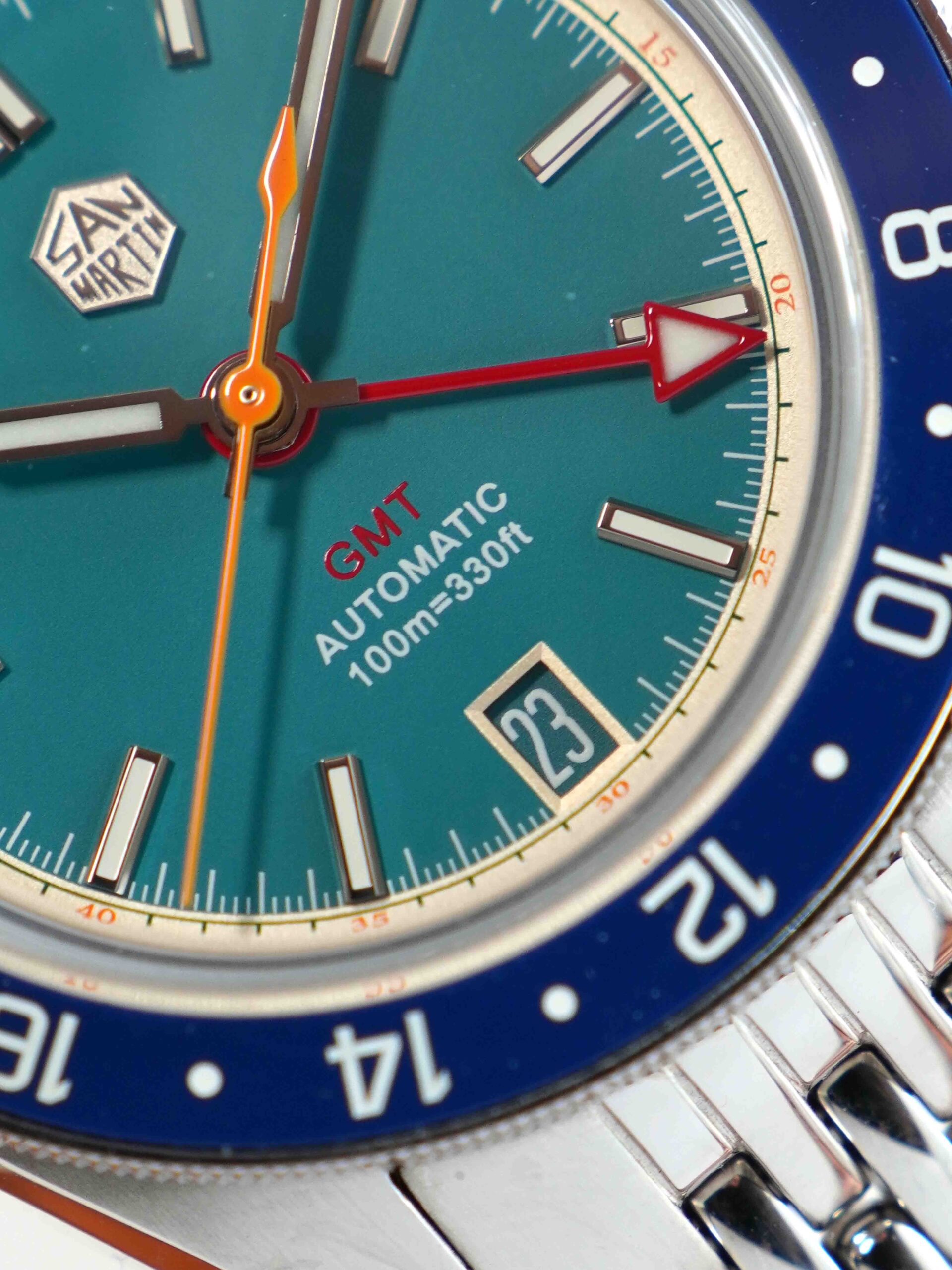 Sở hữu combo hoành tráng nhưng giá chỉ dưới 5 chẹo : kính sapphire box shape phủ AR , niềng ceramic , máy Nhật . Mã mới ra mắt của nhà San Martin nên sở hữu bộ khóa mới tăng chỉnh hơi bị đã tay. Phối màu mã này cực kỳ tươi trẻ sắc màu và yêu đời : kim giây cam , kim GMT đỏ , nền xanh ngọc viền vàng nhạt.