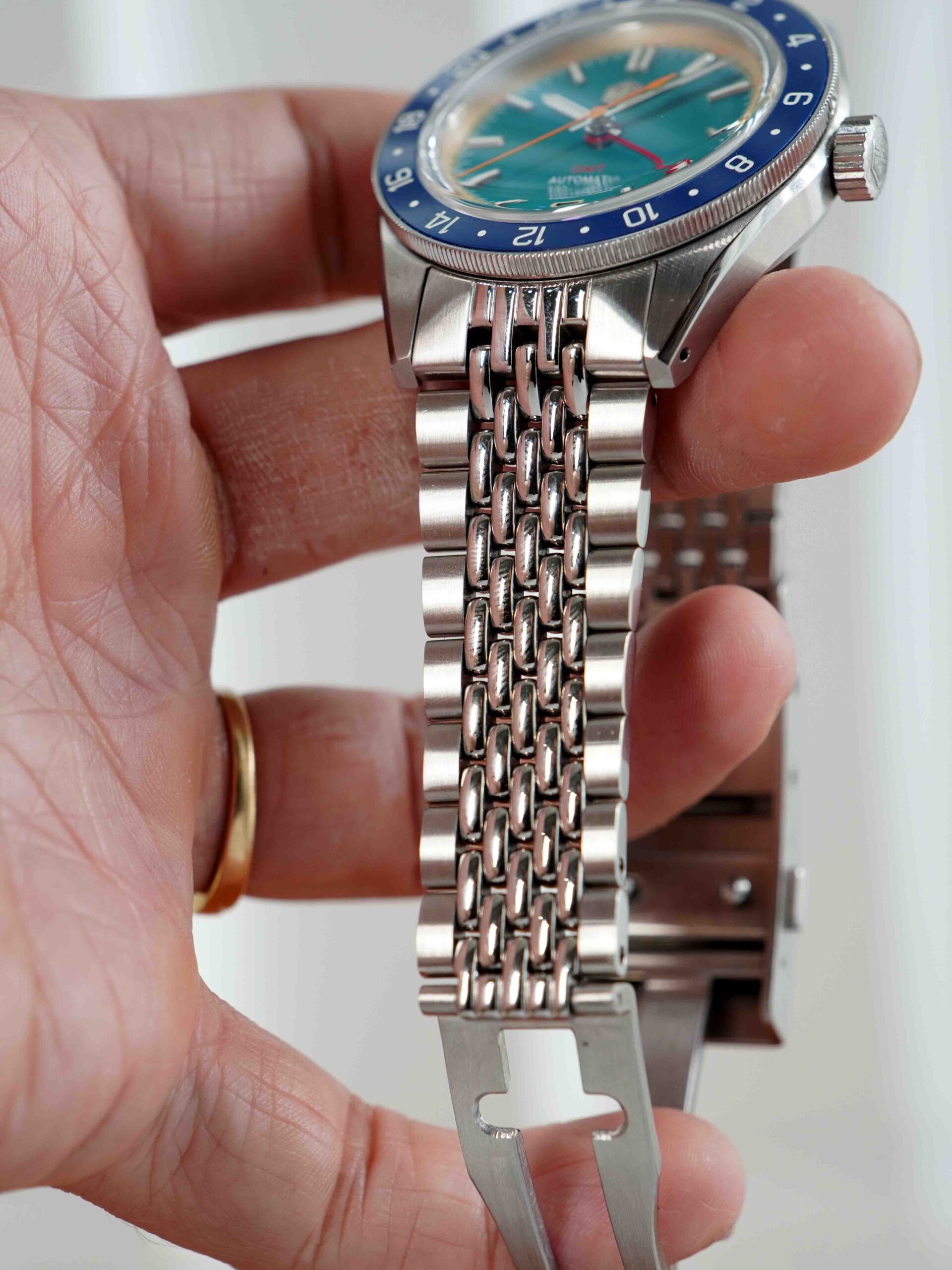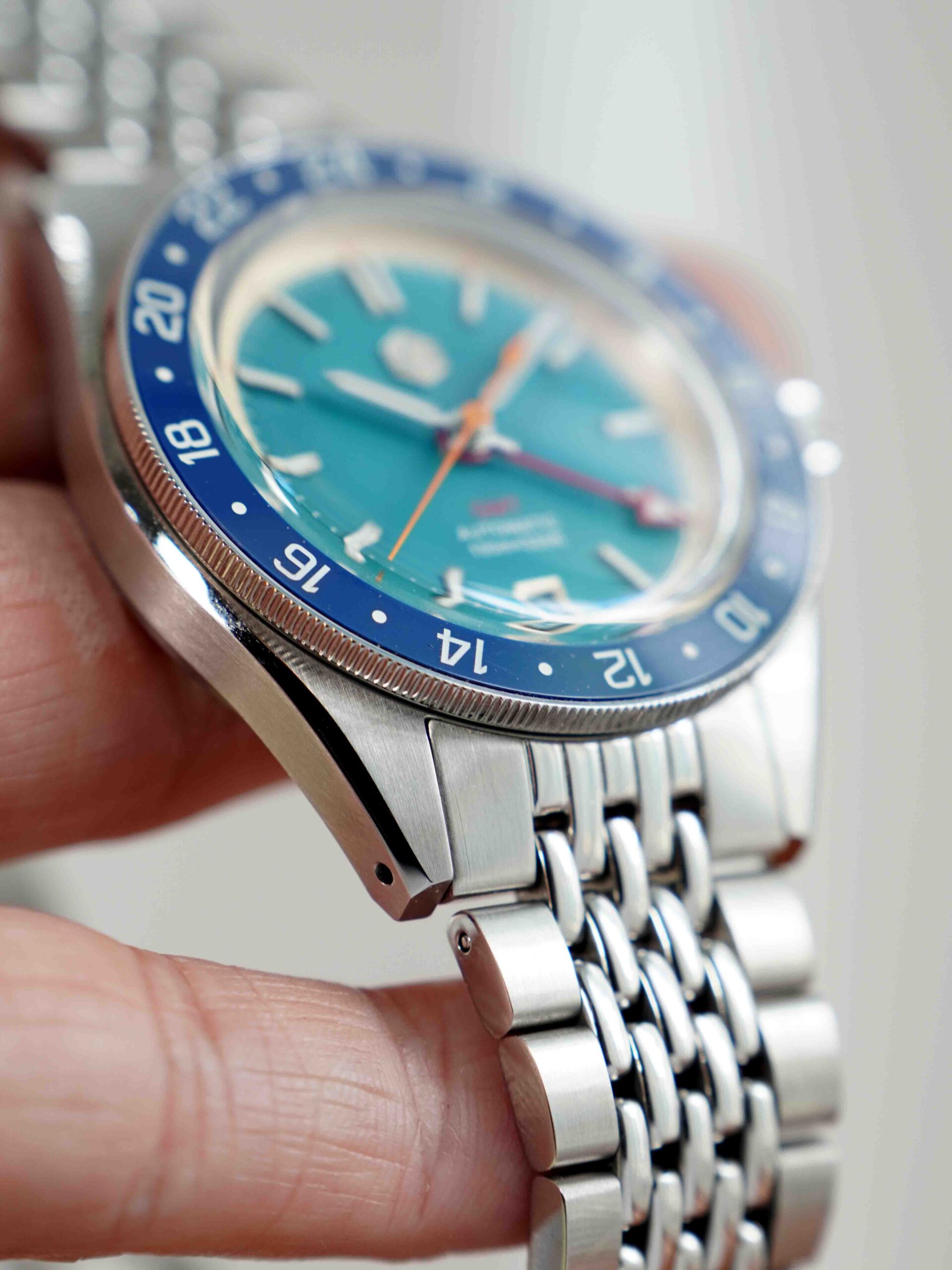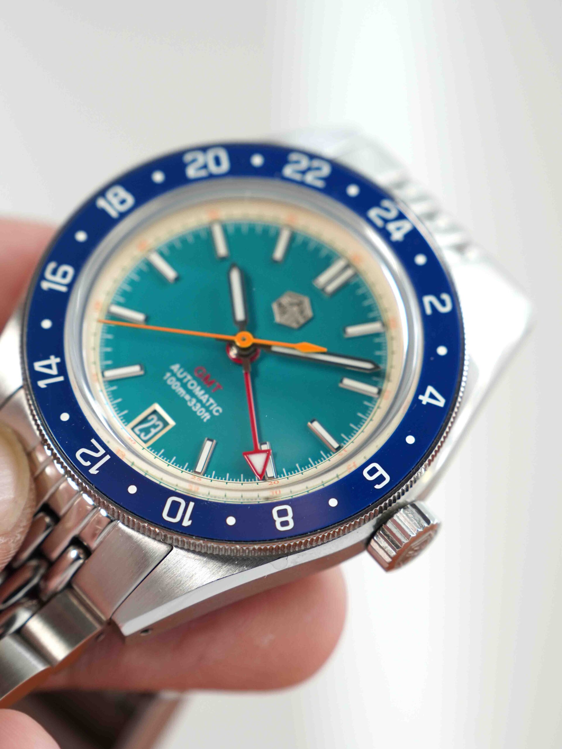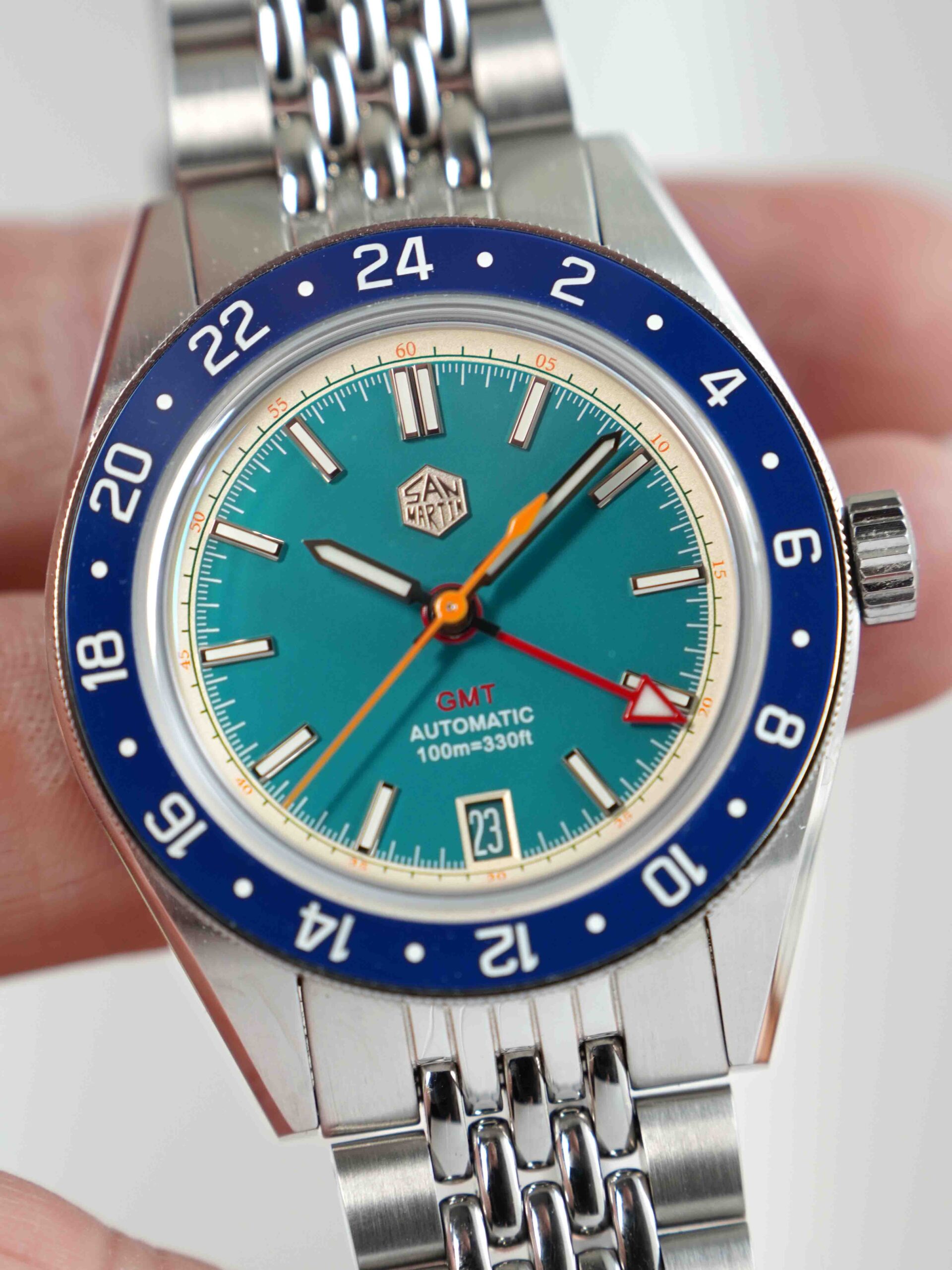Sở hữu combo hoành tráng nhưng giá chỉ dưới 5 chẹo : kính sapphire box shape phủ AR , niềng ceramic , máy Nhật . Mã mới ra mắt của nhà San Martin nên sở hữu bộ khóa mới tăng chỉnh hơi bị đã tay. Phối màu mã này cực kỳ tươi trẻ sắc màu và yêu đời : kim giây cam , kim GMT đỏ , nền xanh ngọc viền vàng nhạt.