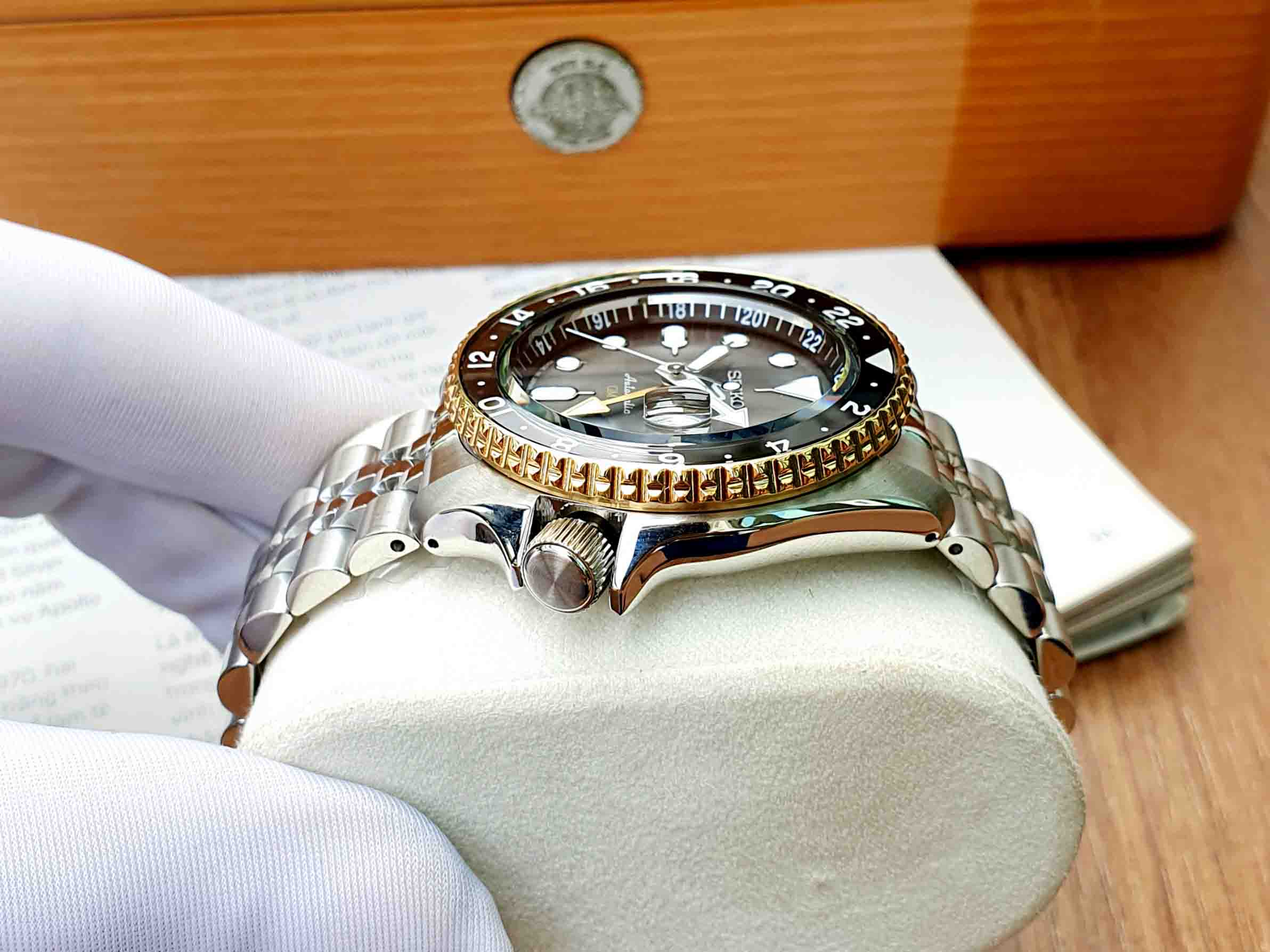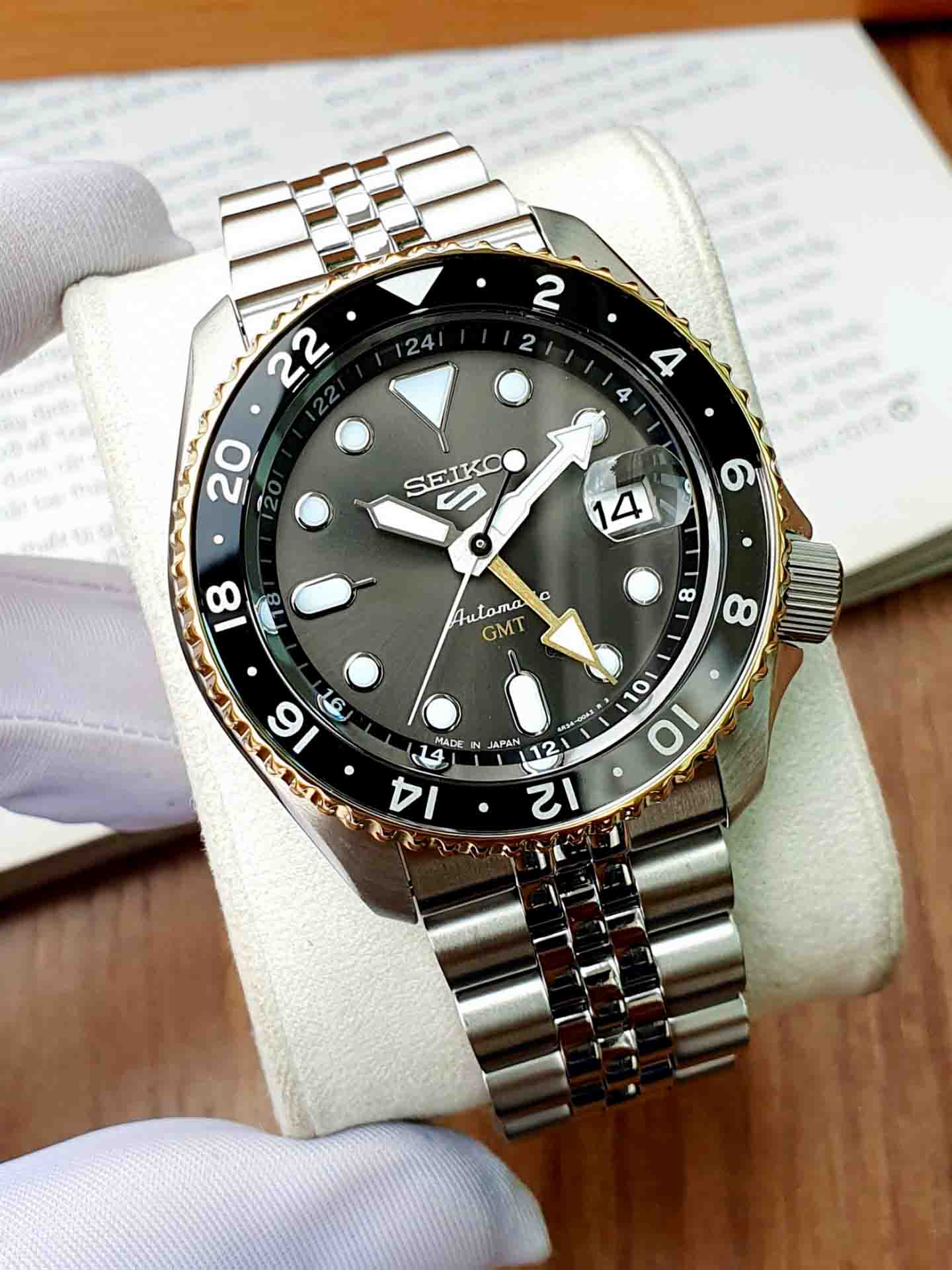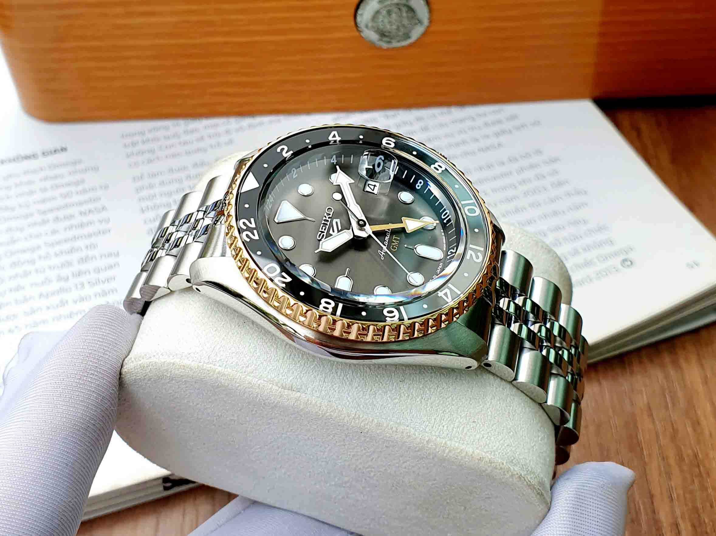 Model mới nhất 2023 của Seiko với thiết kế GMT độc đáo và cực chất cùng bộ dây Jubilee cực ôm tay, ô kính lúp lịch ngày tiện lợi