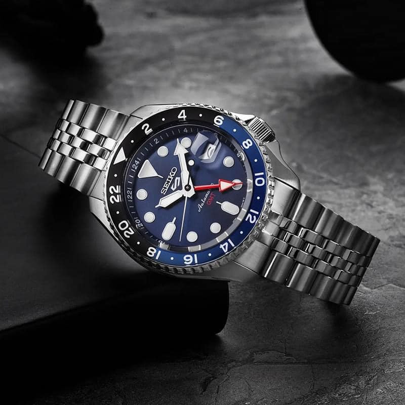 – Model mới nhất 2023 của Seiko với thiết kế GMT độc đáo và cực chất cùng bộ dây Jubilee cực ôm tay, ô kính lúp lịch ngày tiện lợi