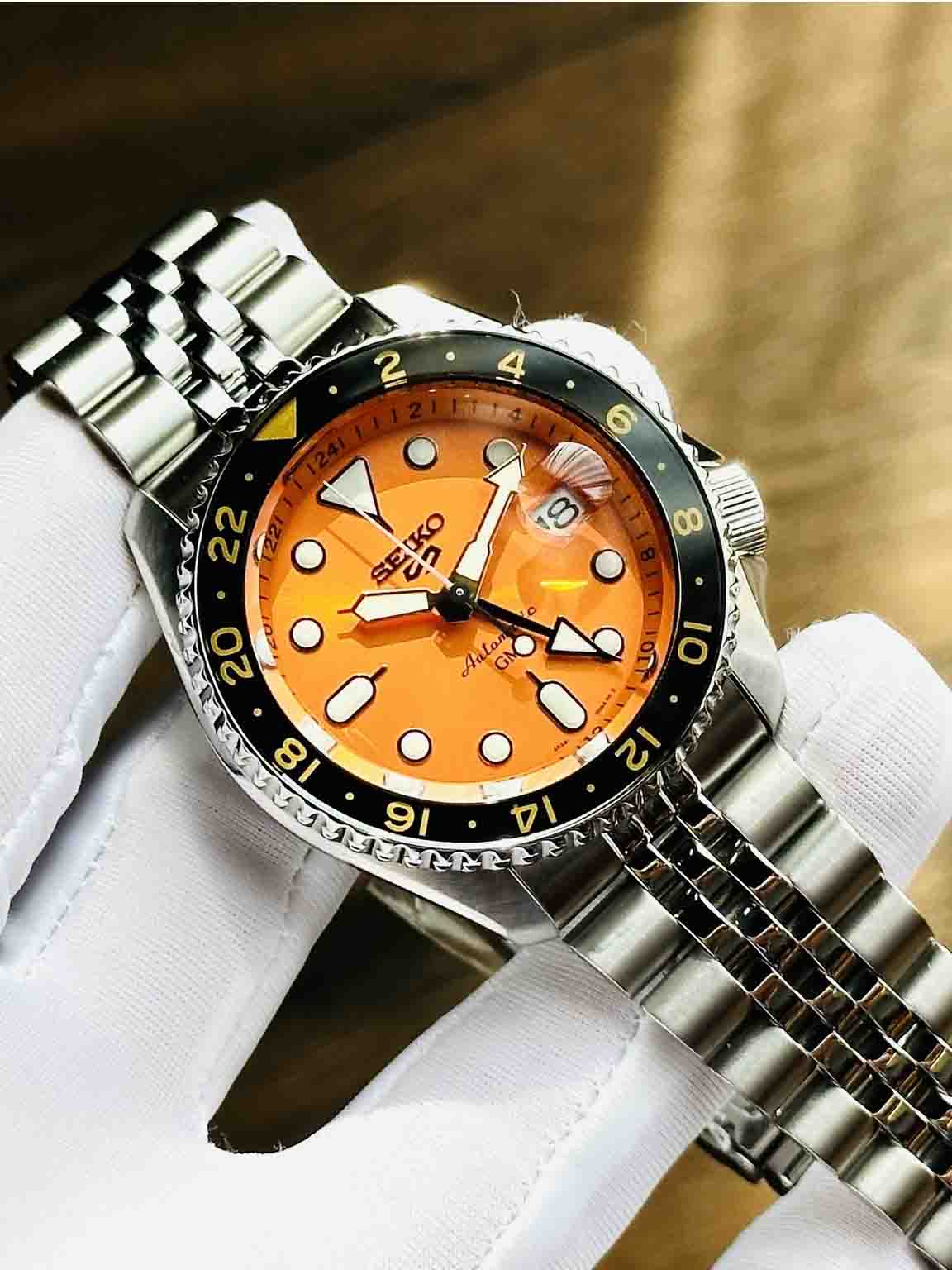 Model mới nhất 2023 của Seiko với thiết kế GMT độc đáo và cực chất cùng bộ dây Jubilee cực ôm tay, ô kính lúp lịch ngày tiện lợi