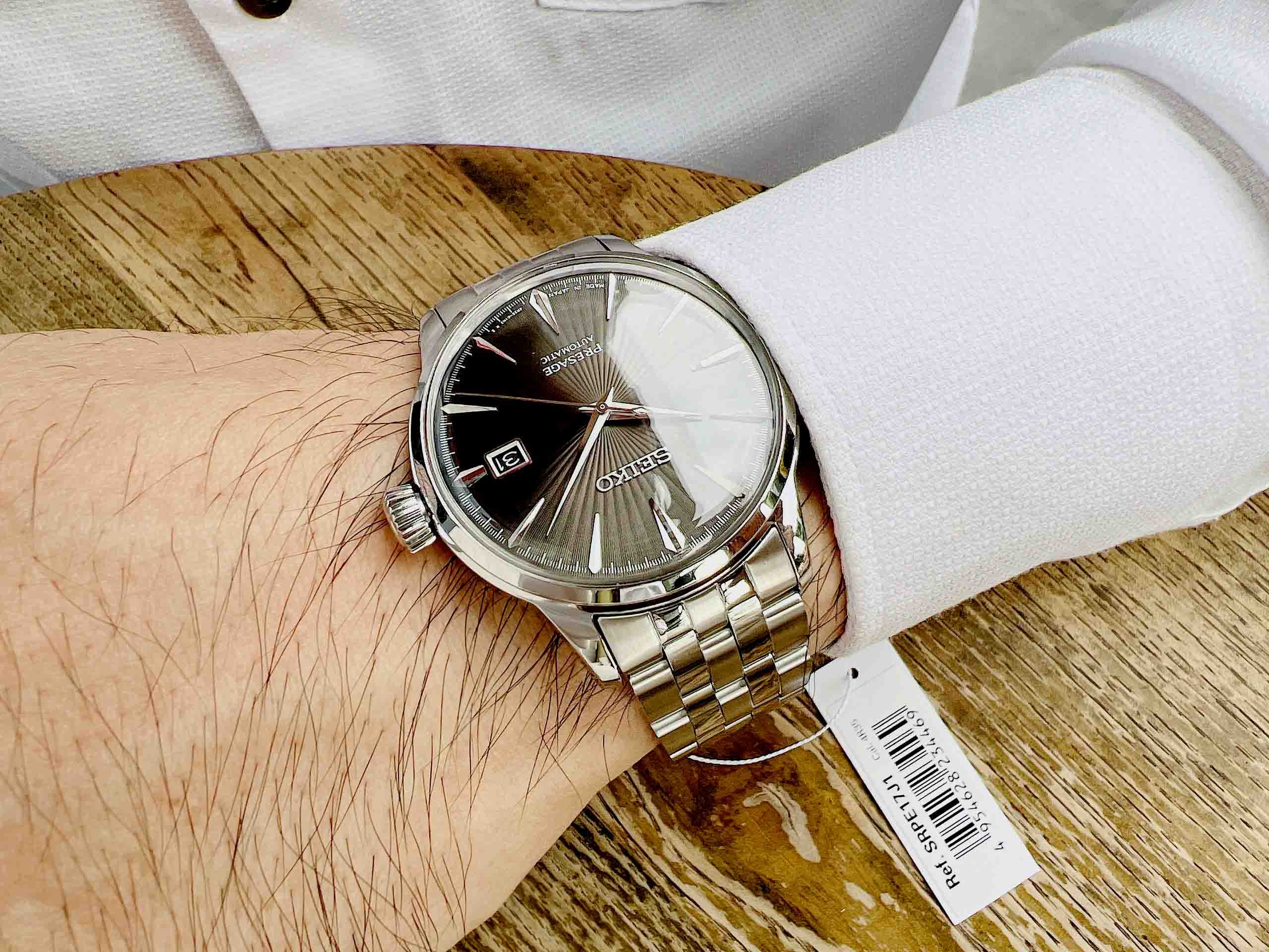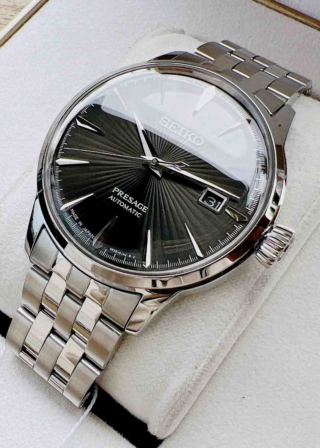 ▪Giống như các sản phẩm cùng dòng, SRPE17J1 nổi bần bật với dial chải tia cocktail cùng vòm kính cong quyến rũ.