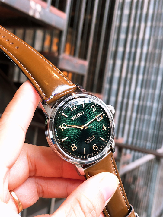 Nổi bật với Dial xanh lá tươi sáng được chải vân gợn sóng vòng cầu trùng phùng đan xen lên nhau
